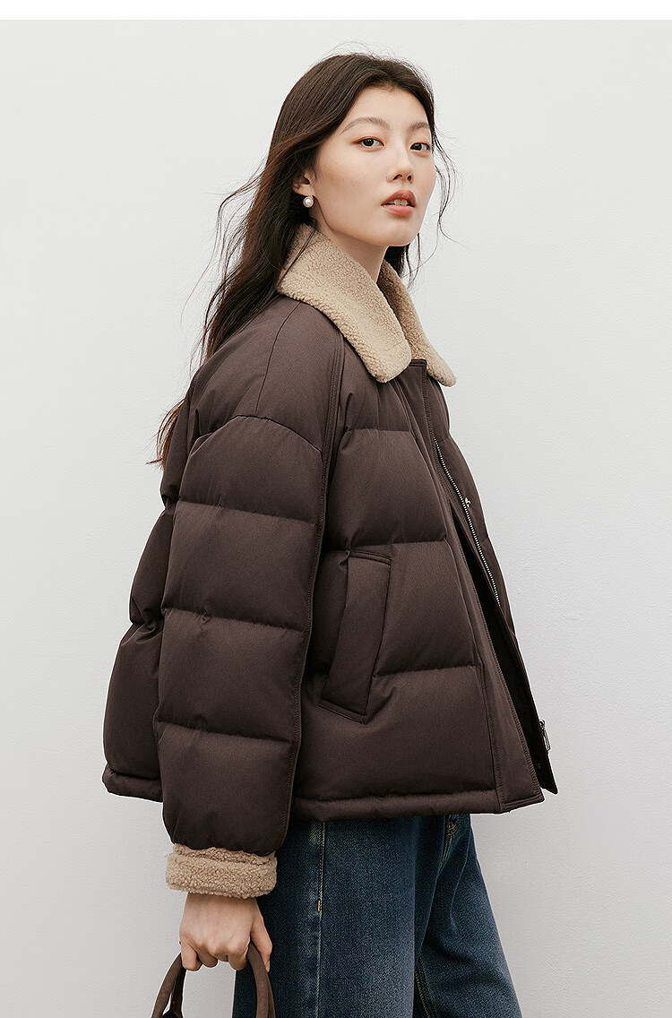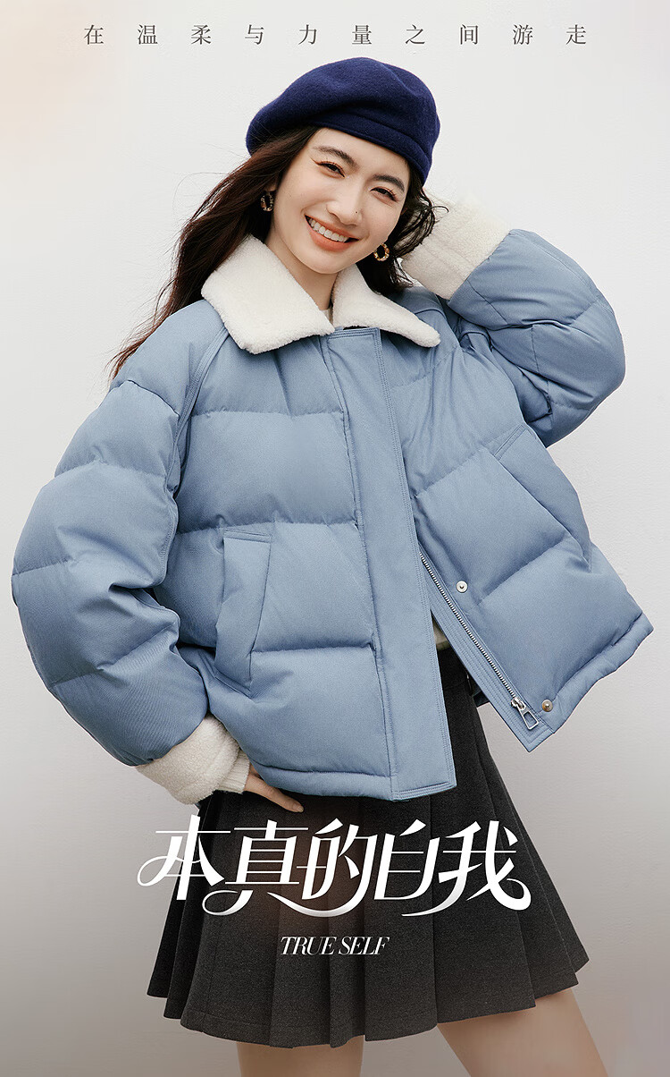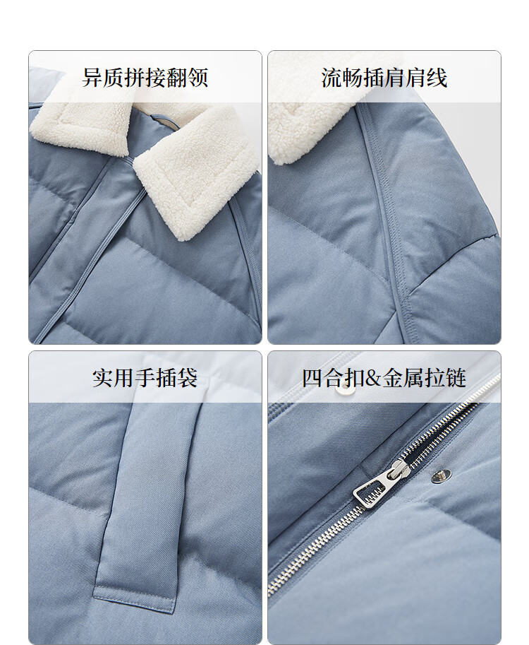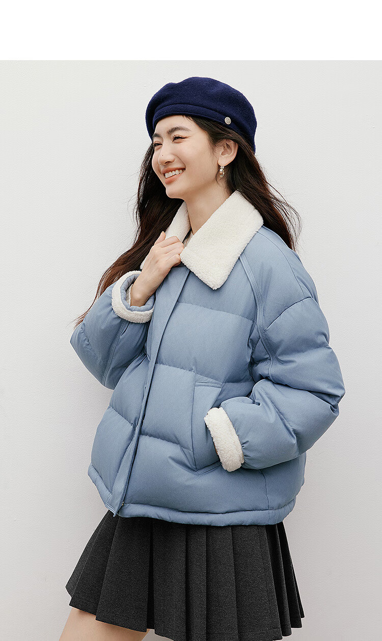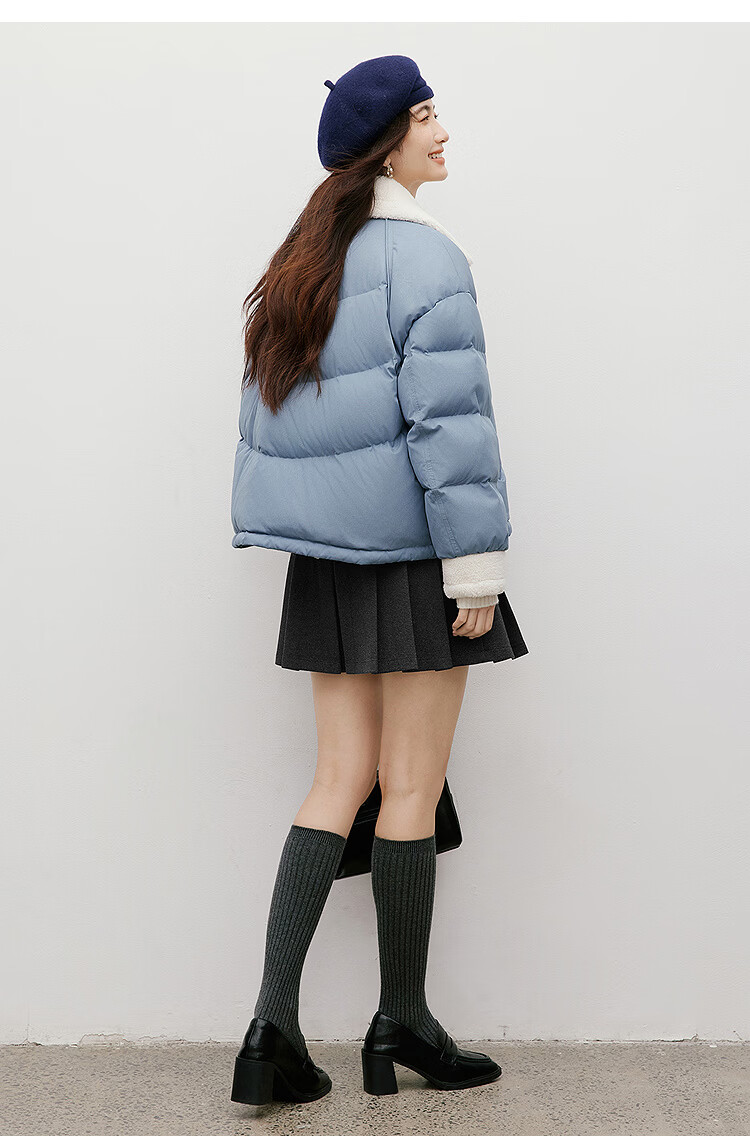 Red sleeve (hopeshow) Barn style down jacket 2025 winter new women's 90 white duck down splicing lapel loose warm short coat Ice fog blue 402 S