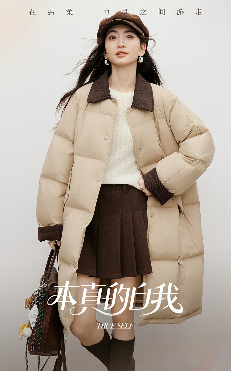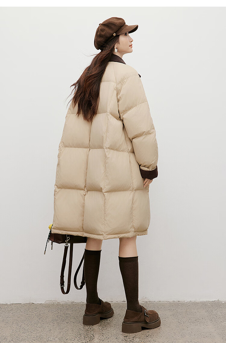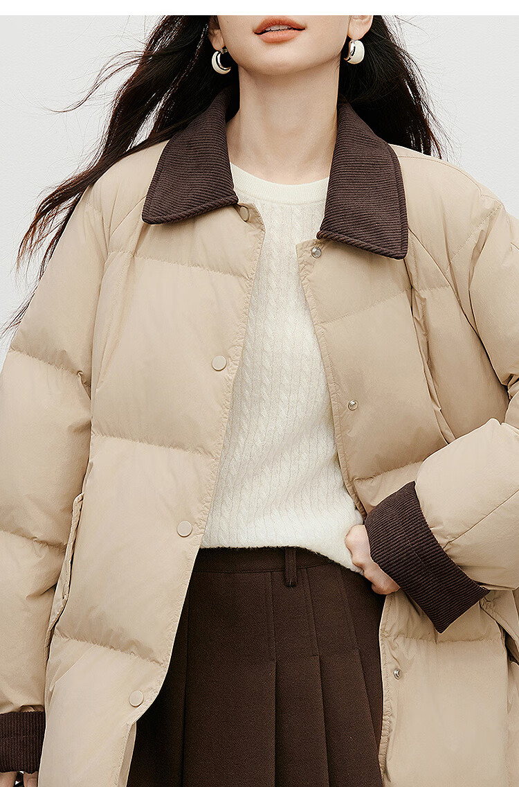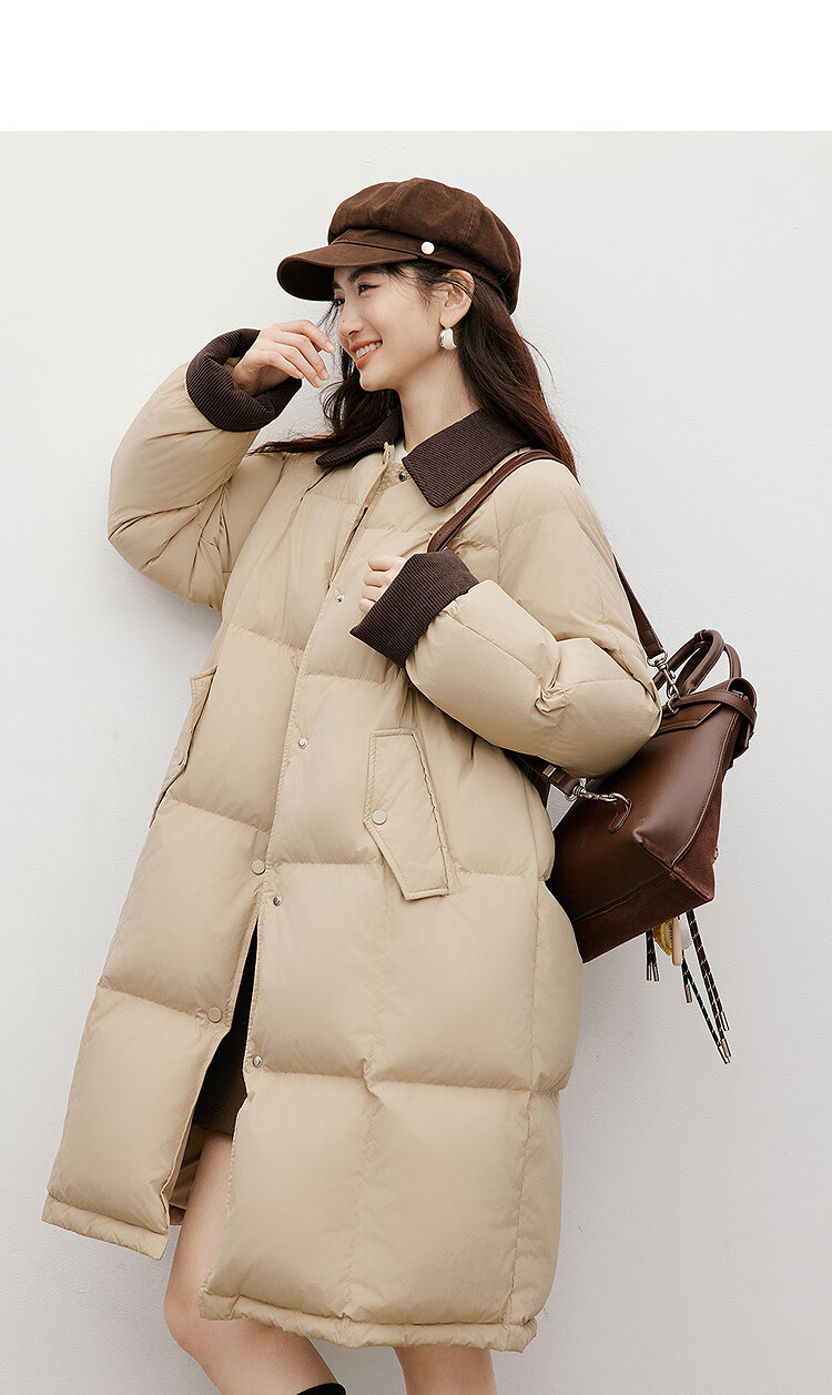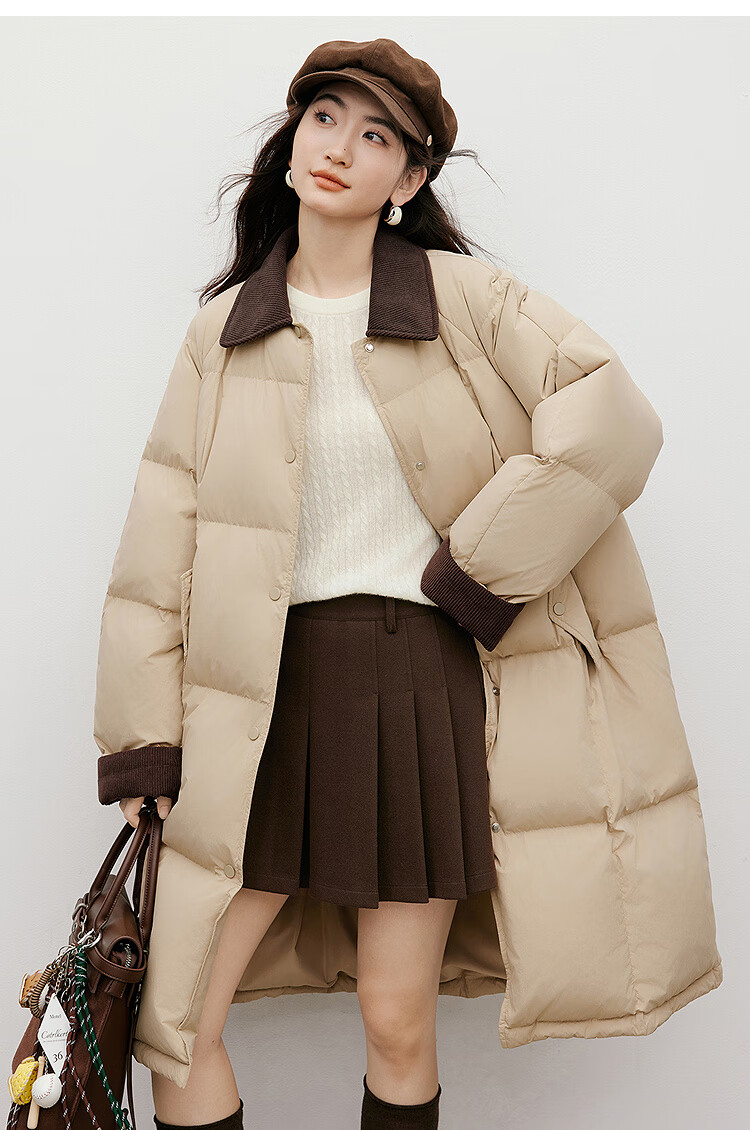 Red sleeves (hopeshow) super nice contrast collar down jacket 2025 winter new women's 90 white duck down Barn style casual mid-length coat roasted milk camel color 079 M