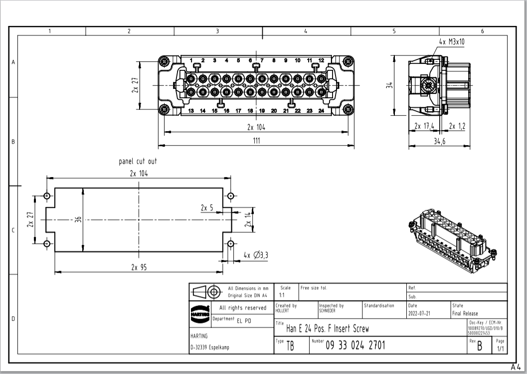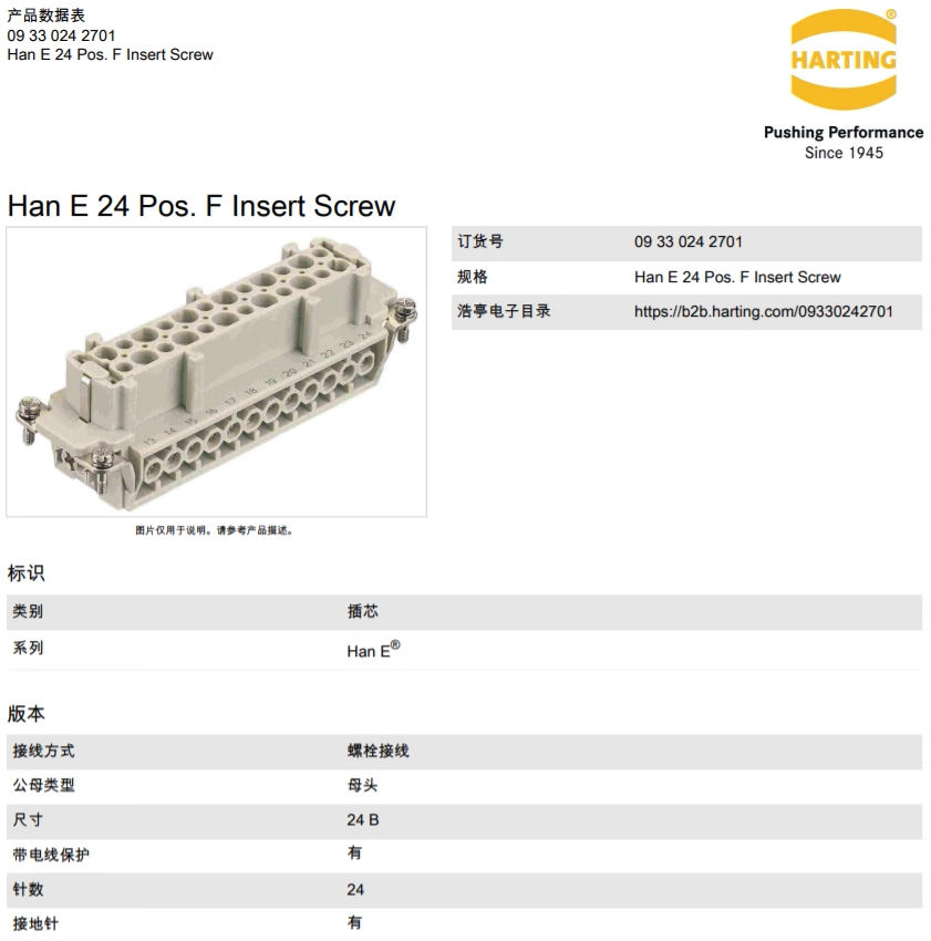 09330242701 HARTING Harding Heavy Duty Connector Current Terminal Female Head Insert Bolt Wiring Original Genuine