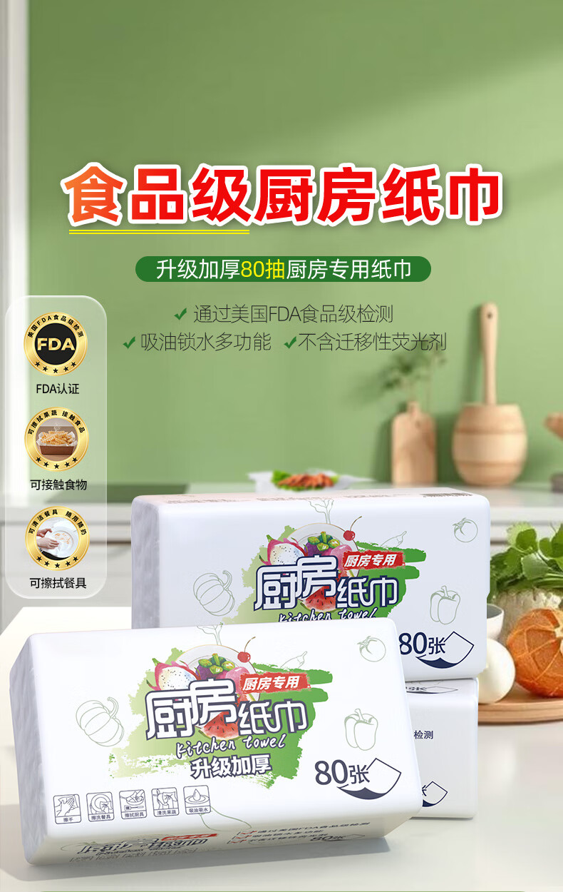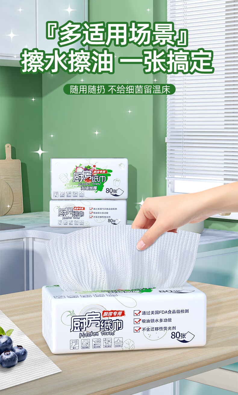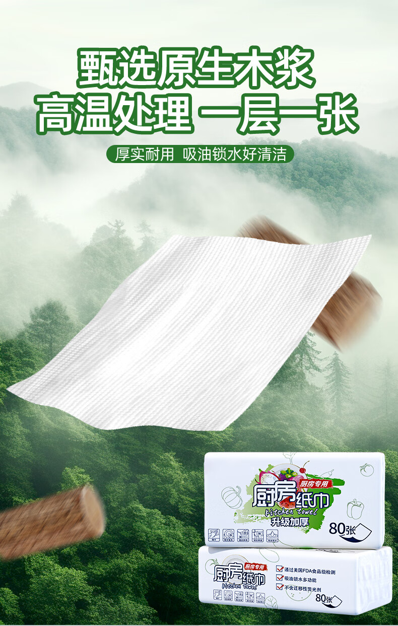 FDA food-grade kitchen tissue paper is thick and strong, oil-absorbing, water-absorbing and decontamination disposable removable 80-pack food-grade kitchen paper 1 layer 80-pack * 12 packs