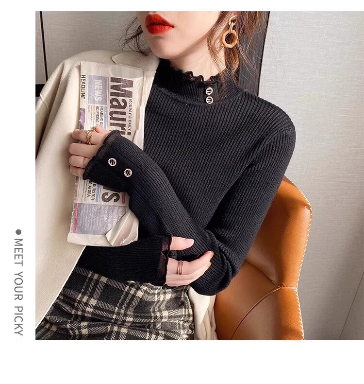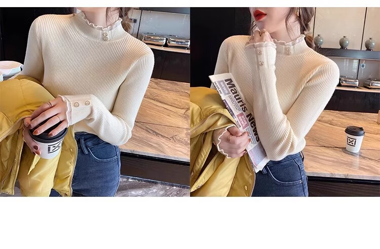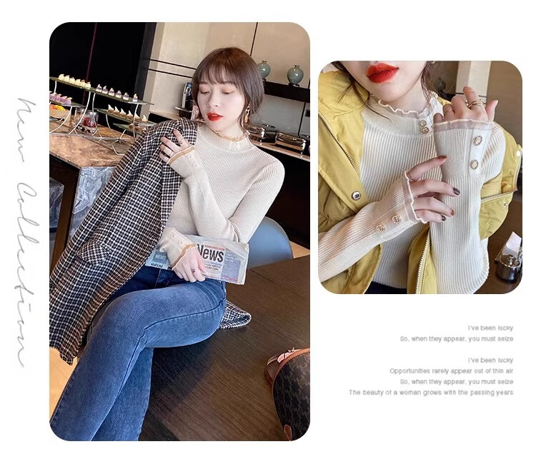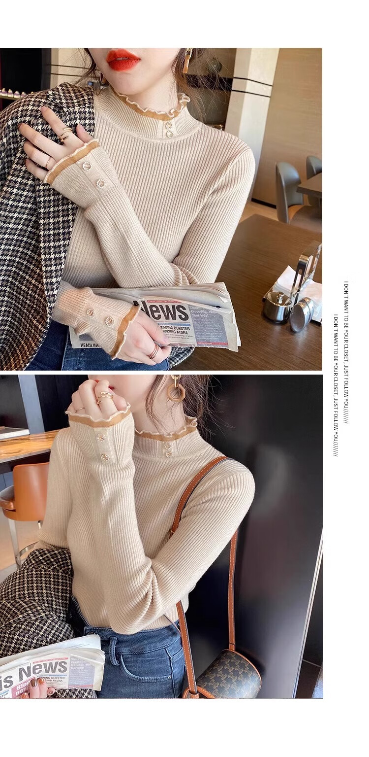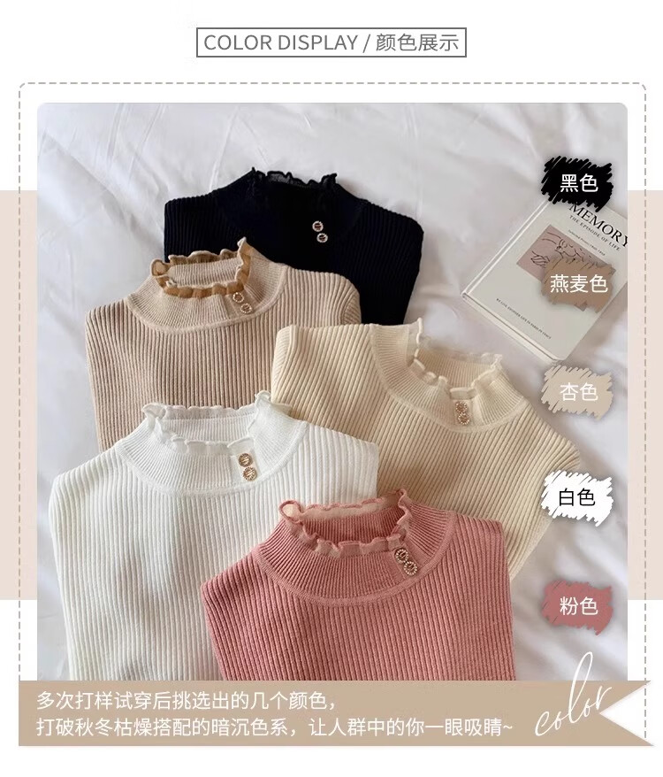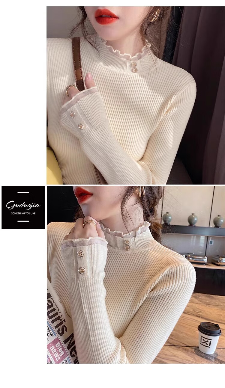 Lace half turtleneck bottoming shirt for women with knitted sweater tops slimming fungus pullover sweater MF92 apricot L Weight recommendation 110-128 pounds