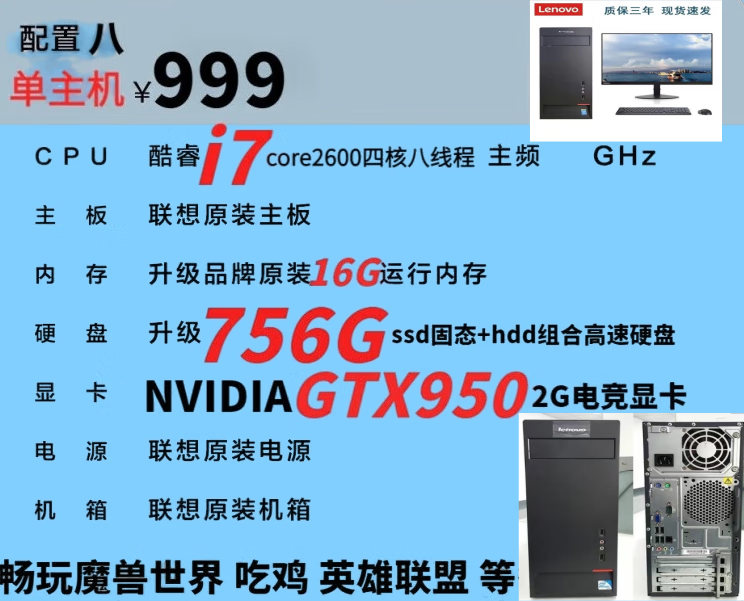 Lenovo (lenovo) desktop i7 independent graphics game enterprise commercial office home design editing Lenovo second-hand desktop computer complete machine with eight Core i716G+756G+GTX950 single/host 9 new