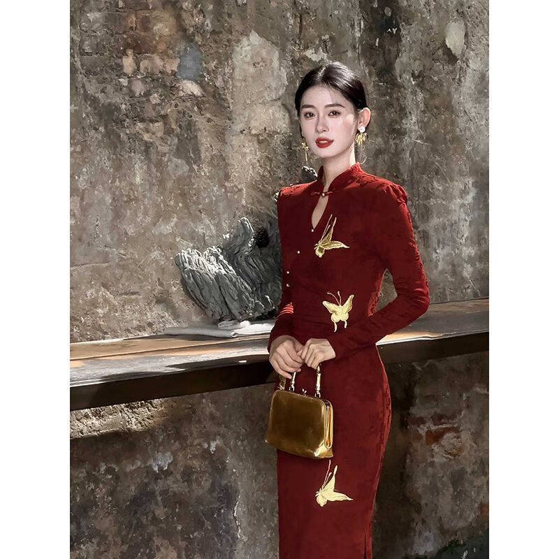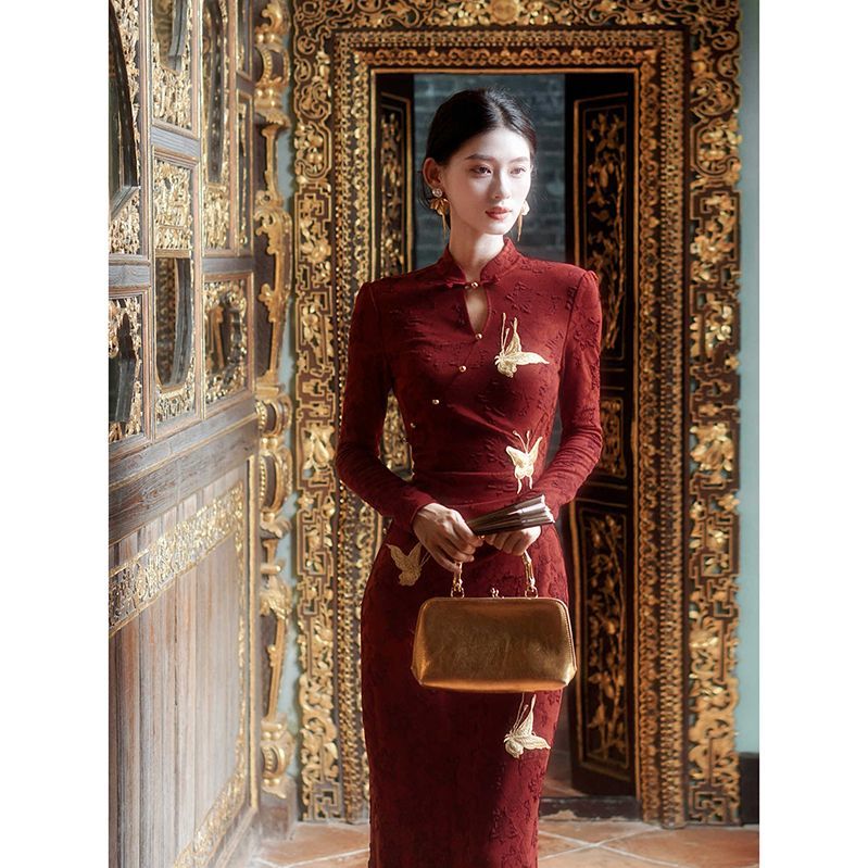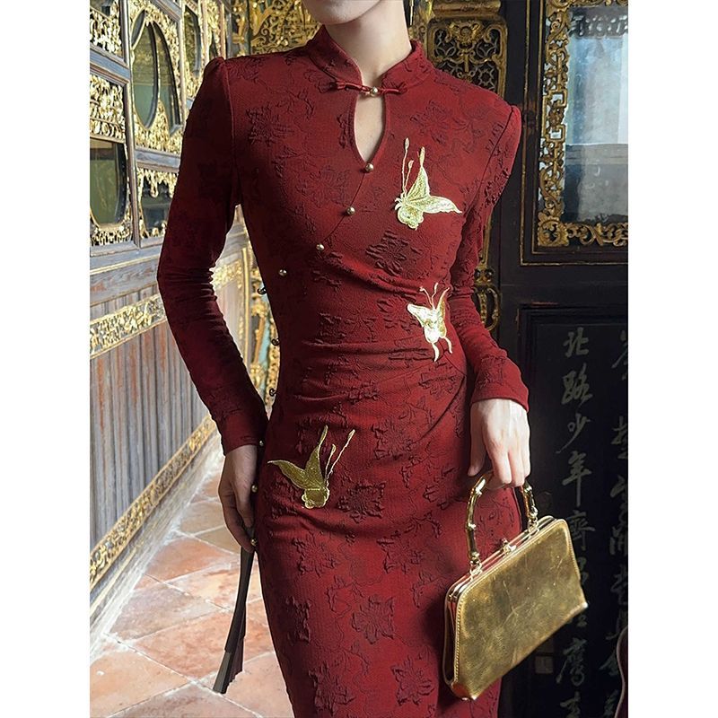 Jialong Mingxiu 2025 red new Chinese style cheongsam women's early autumn long-sleeved jacquard knitted waist dress picture color L