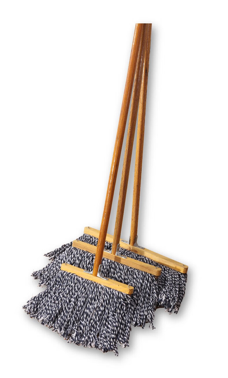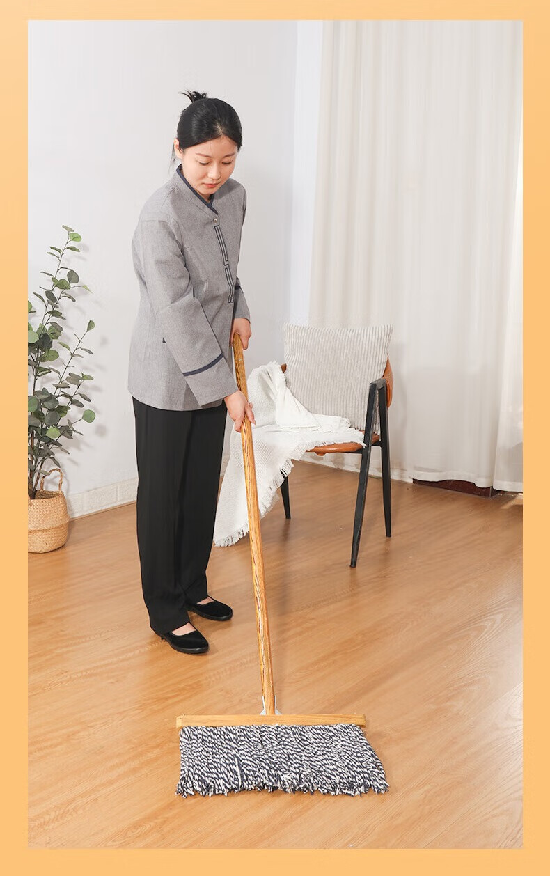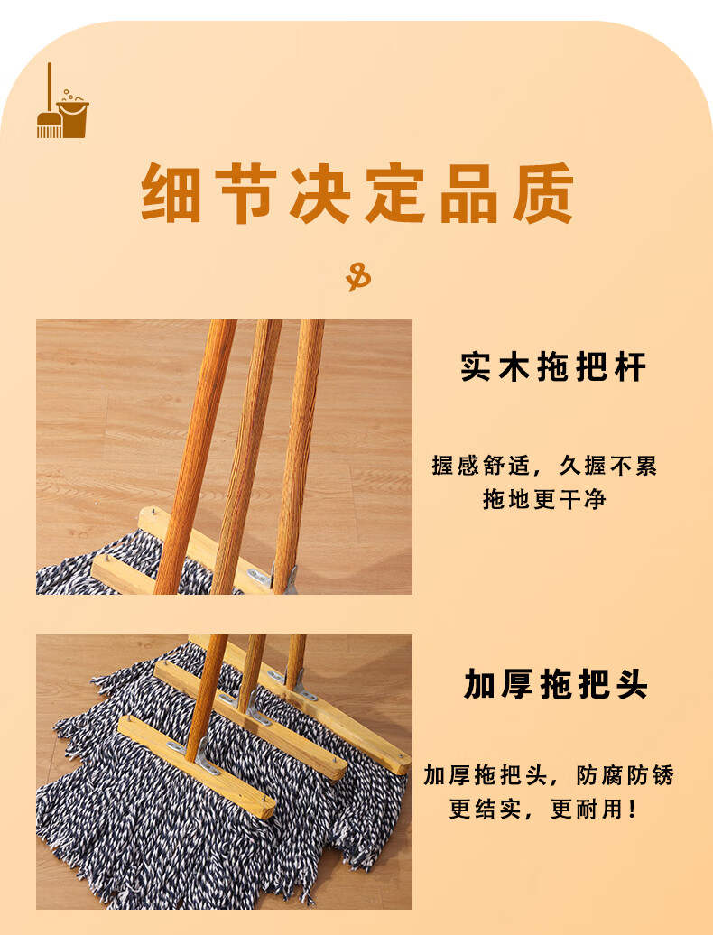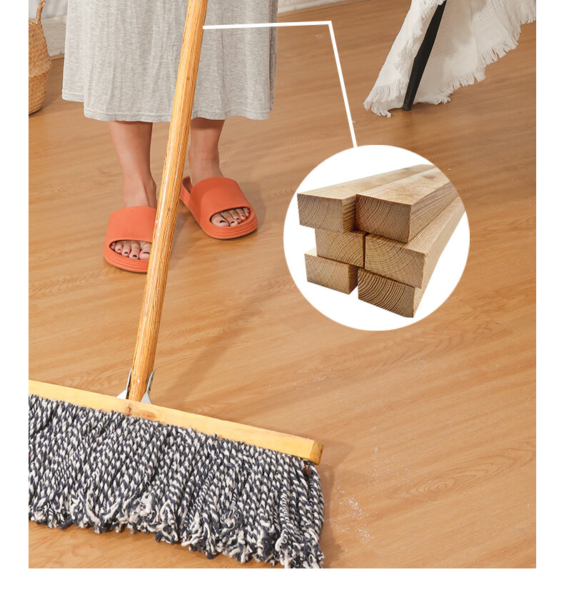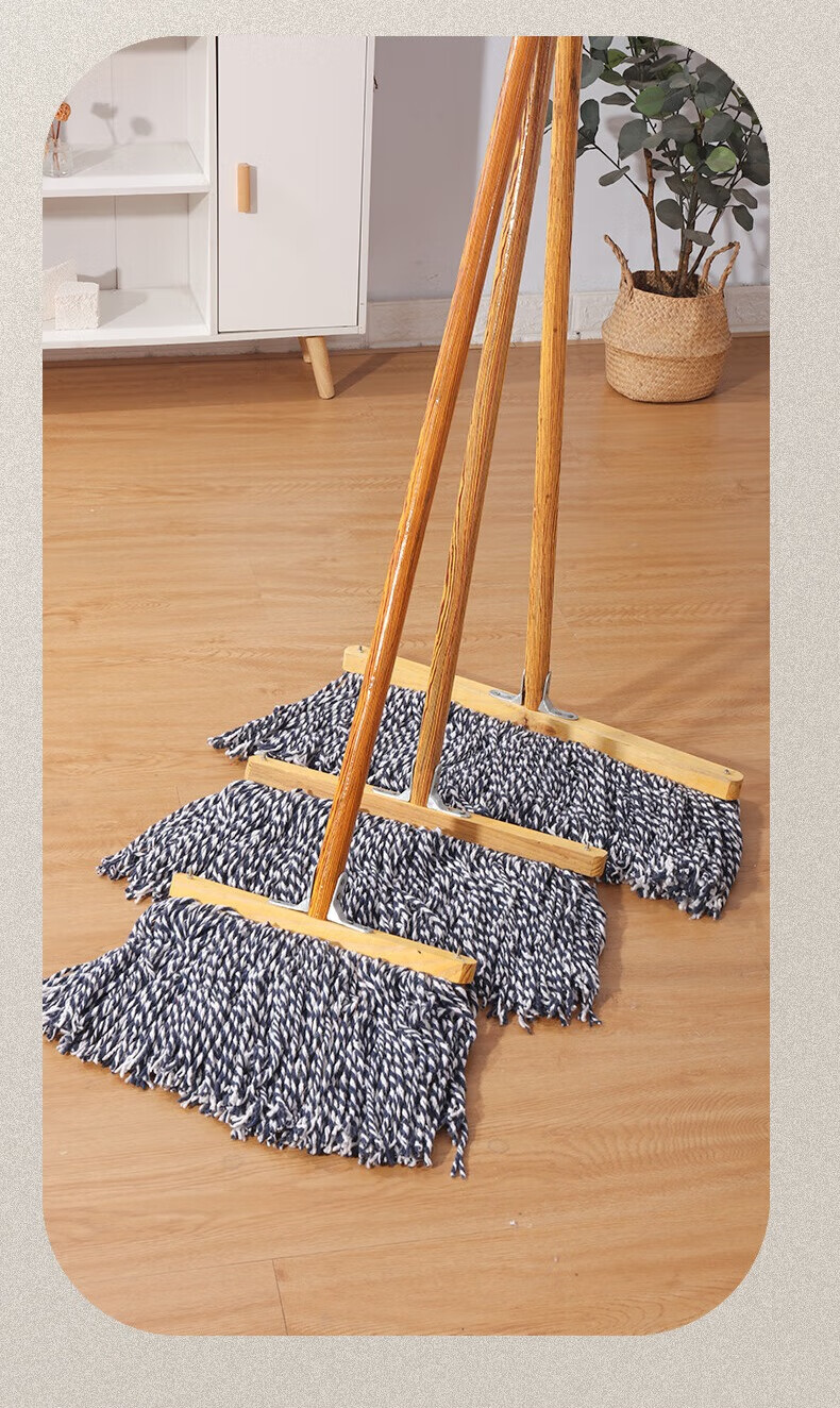 Wood pole industrial mop, old-fashioned round head mop, absorbent cotton thread, wet and dry public toilet cleaning factory supermarket, white line enlarged round head mop
