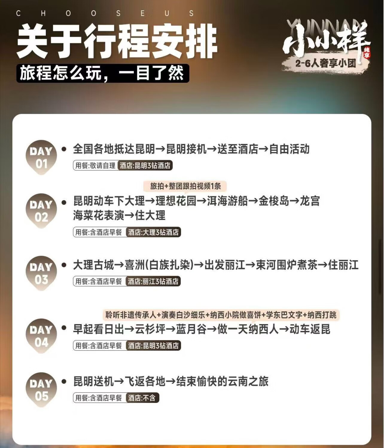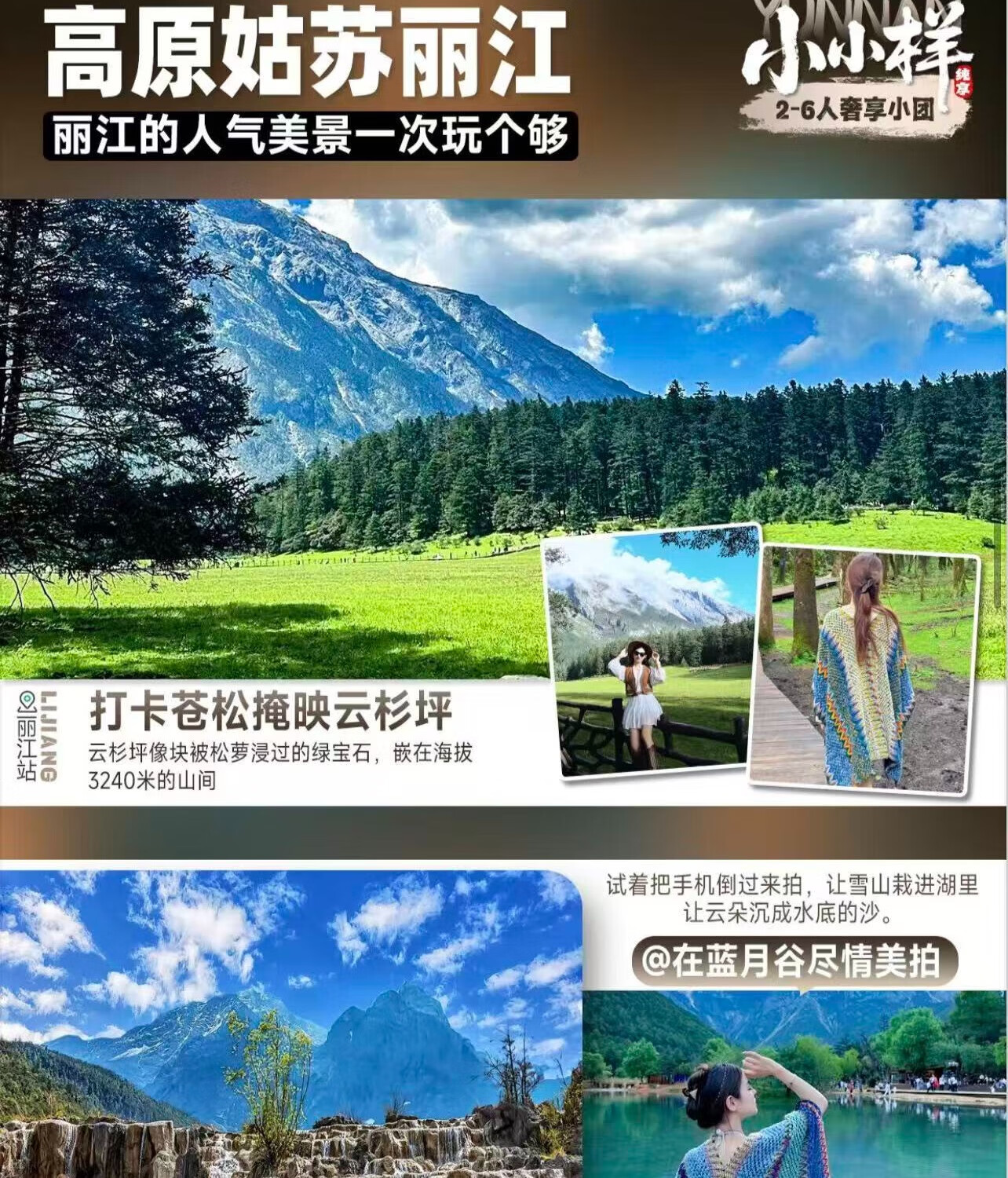 Car small group really pure fun mini 2-6 people pure fun small group Yunnan travel丨Pure fun without shopping +0 self-expense Kunming+Dali+Lijiang丨Shangri-La丨Lugu Lake丨Banna panoramic view (three diamonds) Kunming, Dali, Lijiang 6 people small group single price Off-season price 2 people minimum order (starting and ending in Kunming) Group departures every day