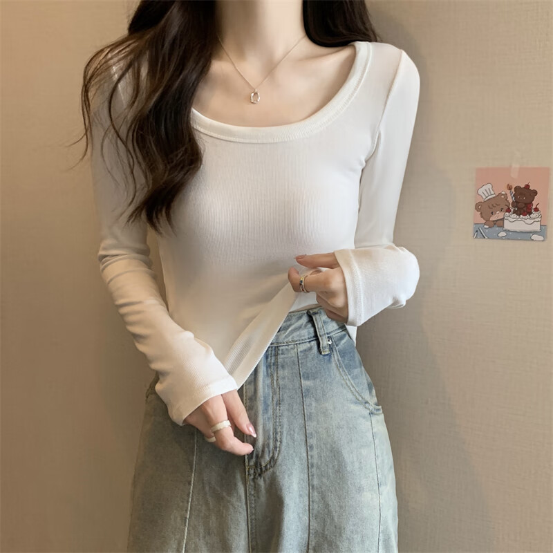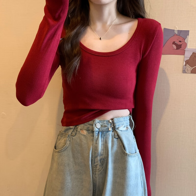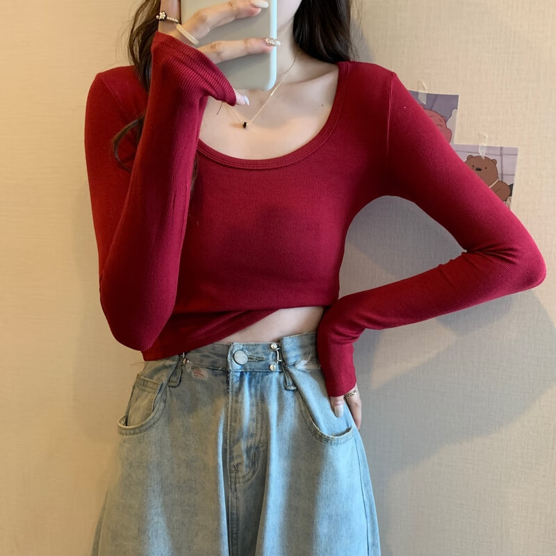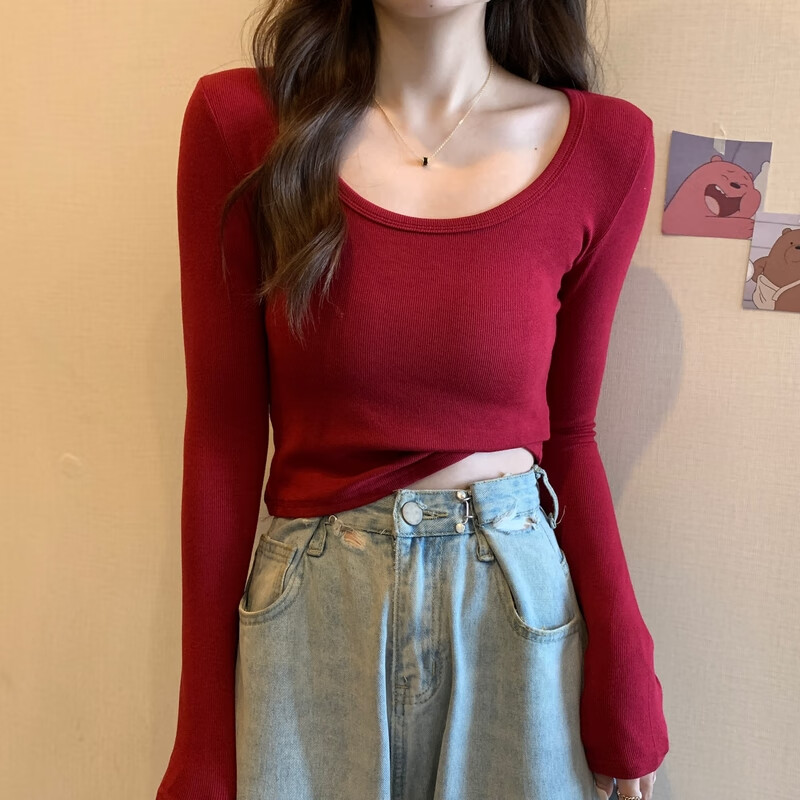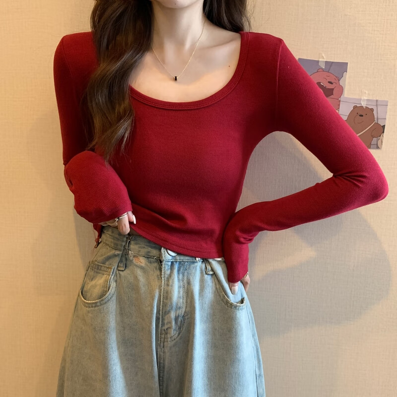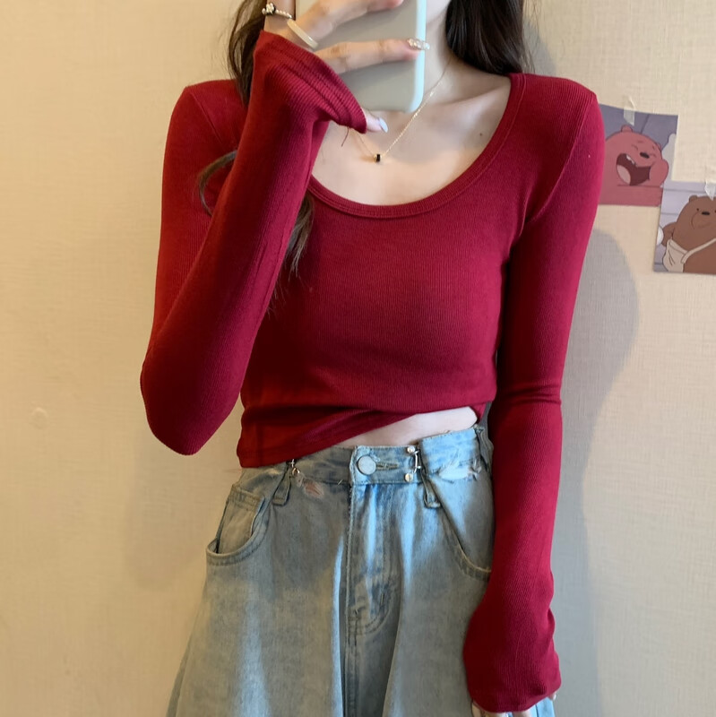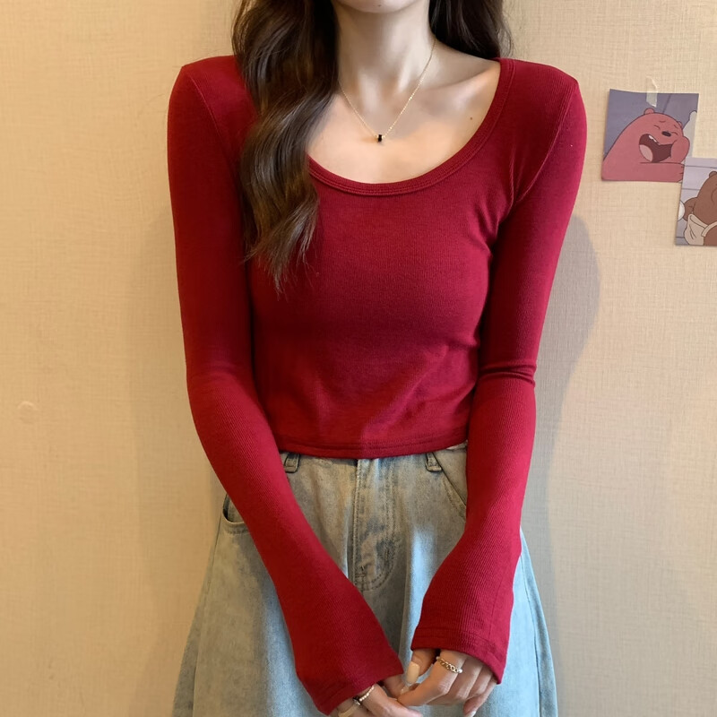 Pierre Cardin red knitted bottoming shirt for women autumn large neckline long-sleeved cotton top sexy u-neck right shoulder ribbed cotton inner t-shirt red S