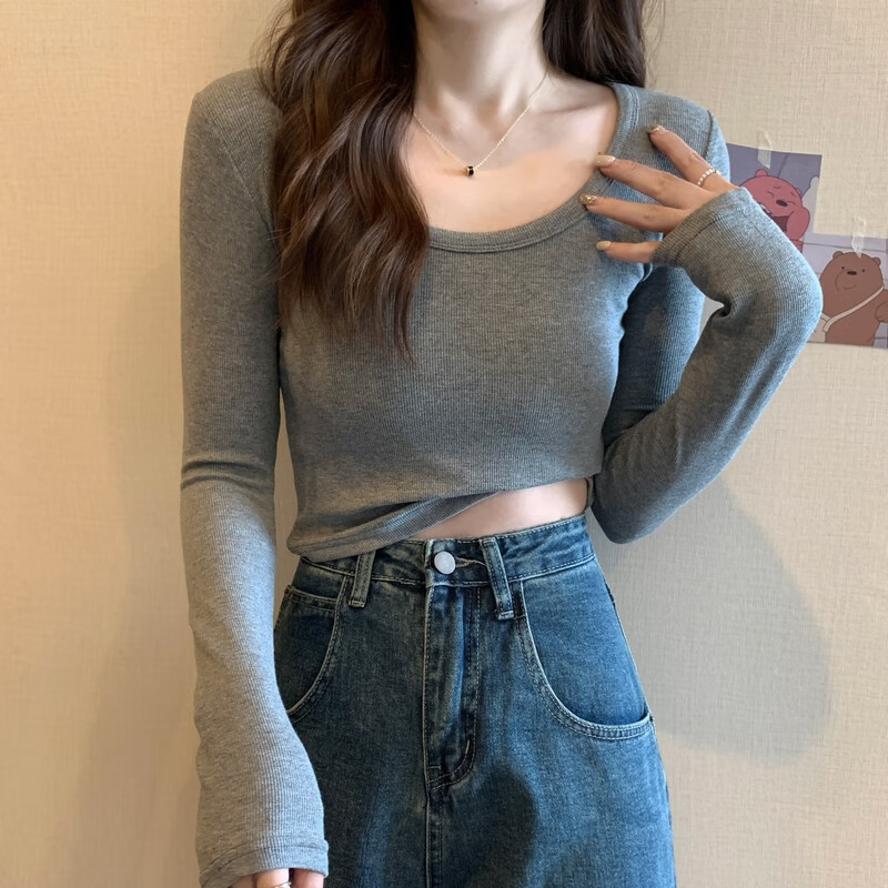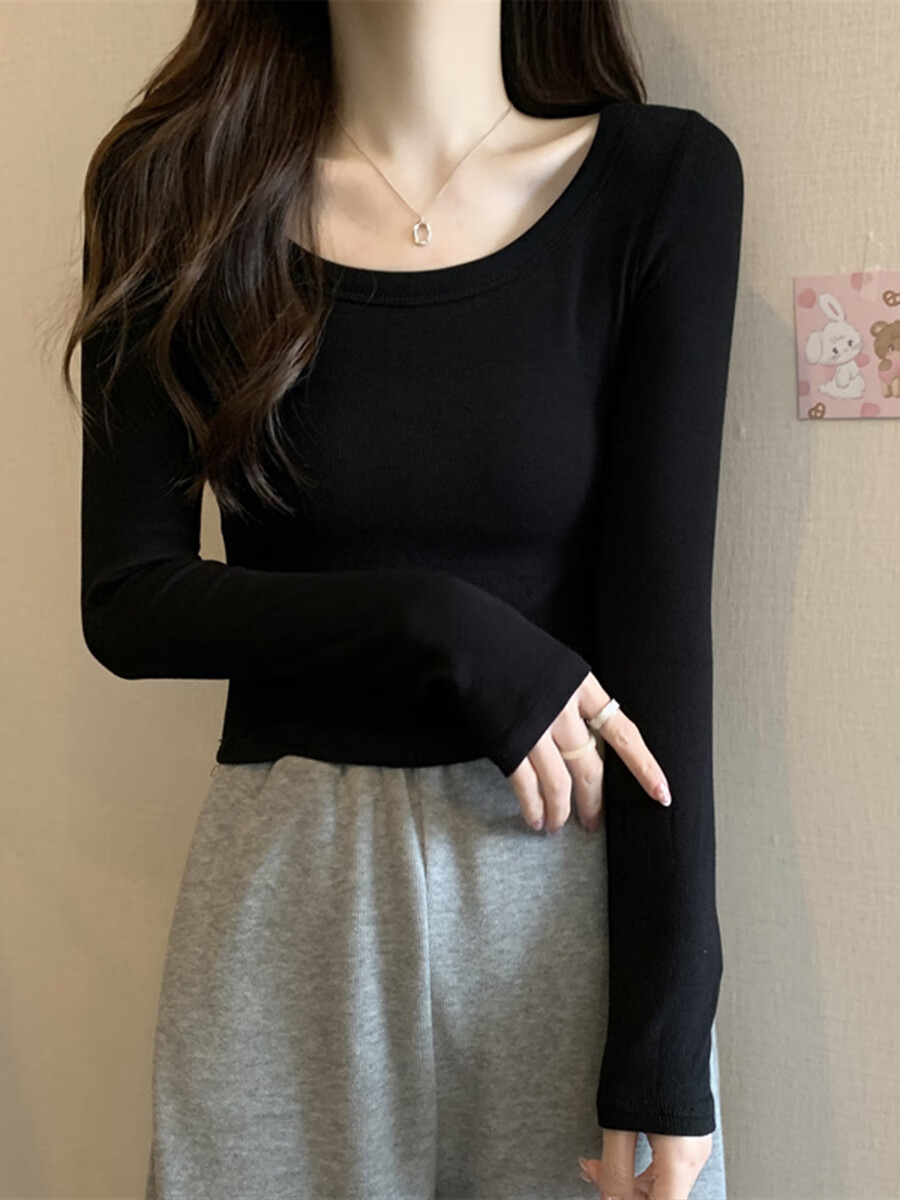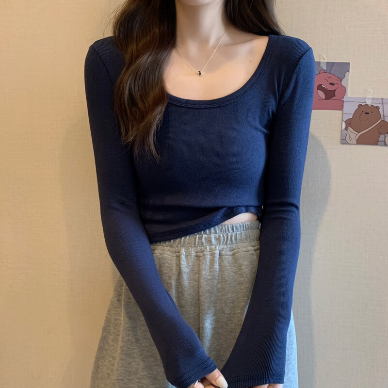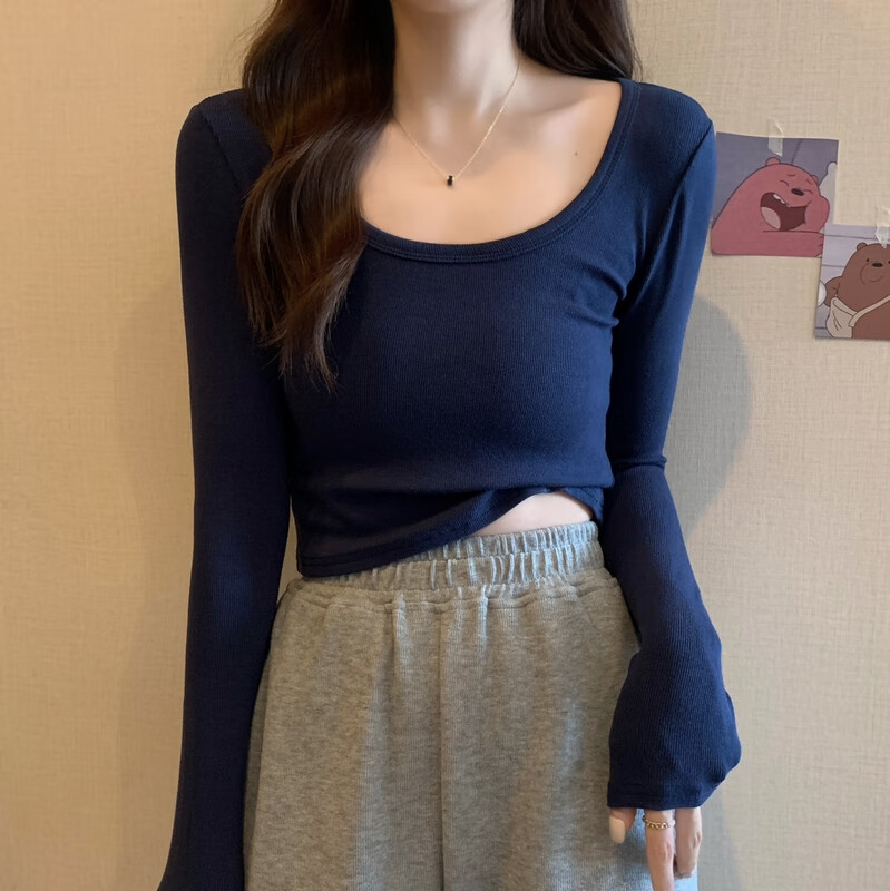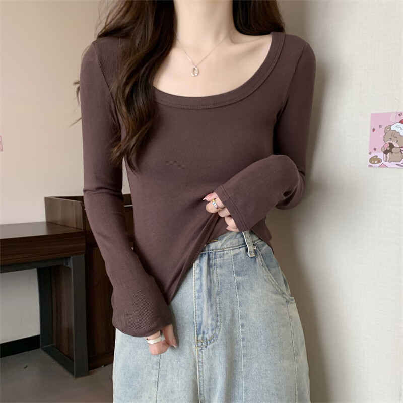 Pierre Cardin red knitted bottoming shirt for women autumn large neckline long-sleeved cotton top sexy u-neck right shoulder ribbed cotton inner t-shirt red S