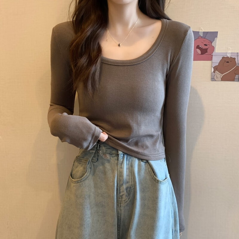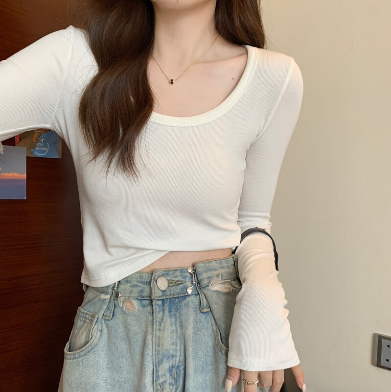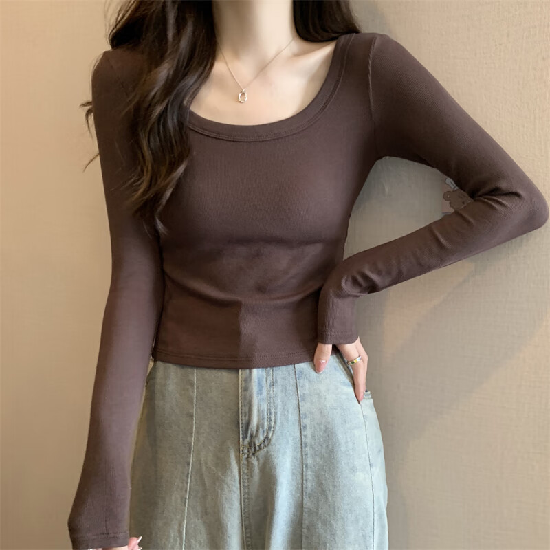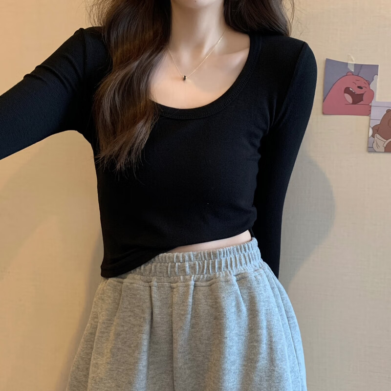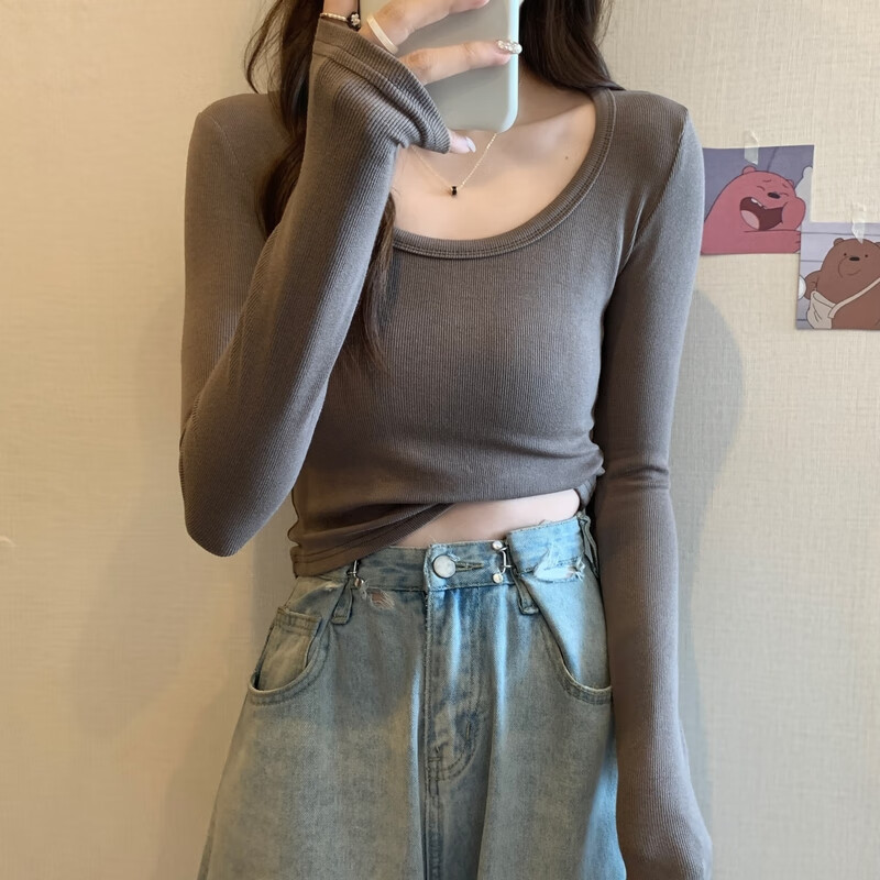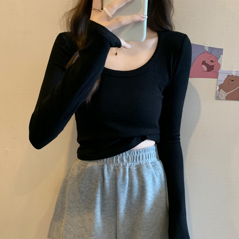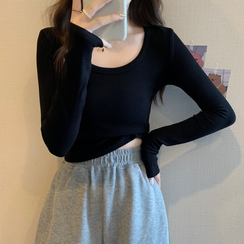 Pierre Cardin red knitted bottoming shirt for women autumn large neckline long-sleeved cotton top sexy u-neck right shoulder ribbed cotton inner t-shirt red S
