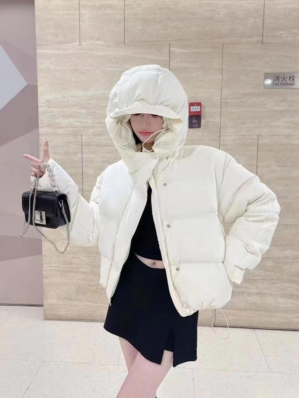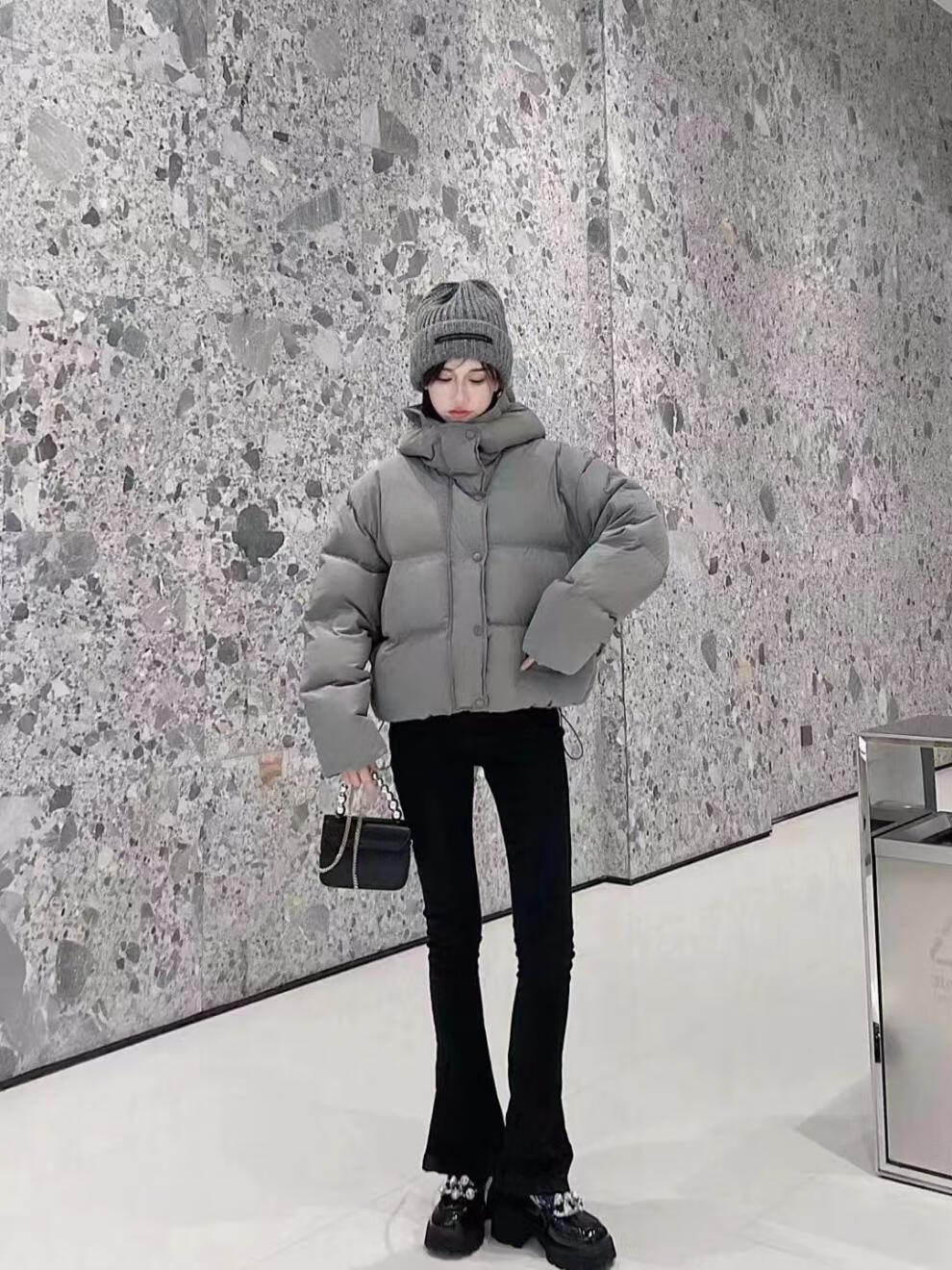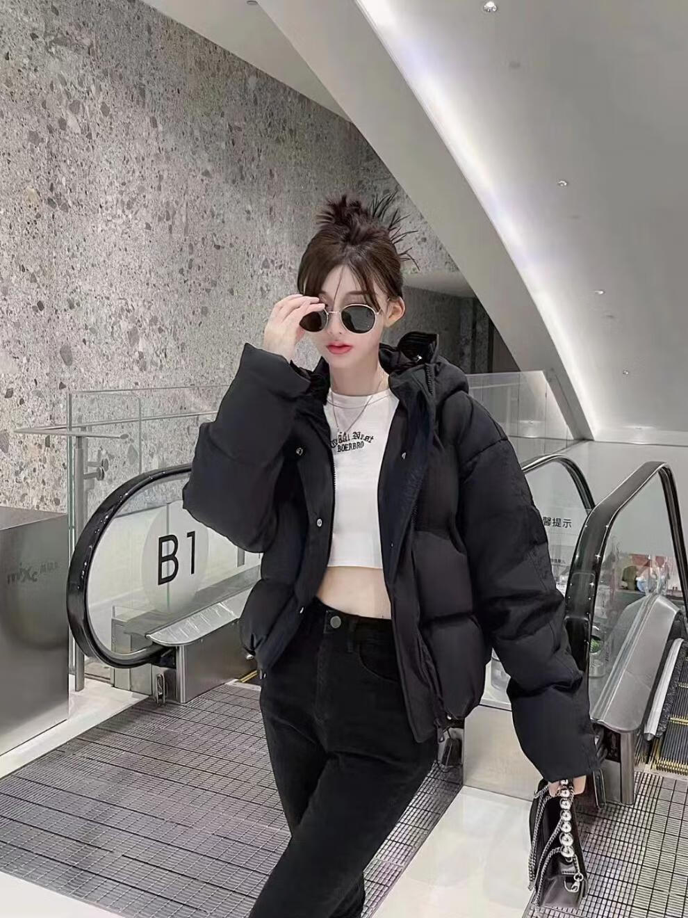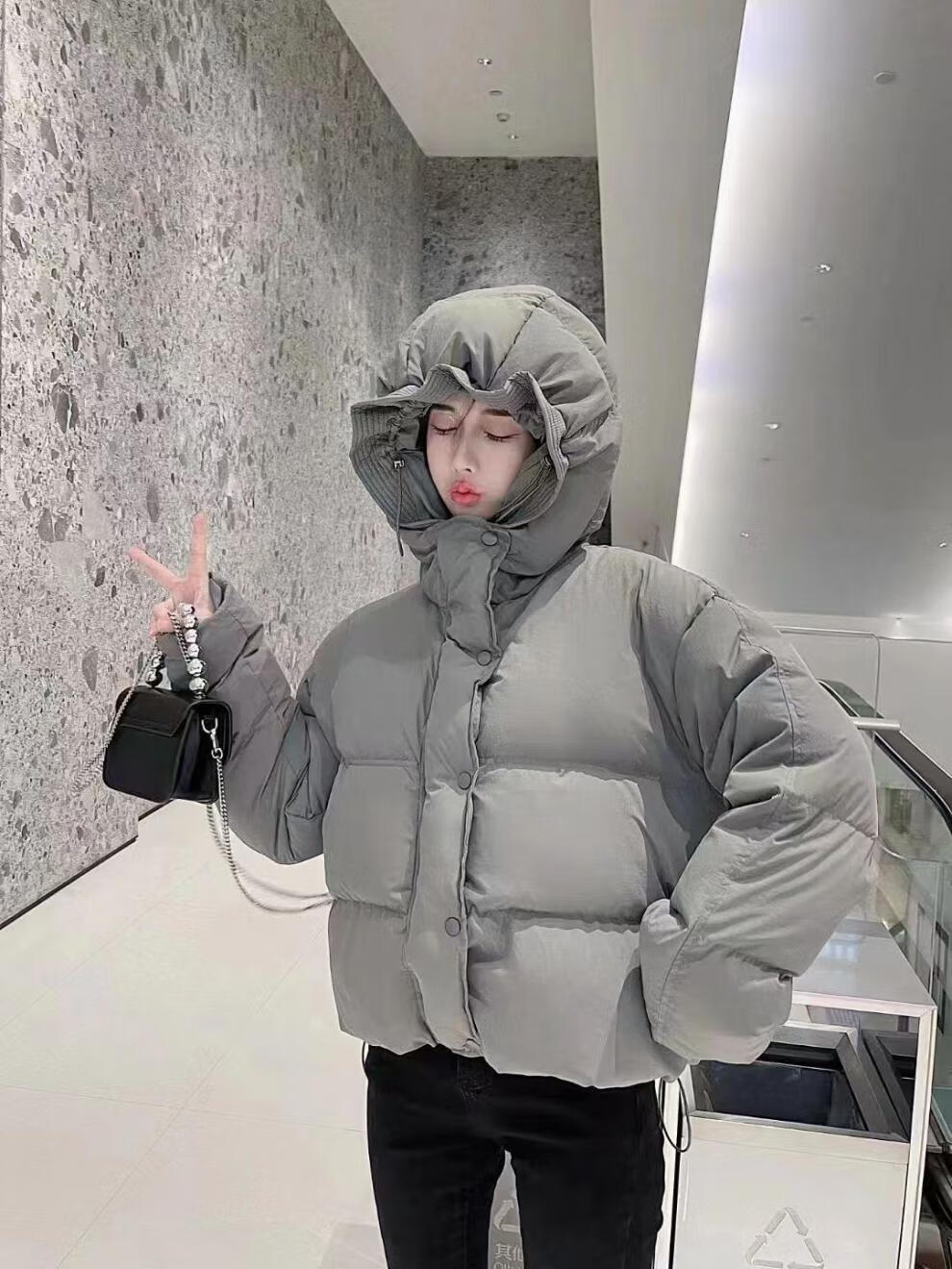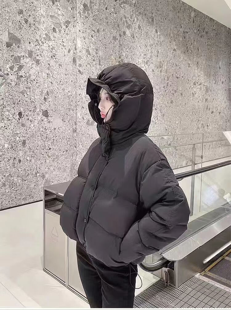 Flower bud temperament suit for women 2025 winter loose hooded thickened short bread suit black S 90-120 catties