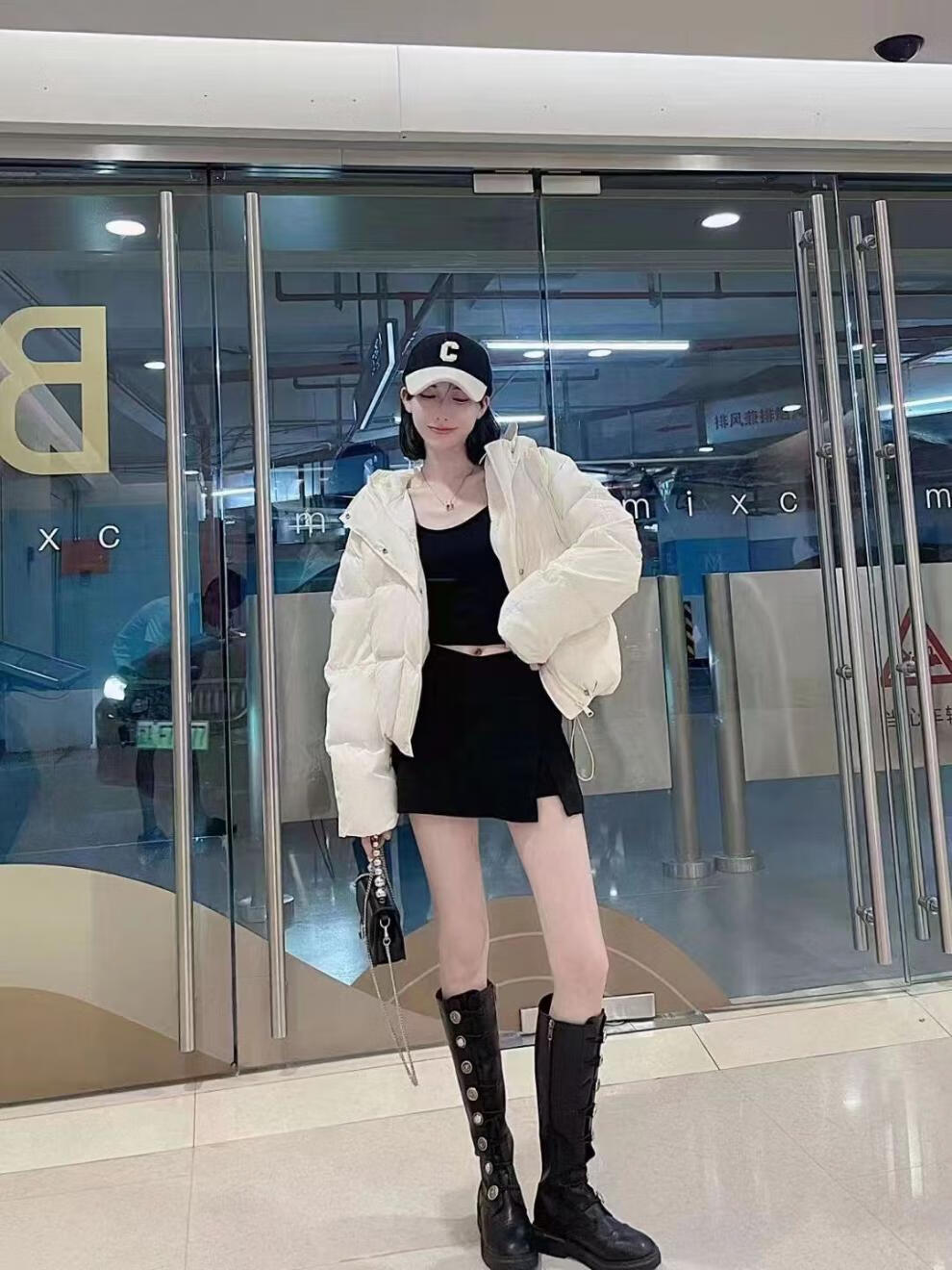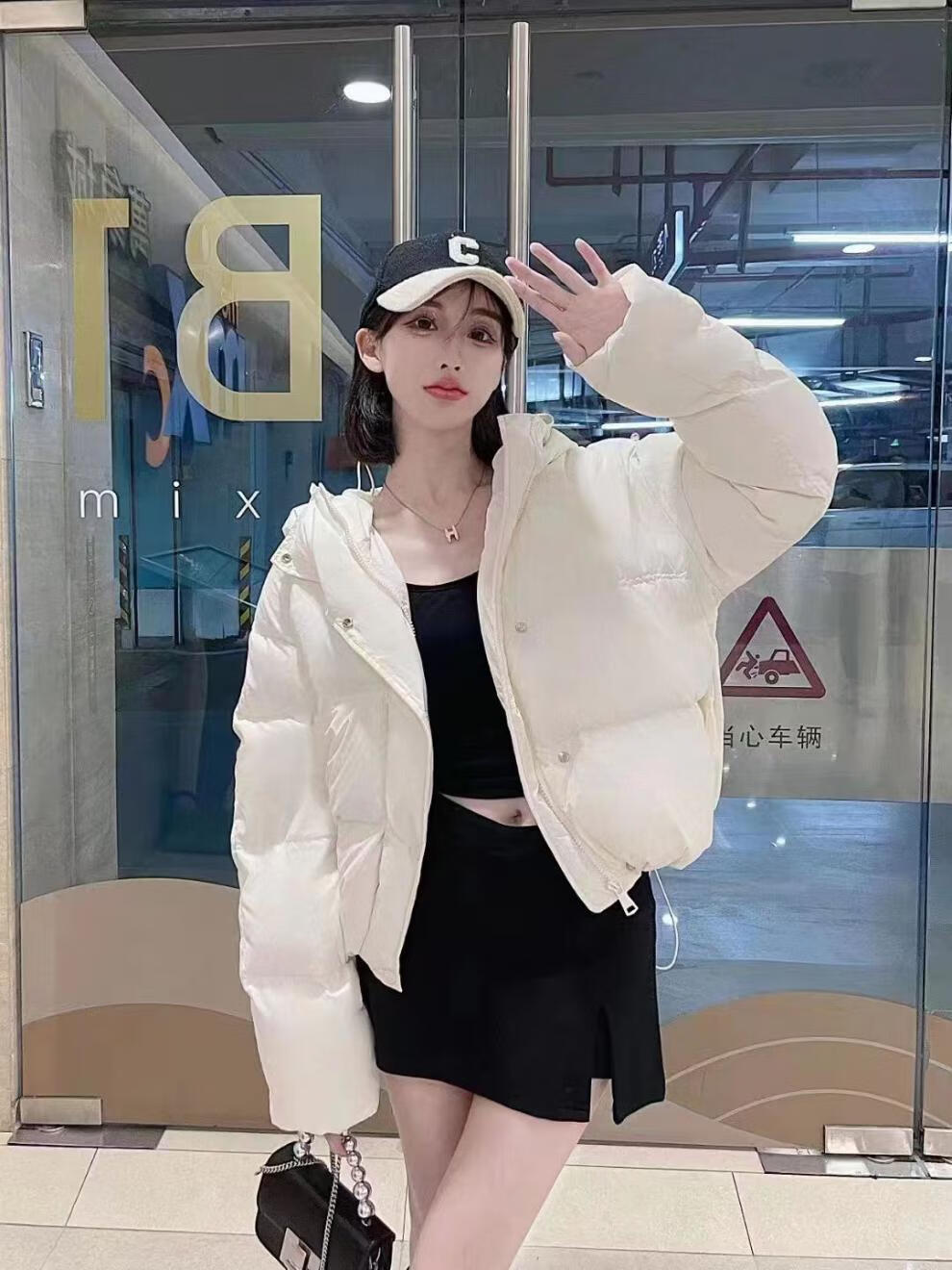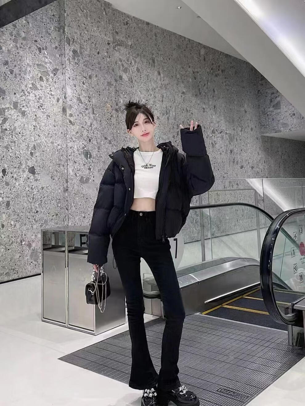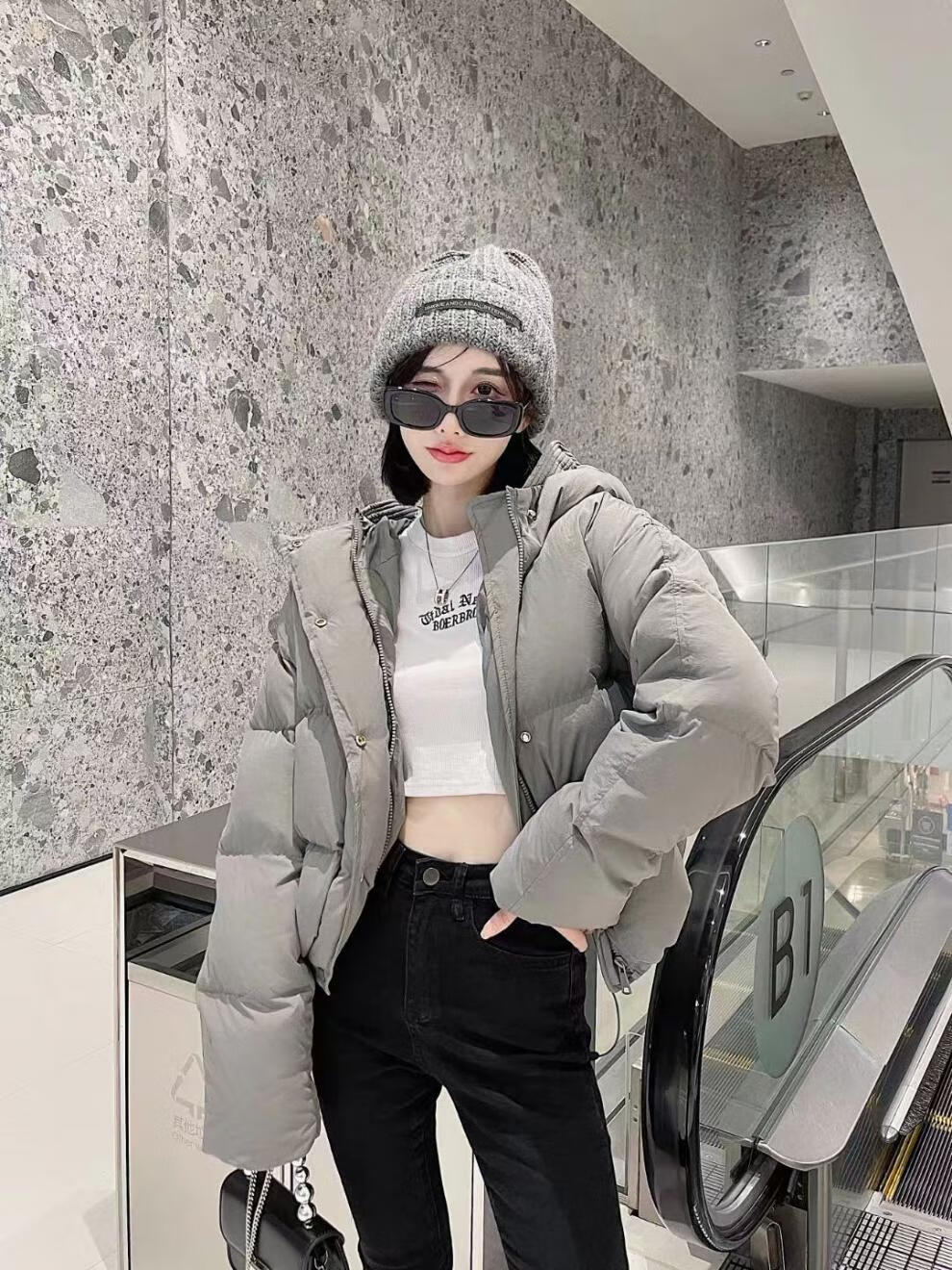 Flower bud temperament suit for women 2025 winter loose hooded thickened short bread suit black S 90-120 catties
