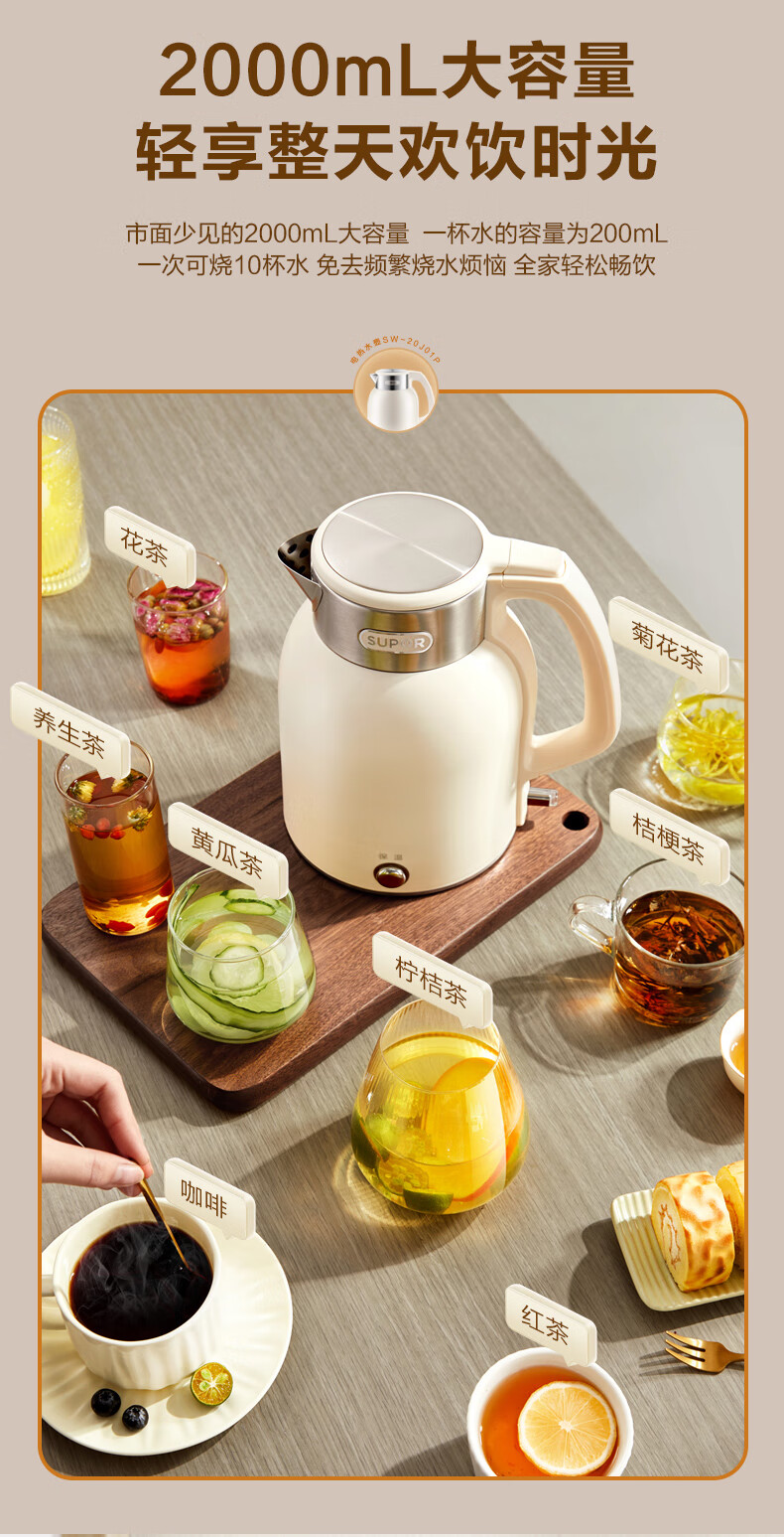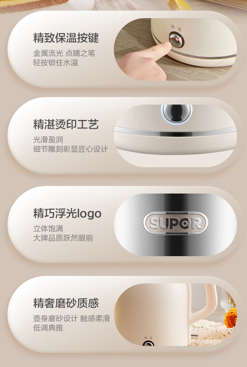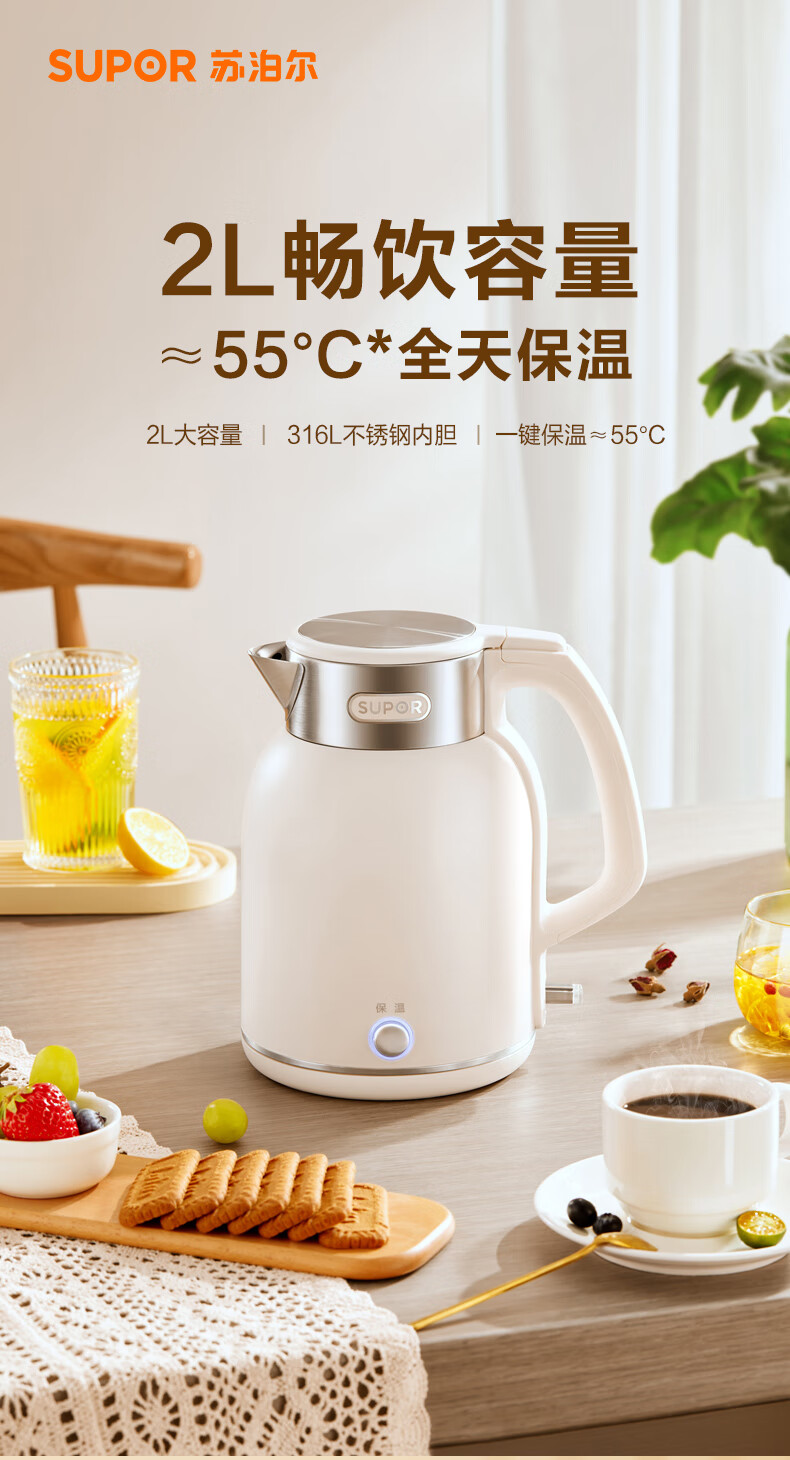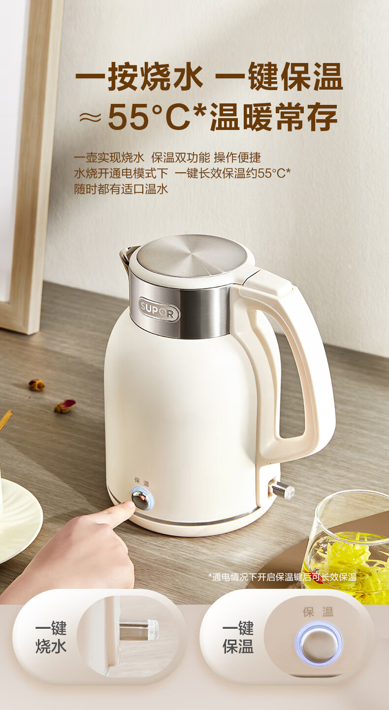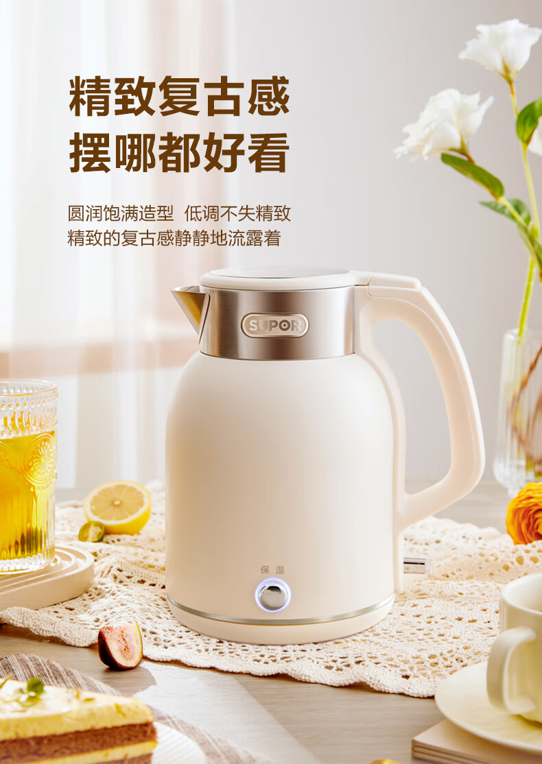 SUPOR constant temperature electric kettle household stainless steel large capacity integrated boiling kettle kettle heat preservation beige large capacity precise temperature control 2L