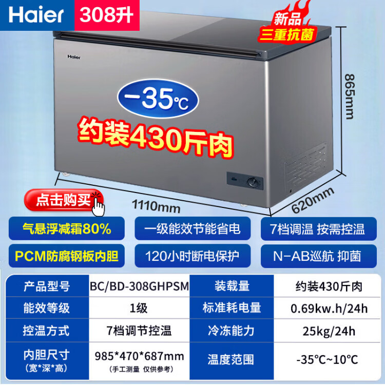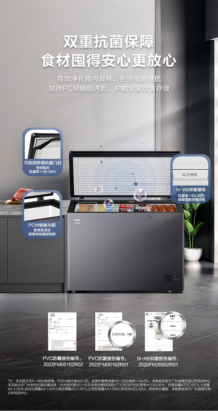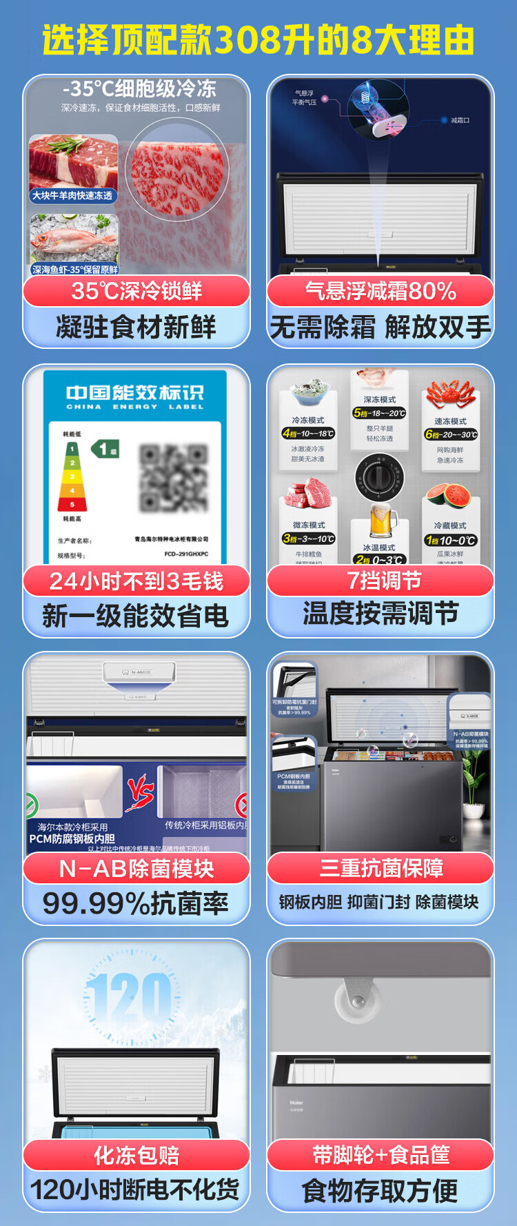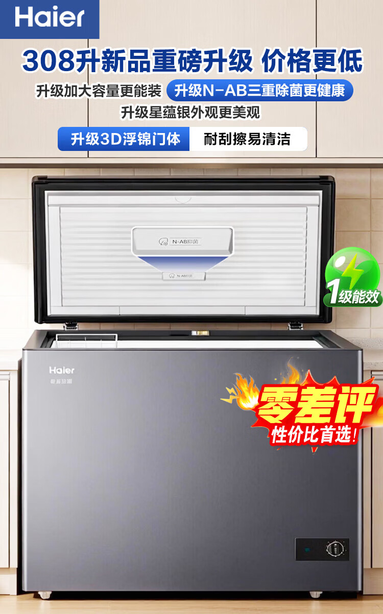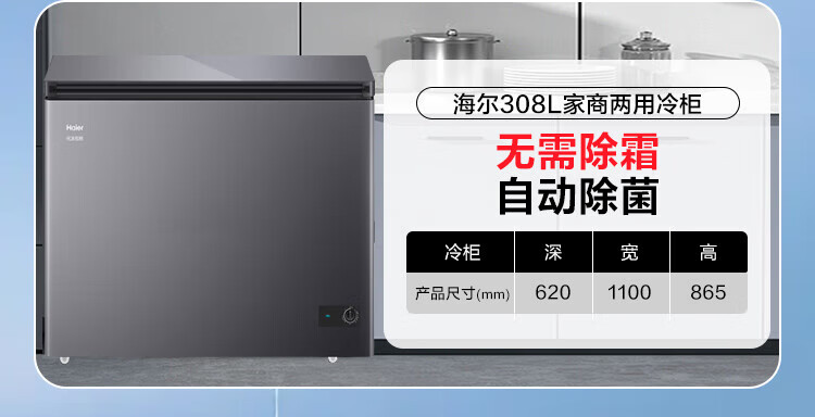 Haier minus 35 degrees quick-freezing ultra-low temperature freezer for household use without frequent defrosting, new level of energy efficiency and power saving, 300 liters large capacity full freezer, horizontal freezer subsidy 308 liters, newly upgraded, 1.1 meters long, 436 pounds frozen, power saving + sterilization
