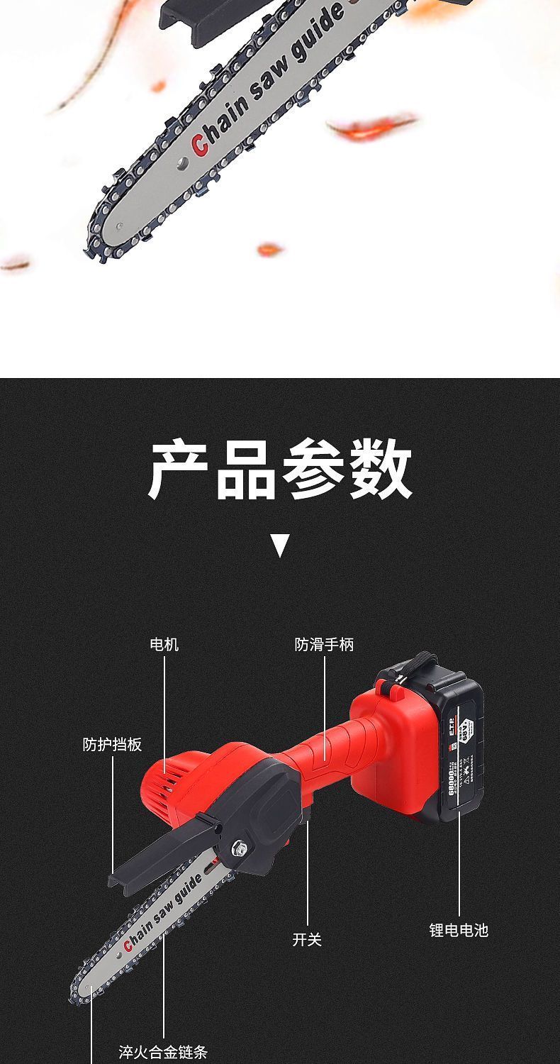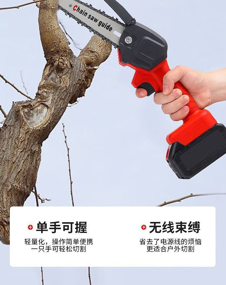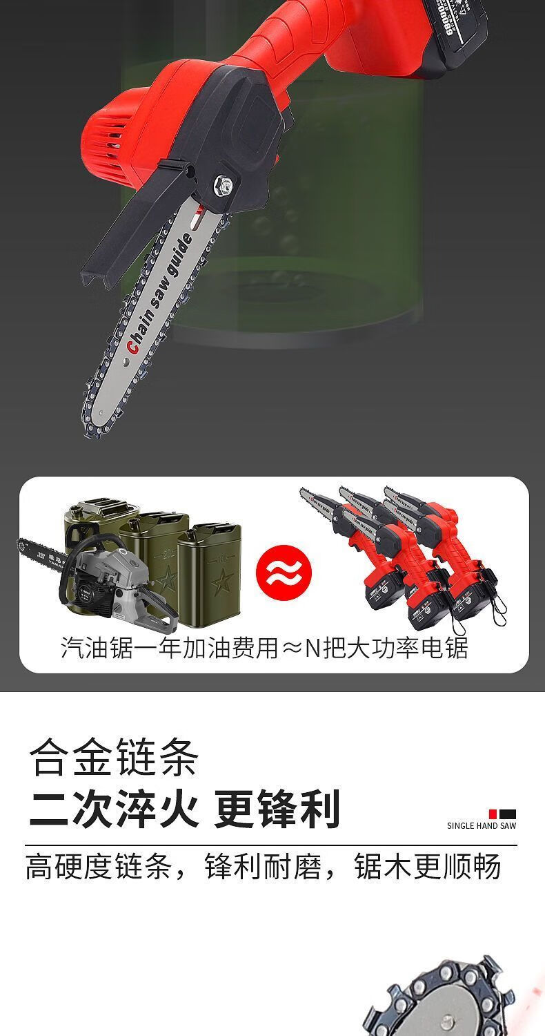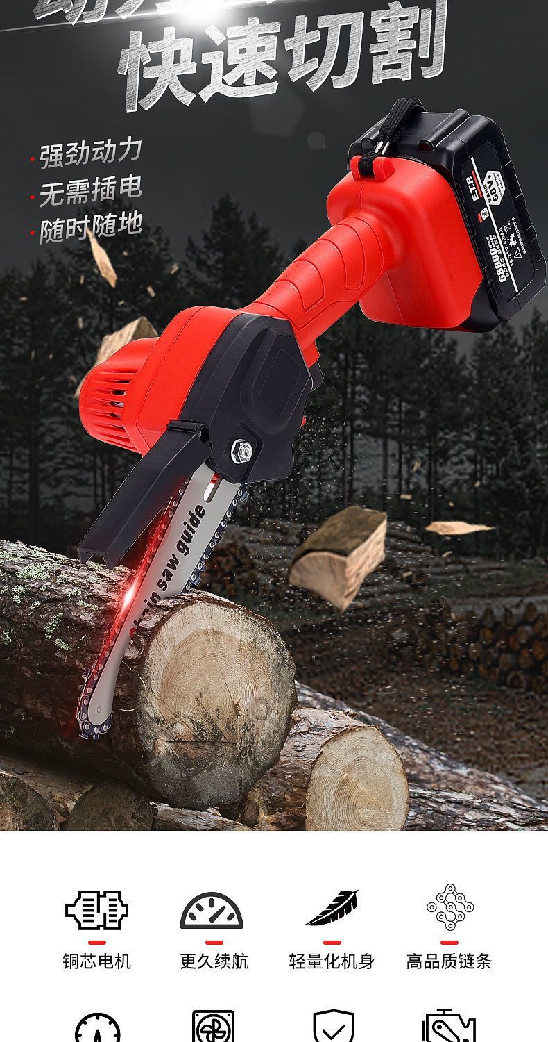 Electric chainsaw rechargeable portable lithium-electric chain saw outdoor wireless small logging hand saw for tree cutting and pruning high-power enhanced single-hand saw-8 inches-5 sections 2 electric 2 chains