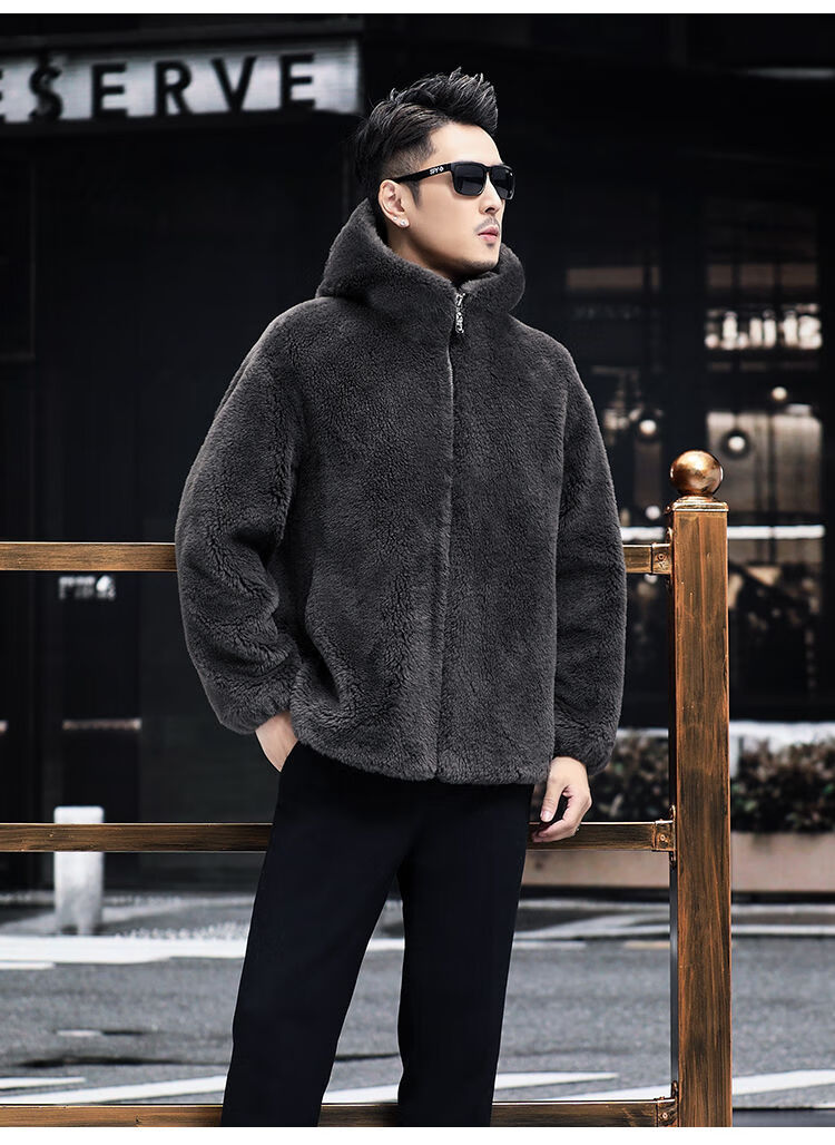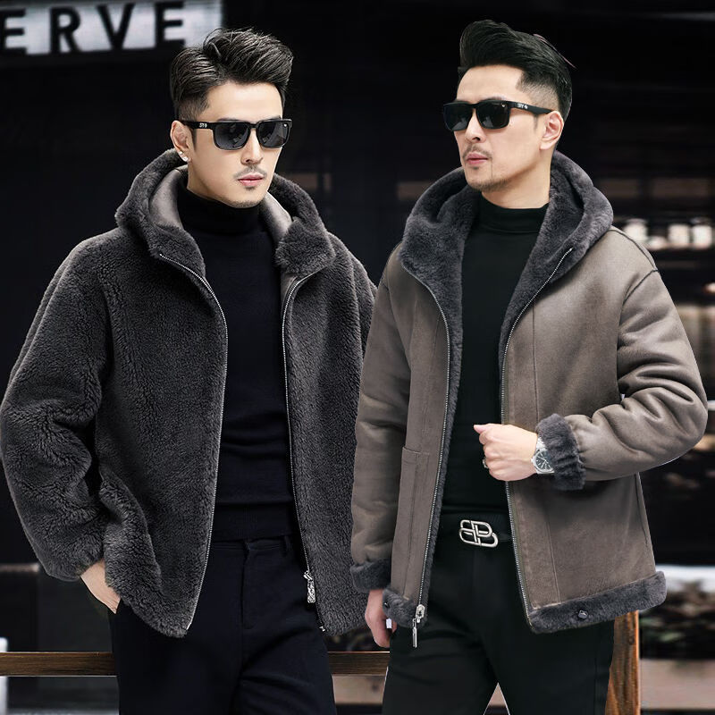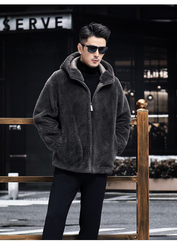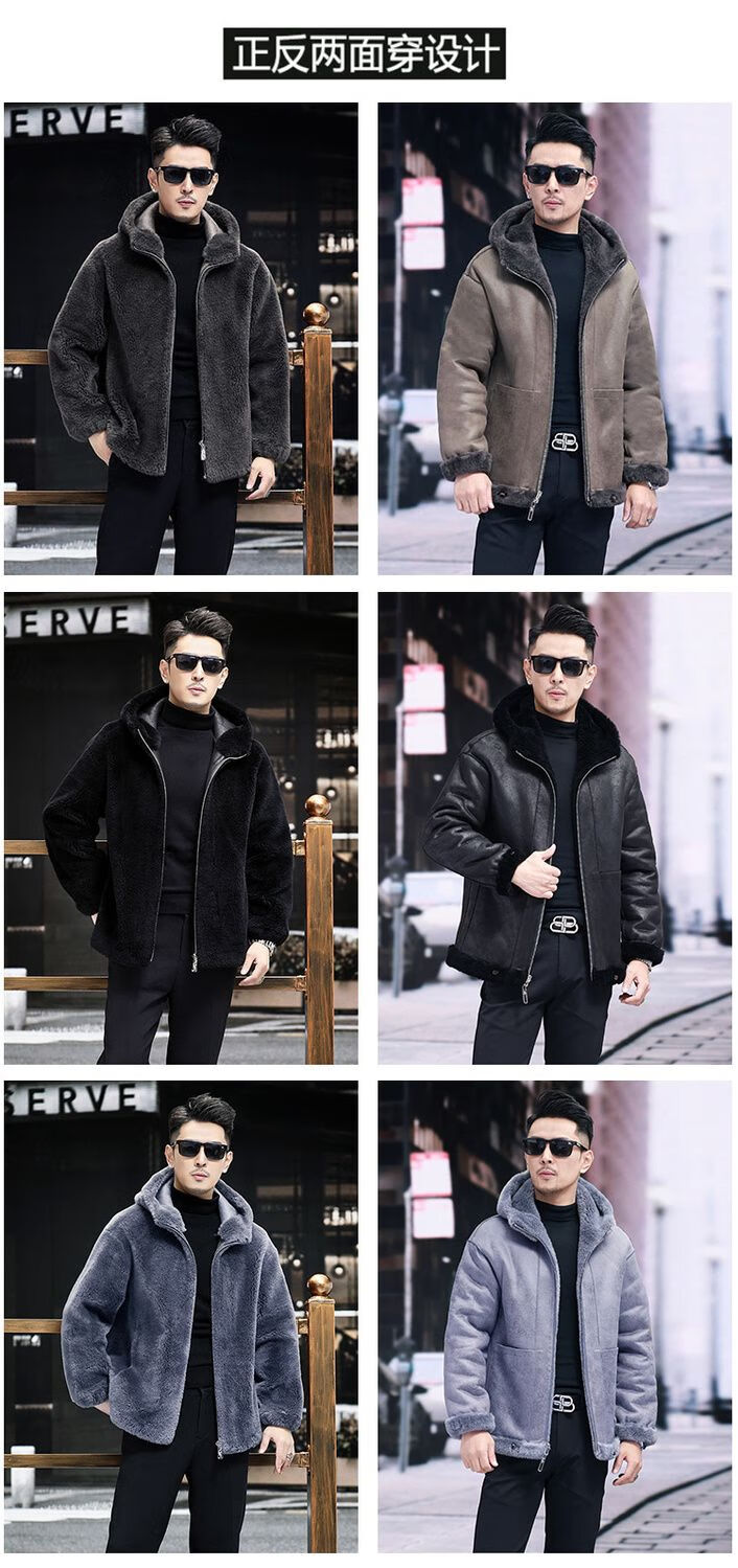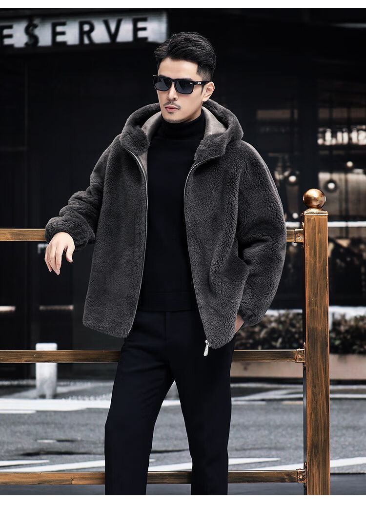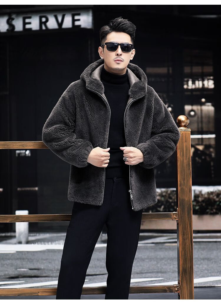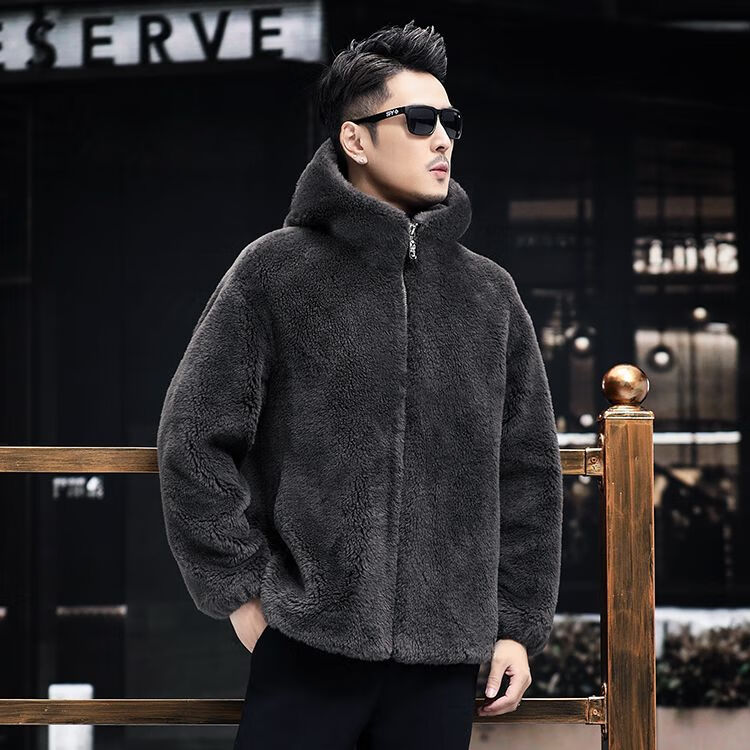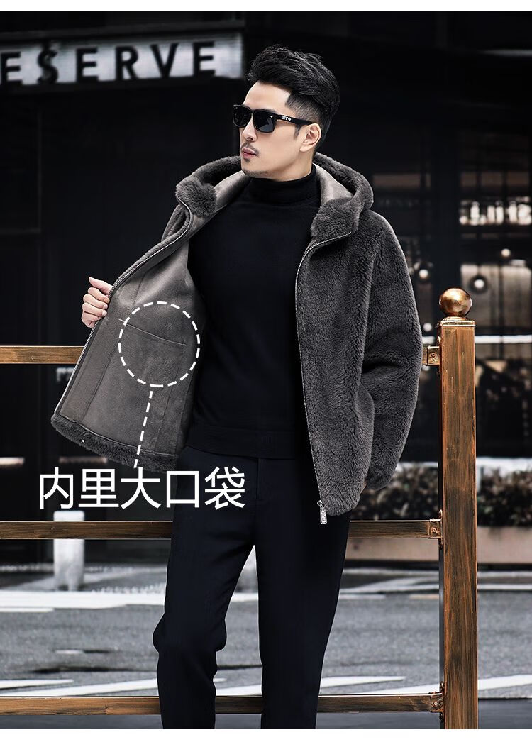 Pierre Cardin 100% Sheep Shear Coat Men's Genuine Sheep Fur All-in-One Reversible Lamb Fur Jacket Hooded Warm Winter Clothes Dark Gray M About 100 Jin