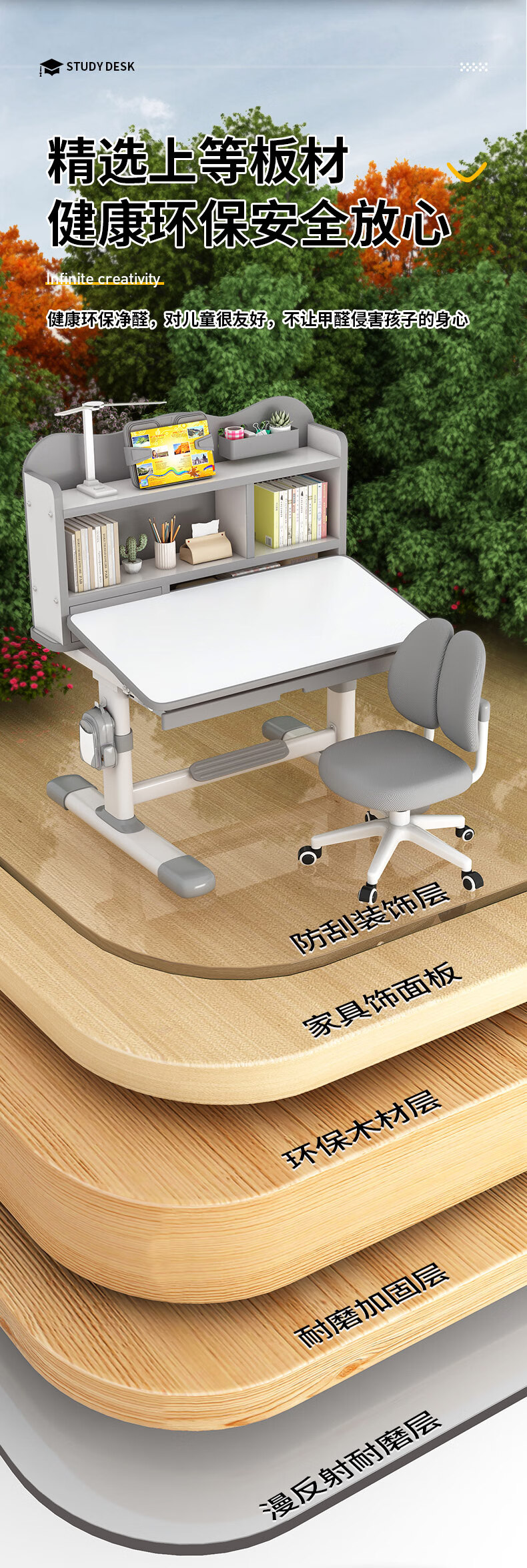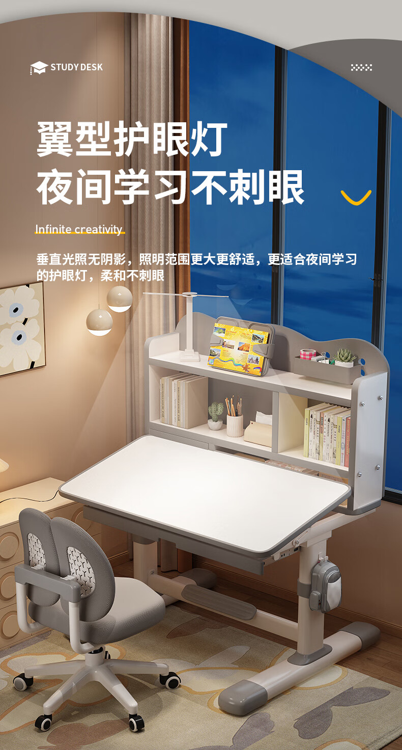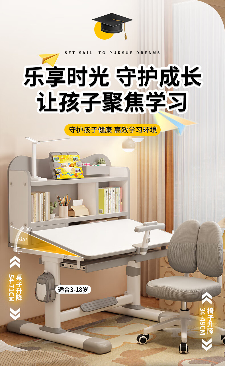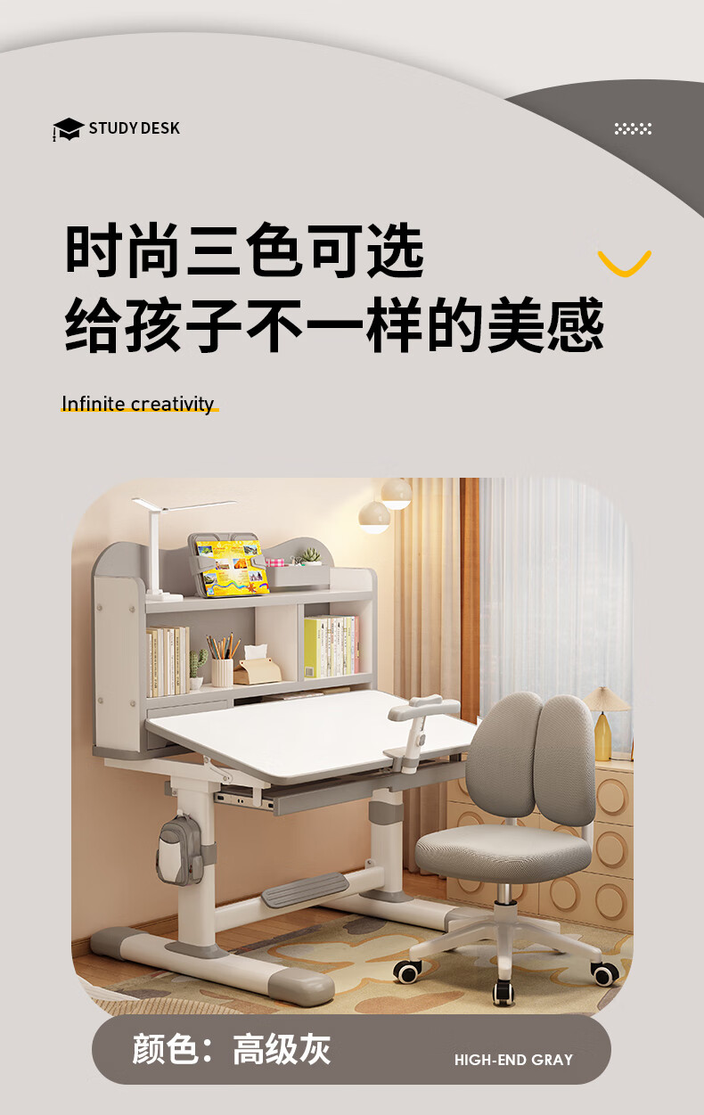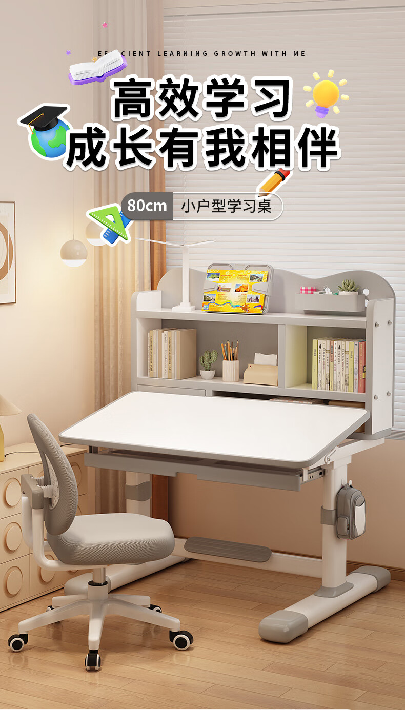 QIAOBAOBAO children's study desk and chair set can be raised and lowered with reading bookshelf, multi-functional desk and chair, student home desk, collection gray - environmentally friendly and aldehyde-resistant, three-layer large bookshelf