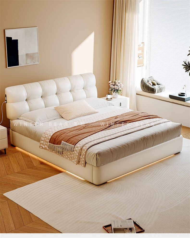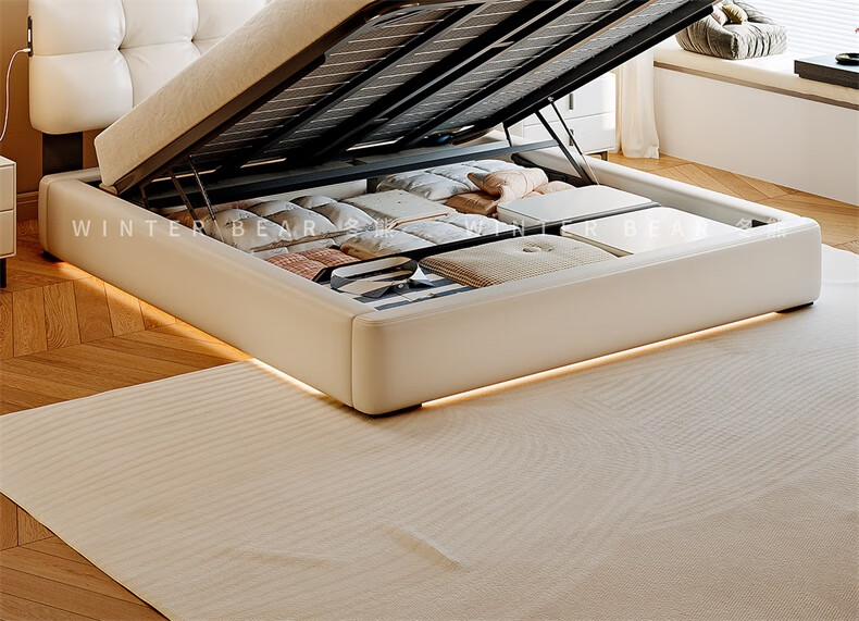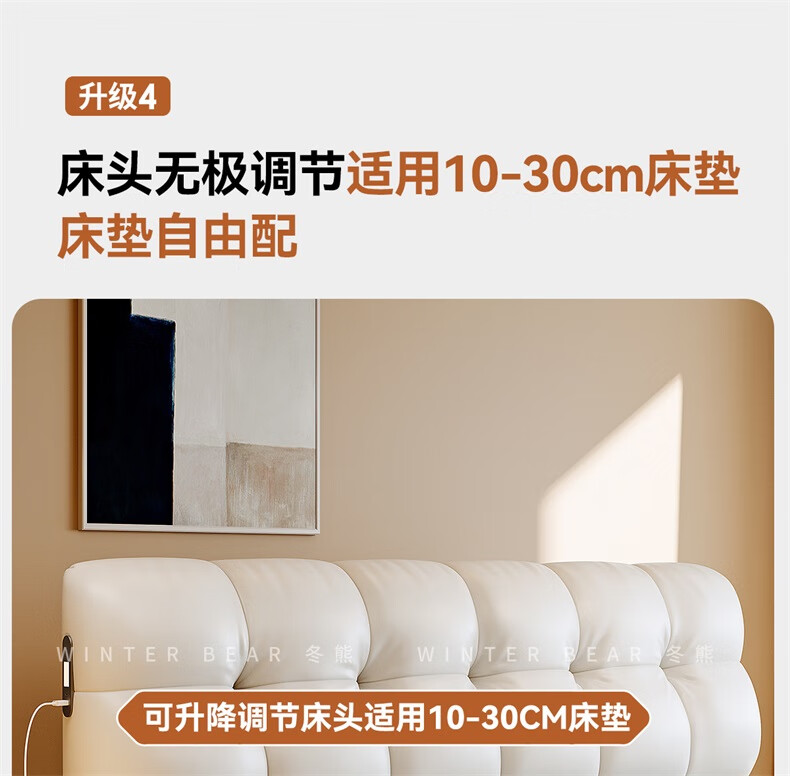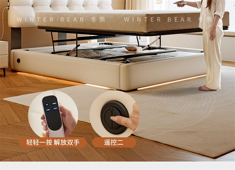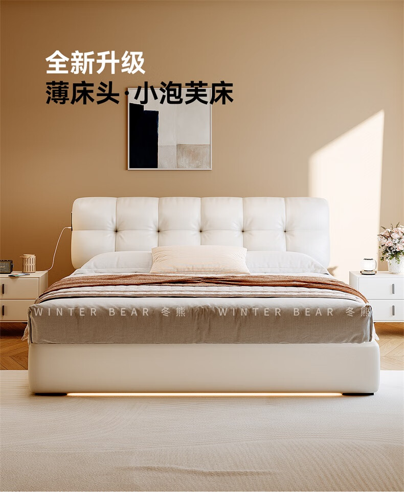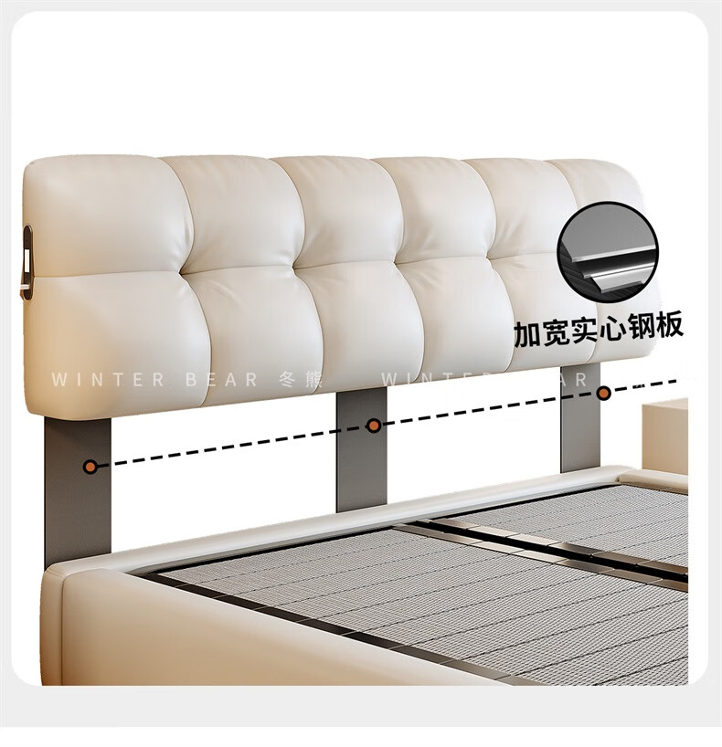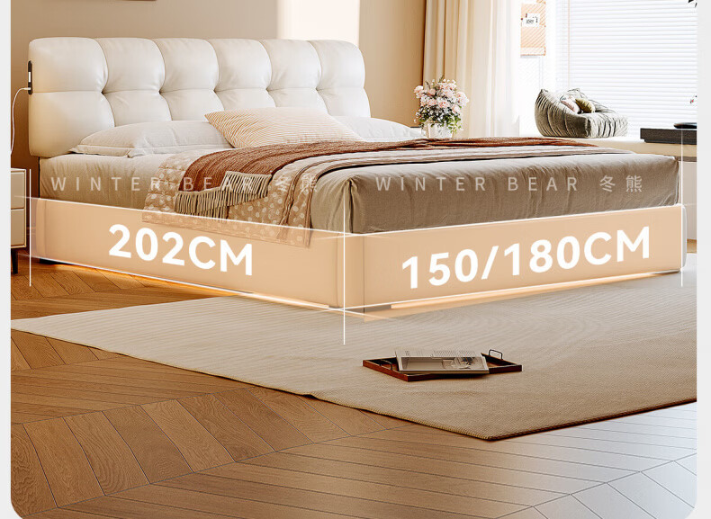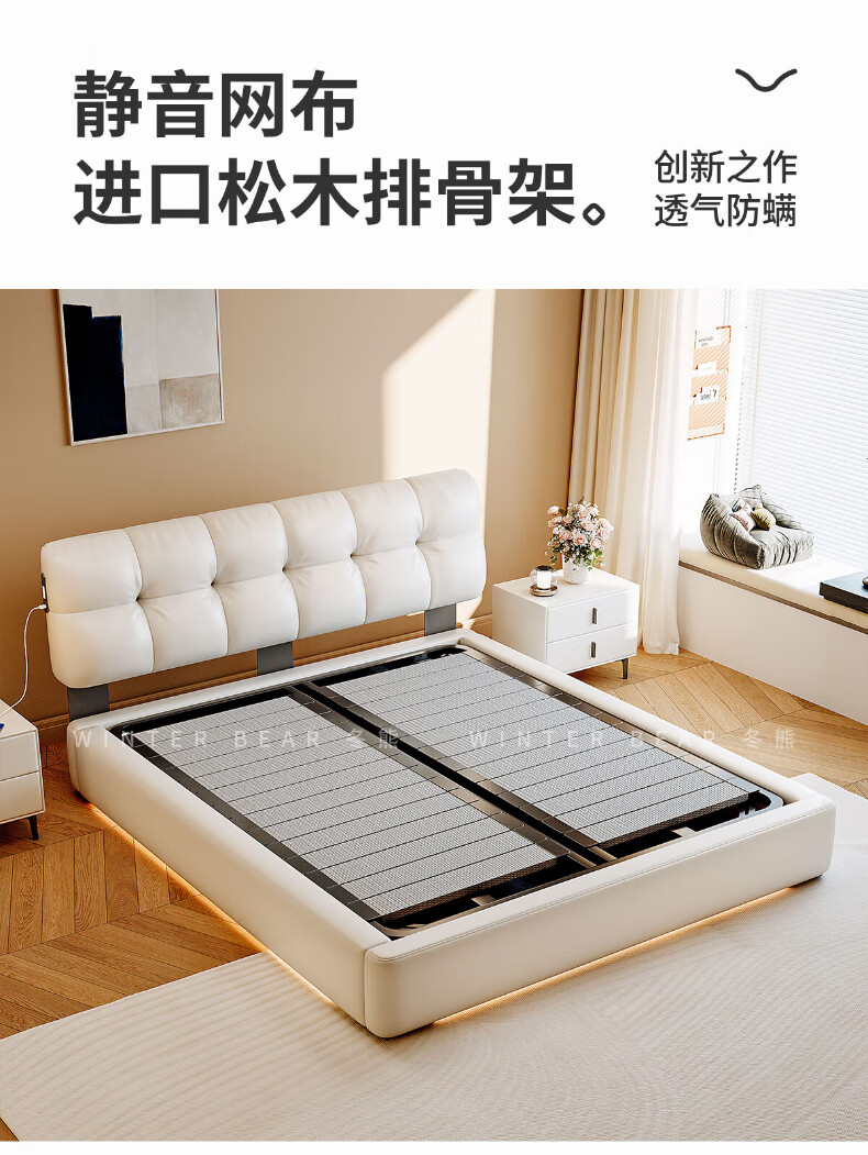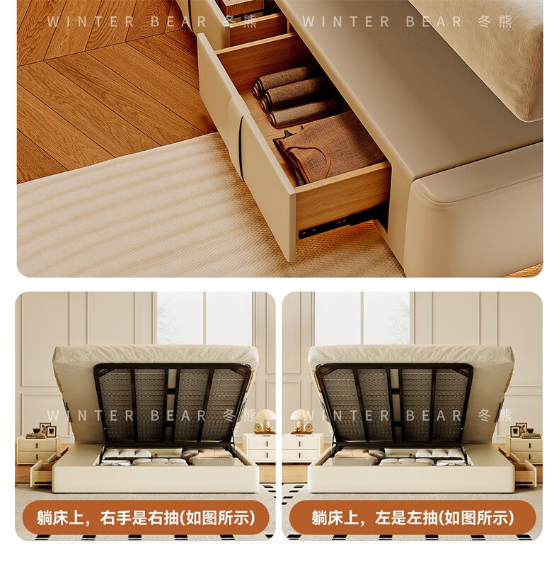 Winter Bear Puff Leather Bed Ultra-Thin Bedside Small Apartment Space-Saving Double Master Bedroom Cream High Box Sliding Storage Bed Ecological Leather Bed/Full Solid Wood Beech Rib Frame + 5-Star Mattress 1800mm*2000mm Frame Structure
