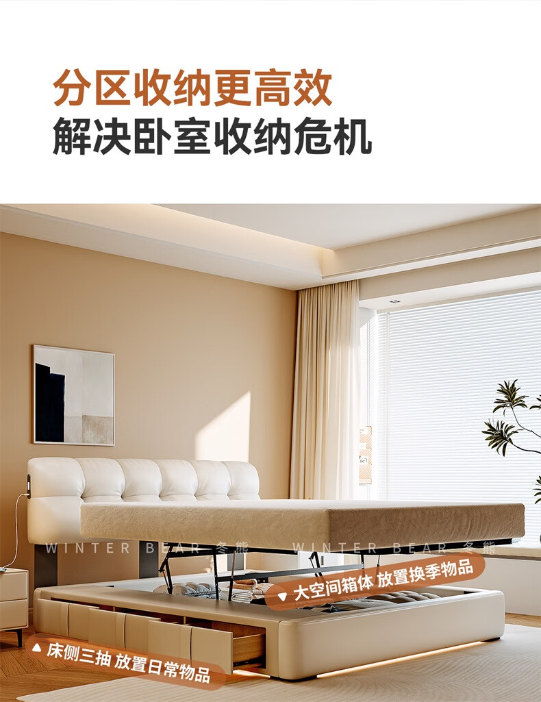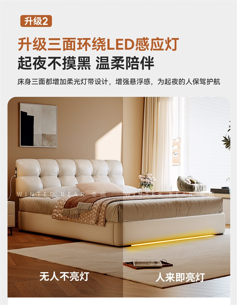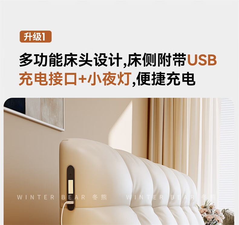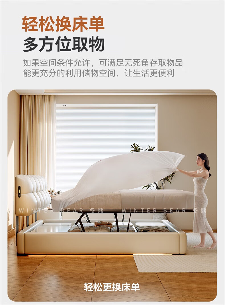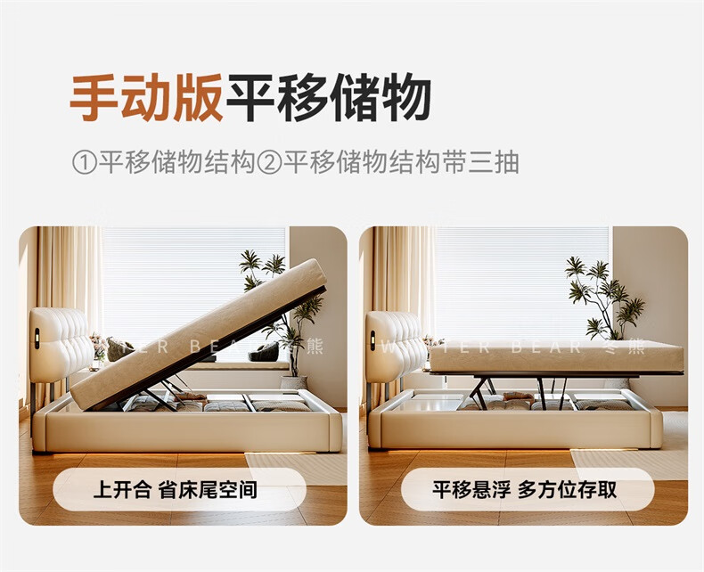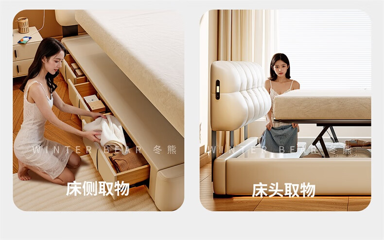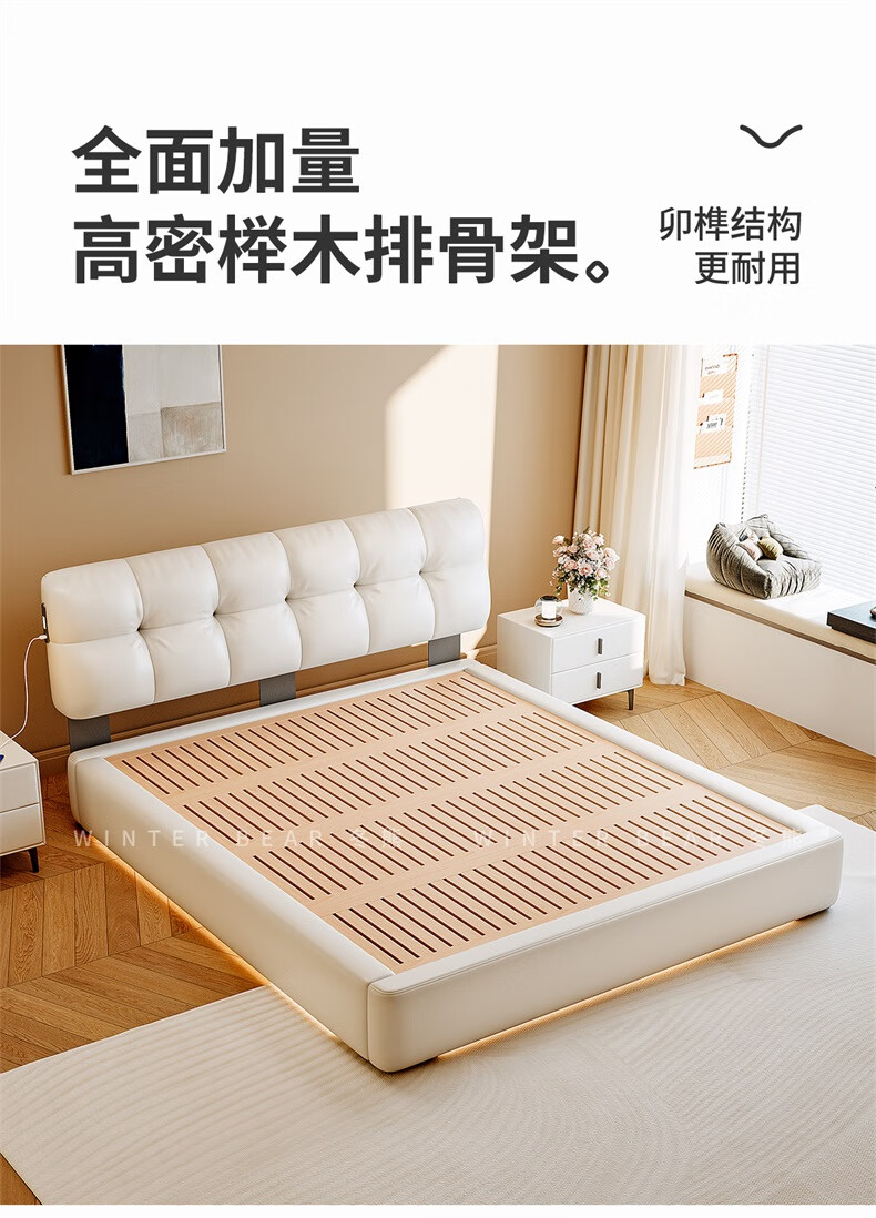 Winter Bear Puff Leather Bed Ultra-Thin Bedside Small Apartment Space-Saving Double Master Bedroom Cream High Box Sliding Storage Bed Ecological Leather Bed/Full Solid Wood Beech Rib Frame + 5-Star Mattress 1800mm*2000mm Frame Structure