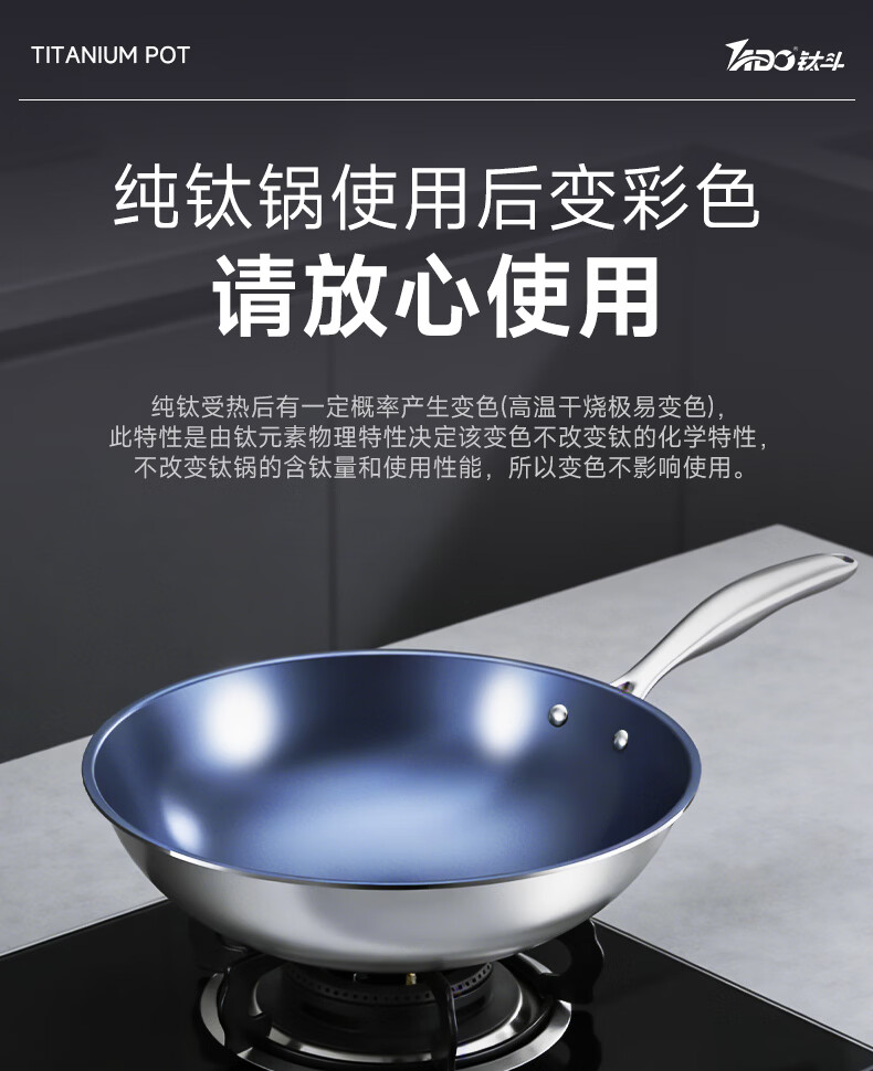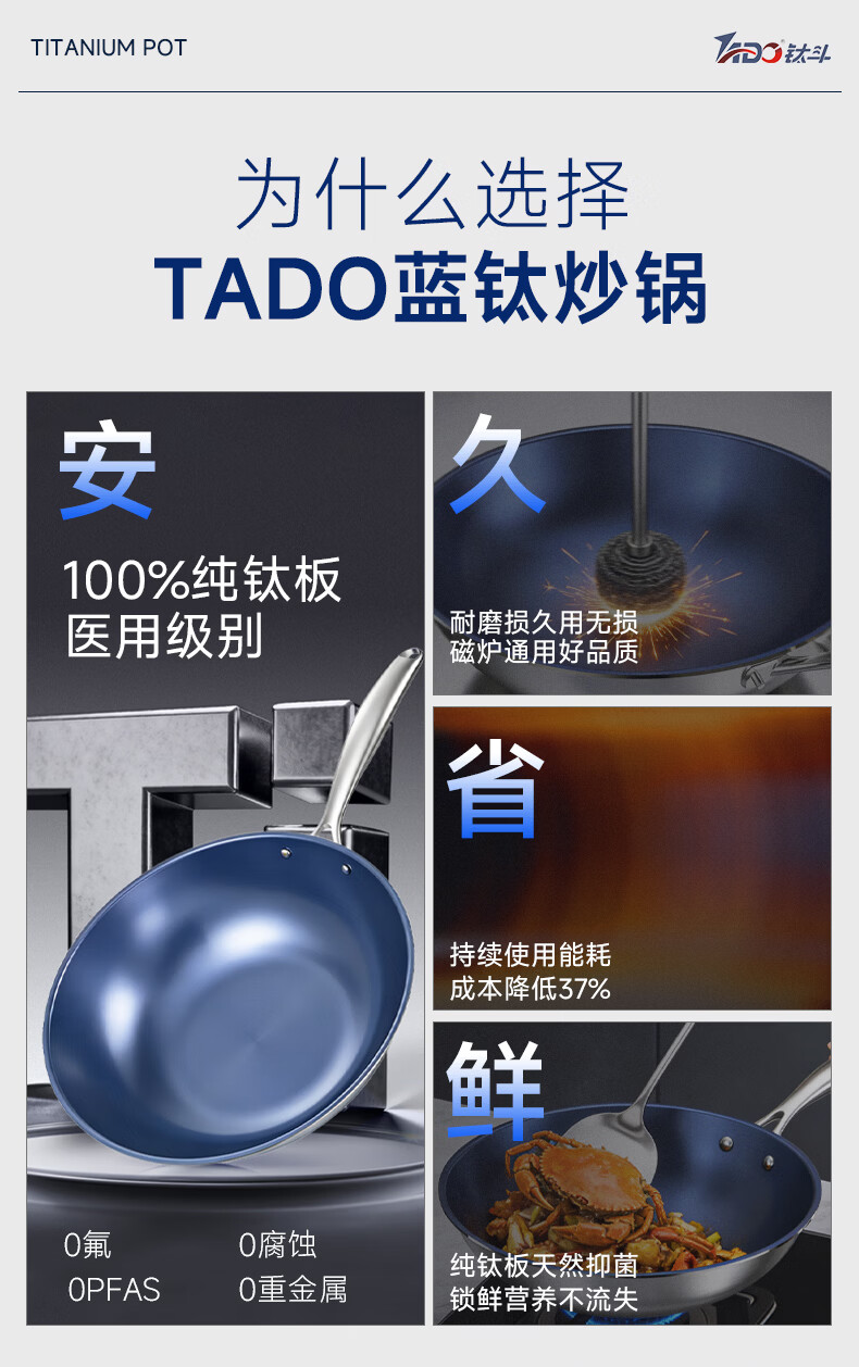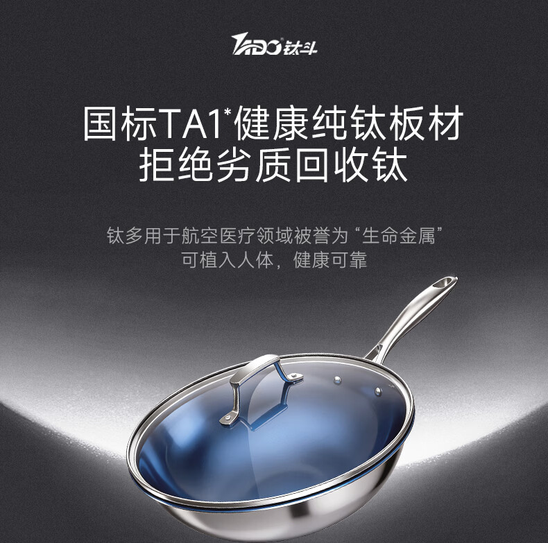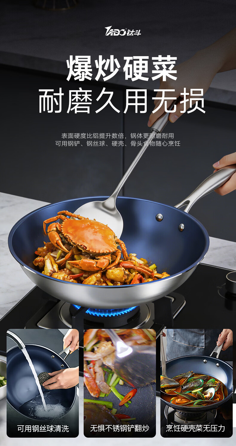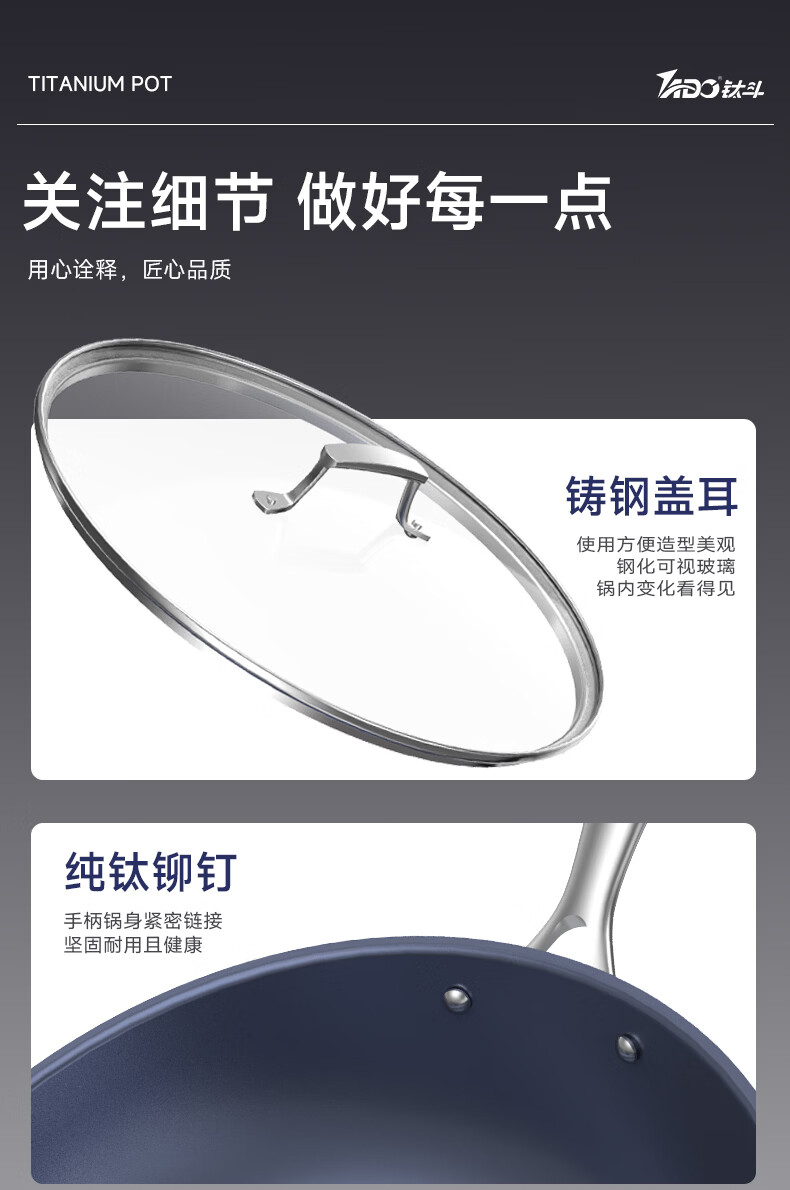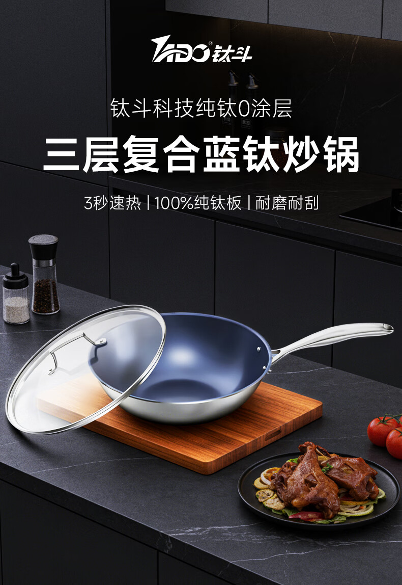 TADO titanium bucket titanium pot pure titanium wok uncoated frying pan frying pan gas induction cooker universal wok New Year gift for 2-4 people recommended large bottom all-steel handle free glass pot lid 30cm