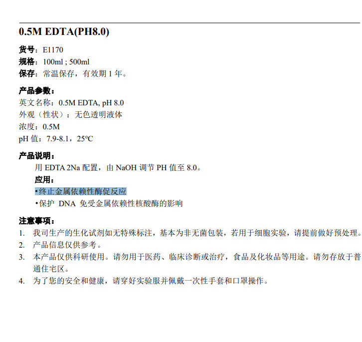 0.5M EDTA(PH8.0)E1170 500ml general buffer cleaner unit bottle