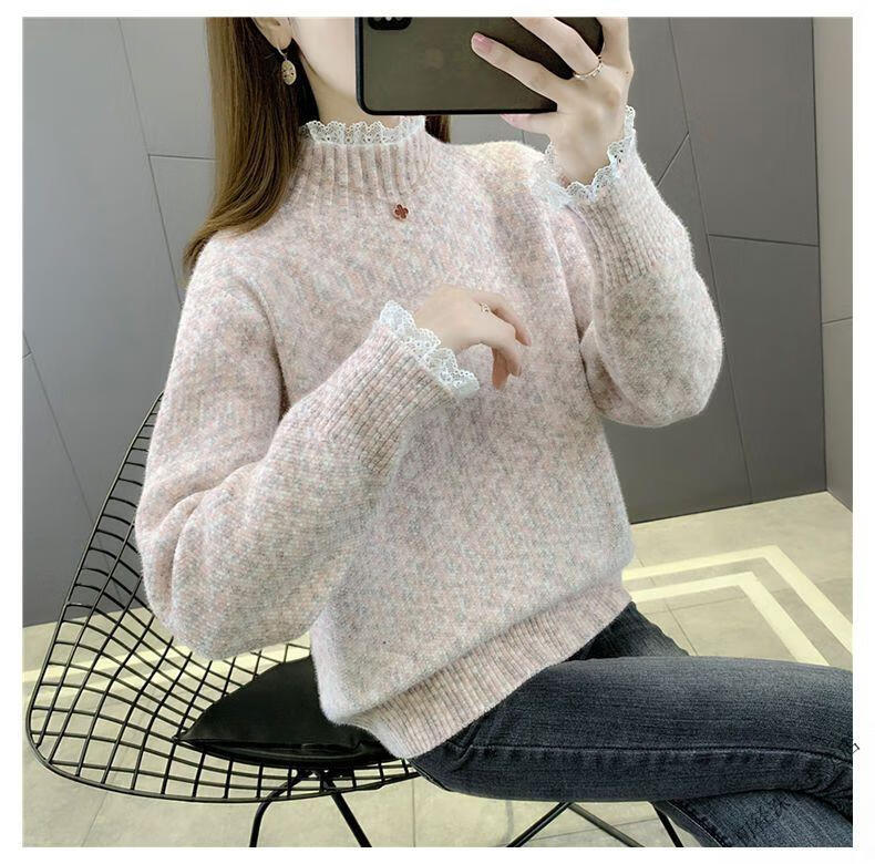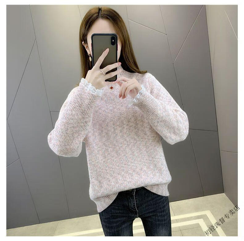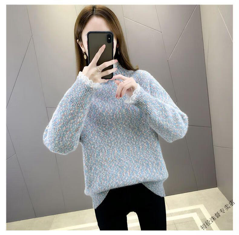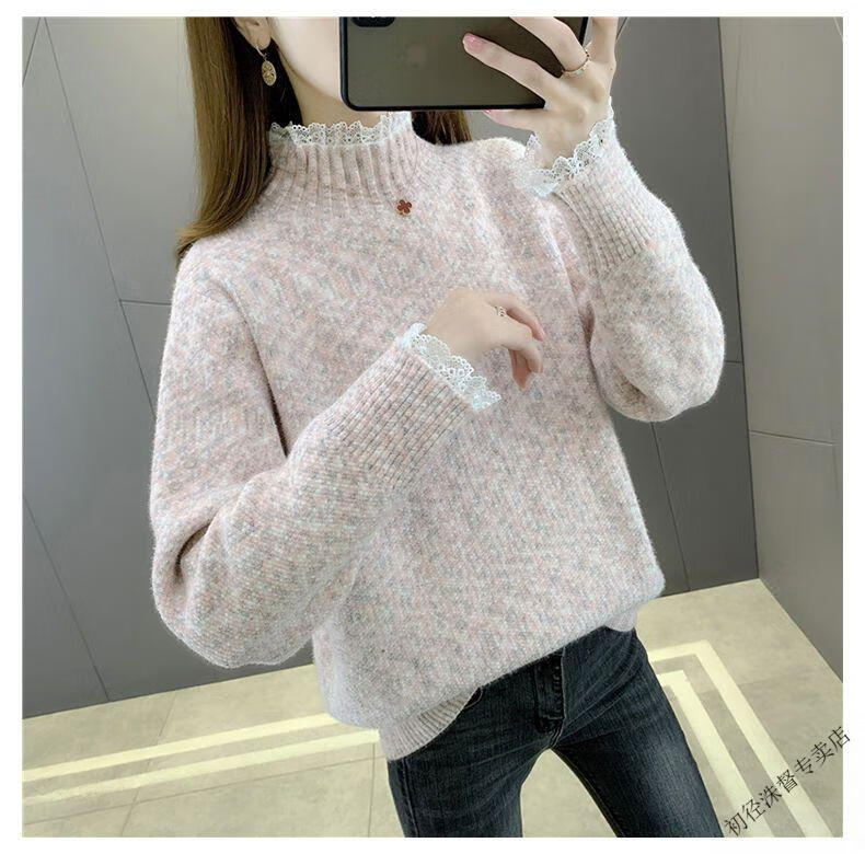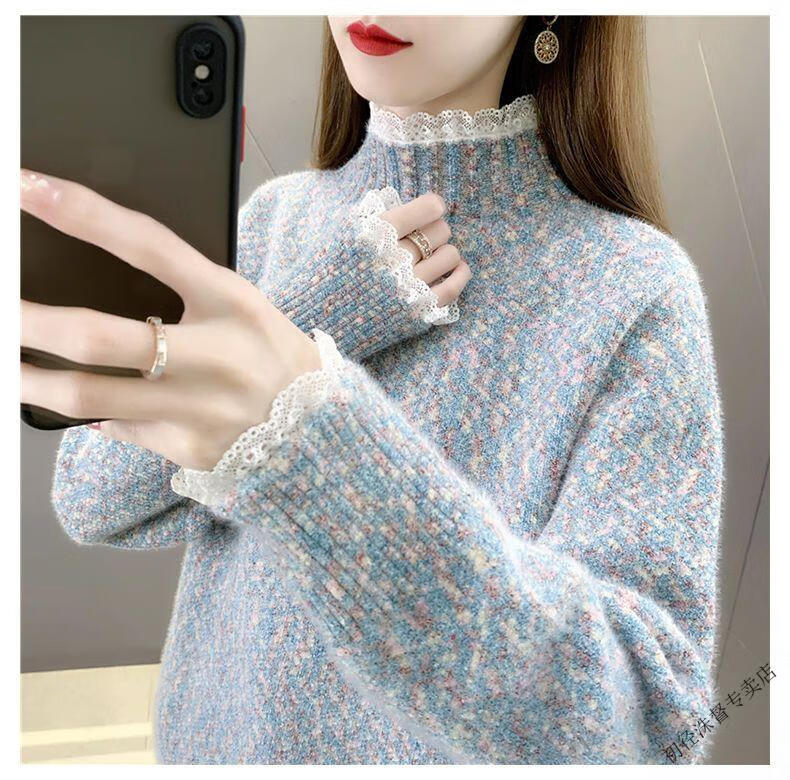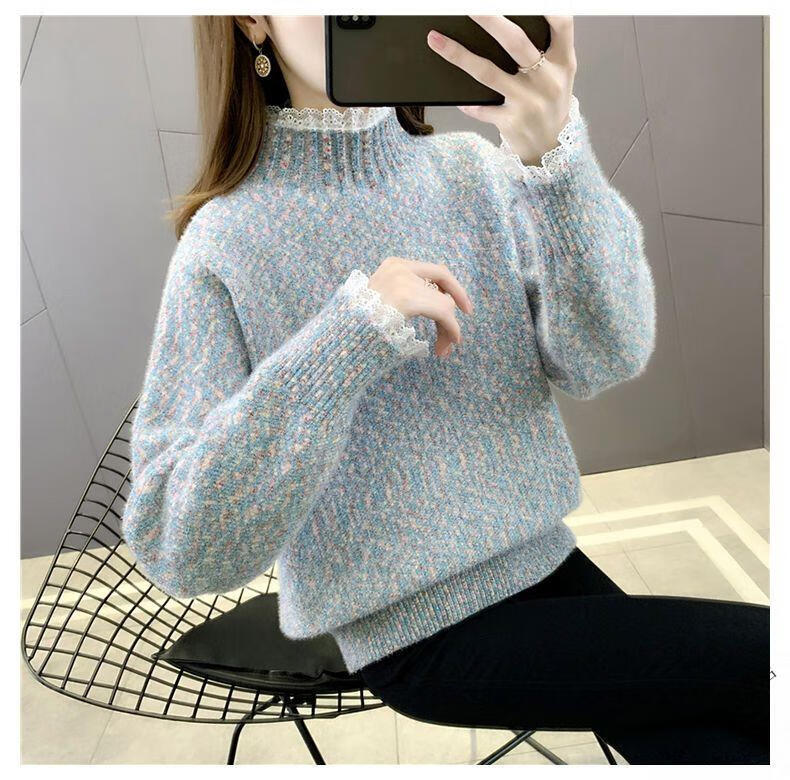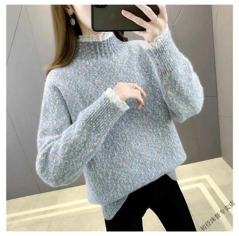 First diameter chenille lace half turtleneck sweater for women with velvet and thickening, spring and autumn warm inner and outer wear knitted bottoming sweater, blue, velvet, thickened S, recommended 85-98 pounds