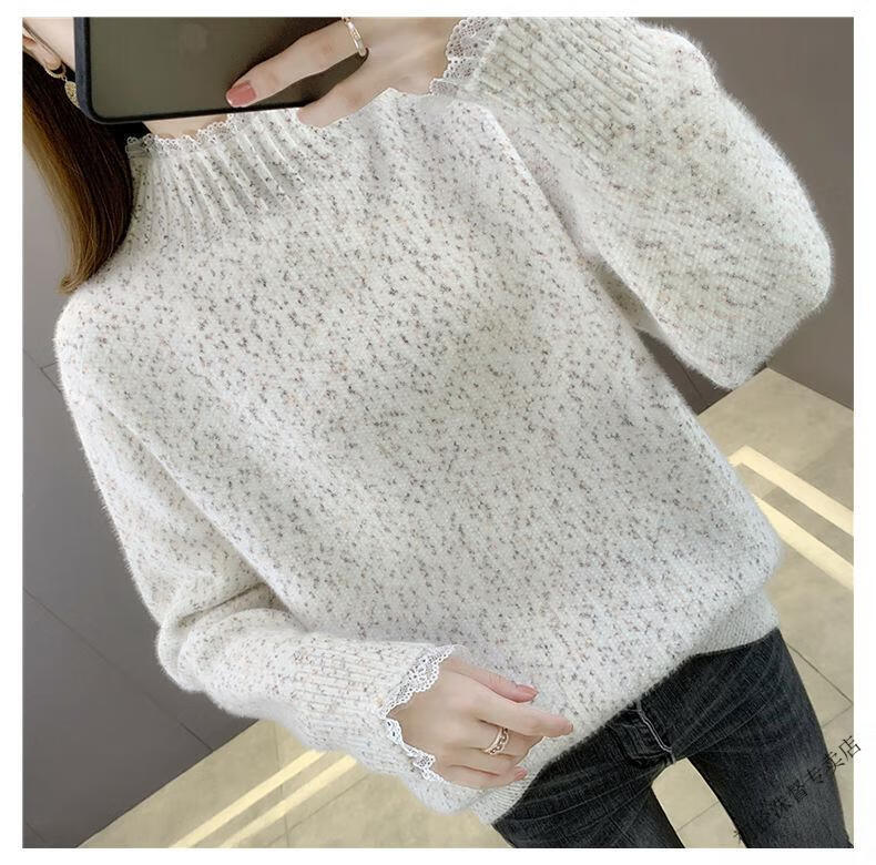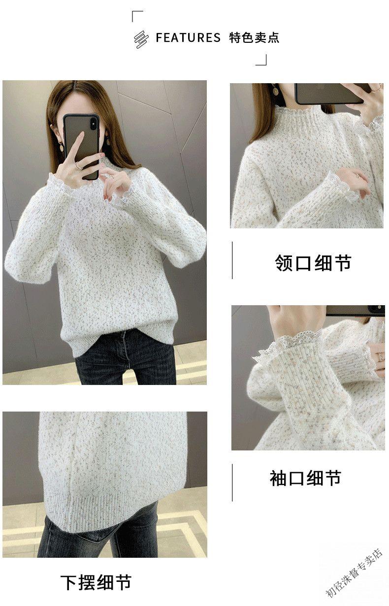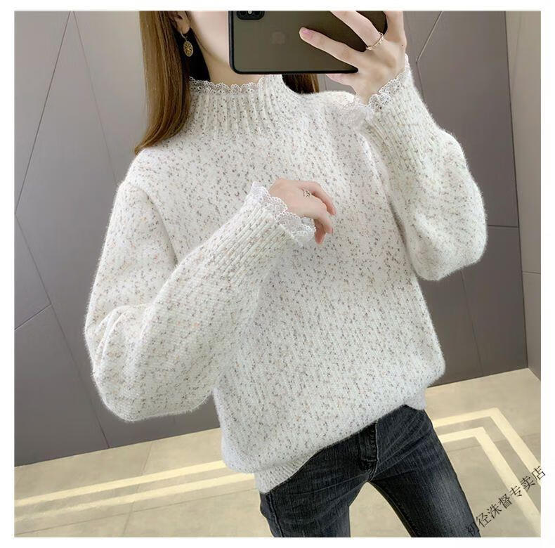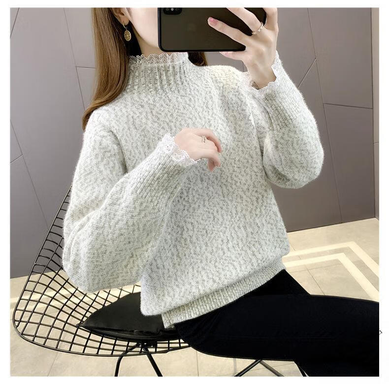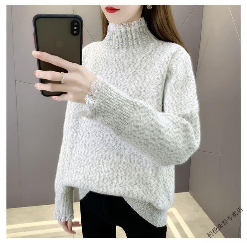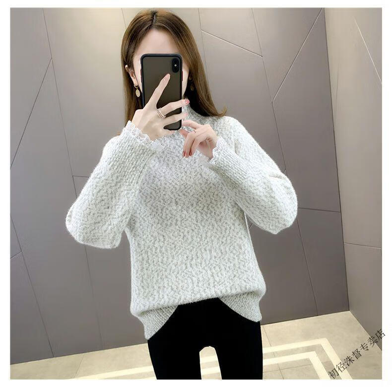 First diameter chenille lace half turtleneck sweater for women with velvet and thickening, spring and autumn warm inner and outer wear knitted bottoming sweater, blue, velvet, thickened S, recommended 85-98 pounds