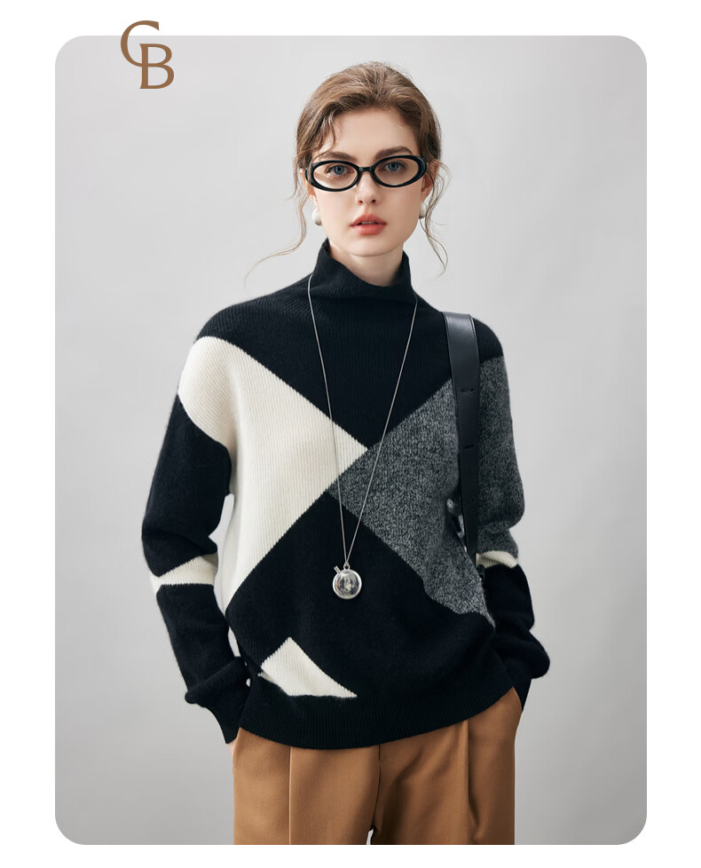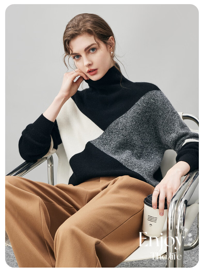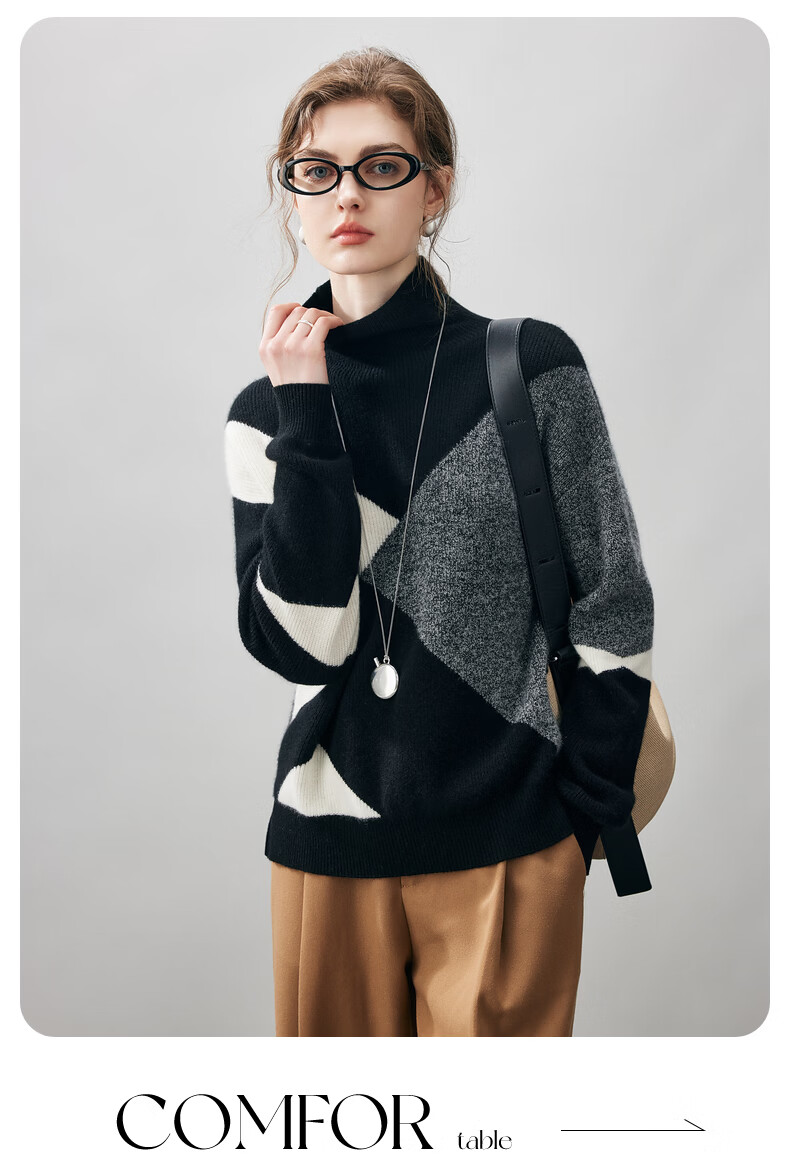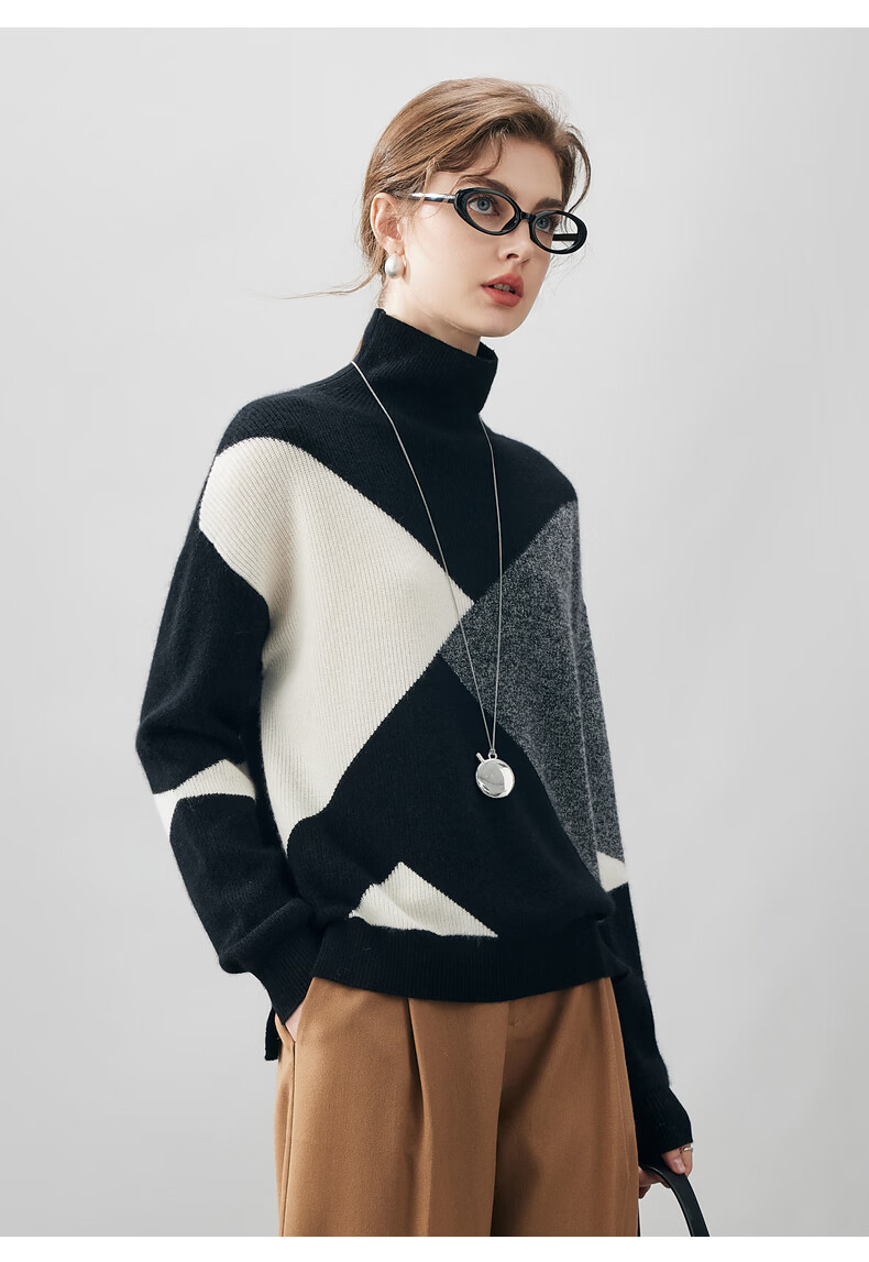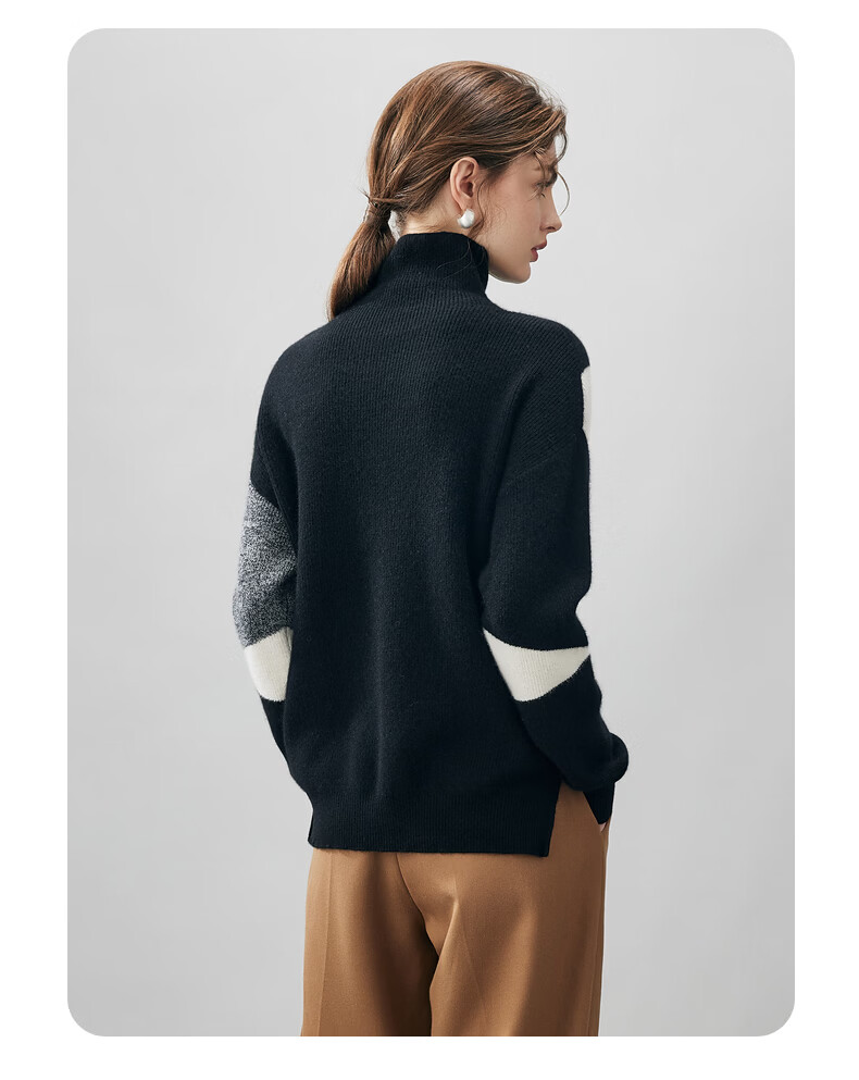 Komenboca 2025 autumn and winter new color block splicing cashmere sweater women's turtleneck sweater loose bottoming sweater midnight black XL