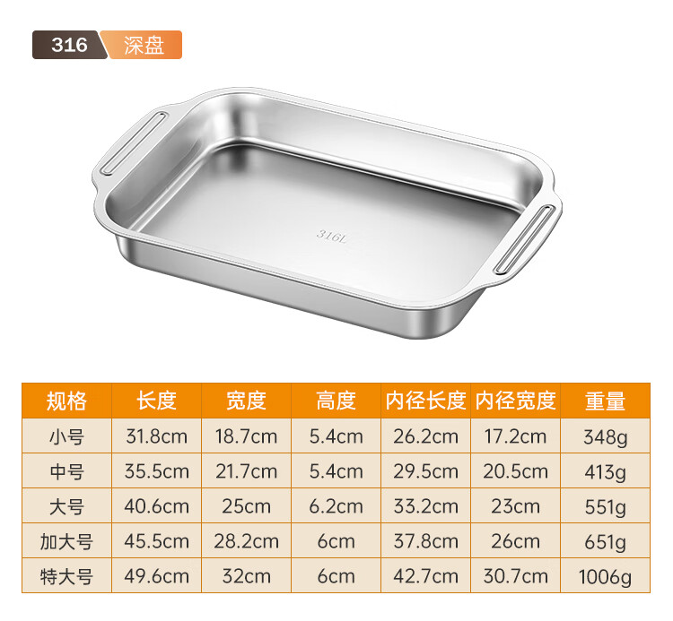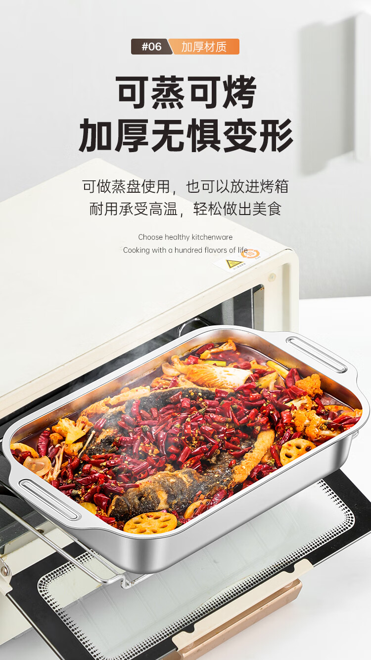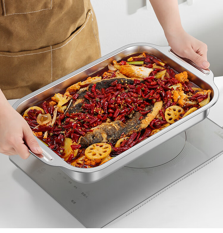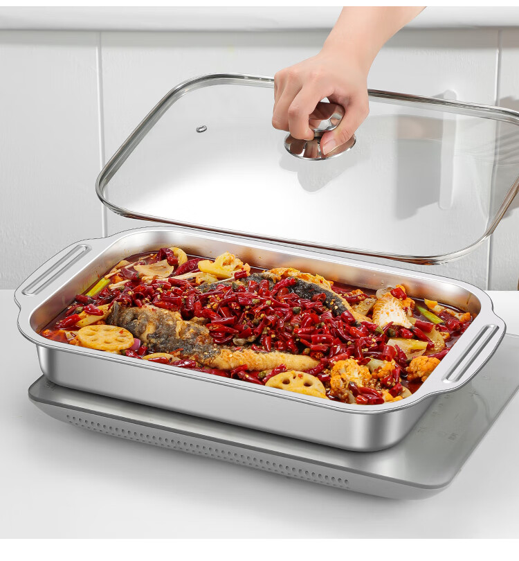 Stainless steel grilled fish plate rectangular household 316 food grade thickened induction cooker grilled fish special plate deep plate 45cm extra large + (tempered glass cover) food grade stainless