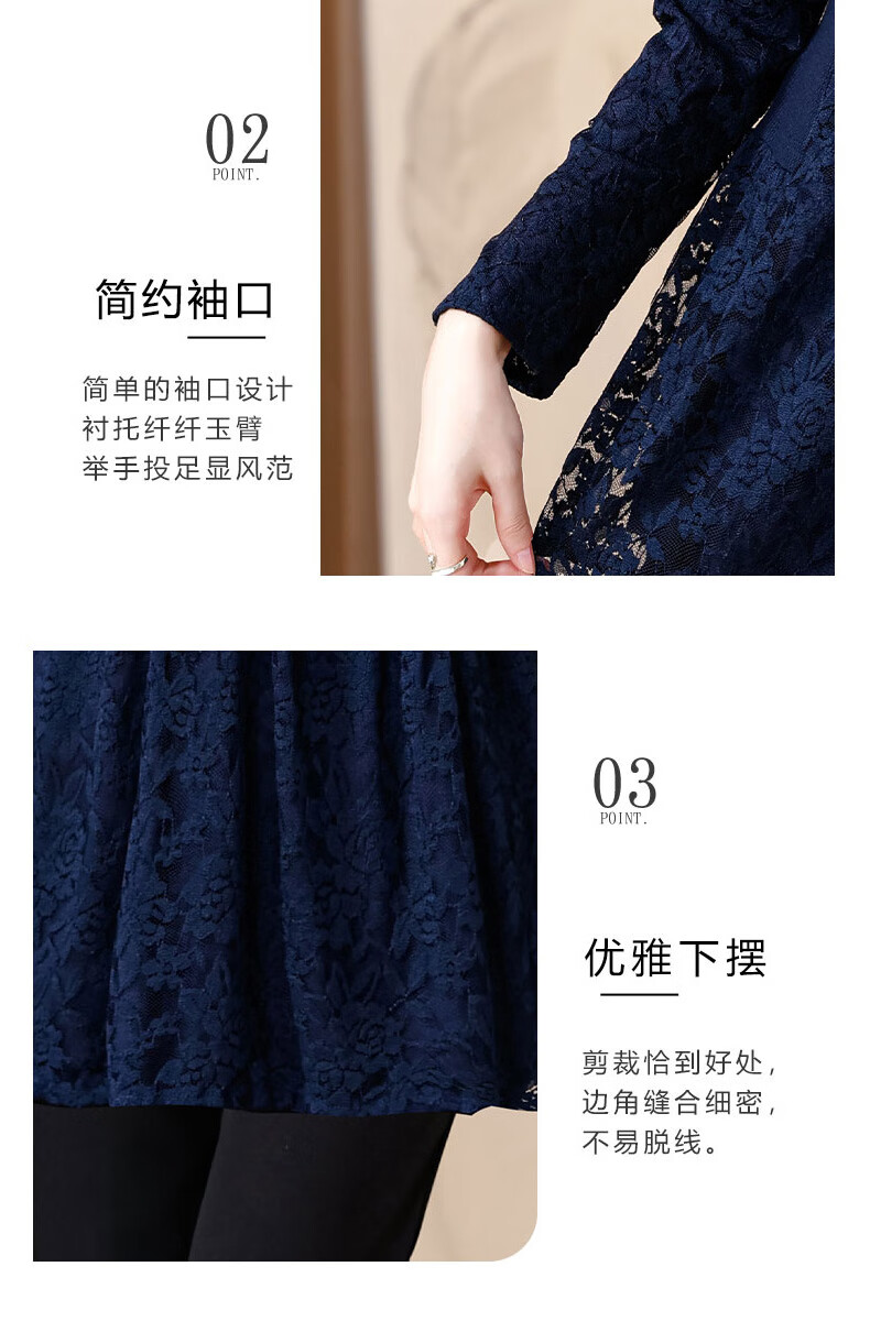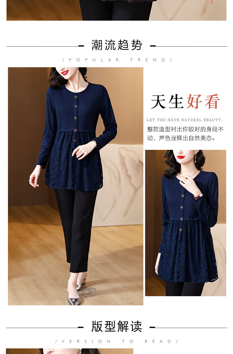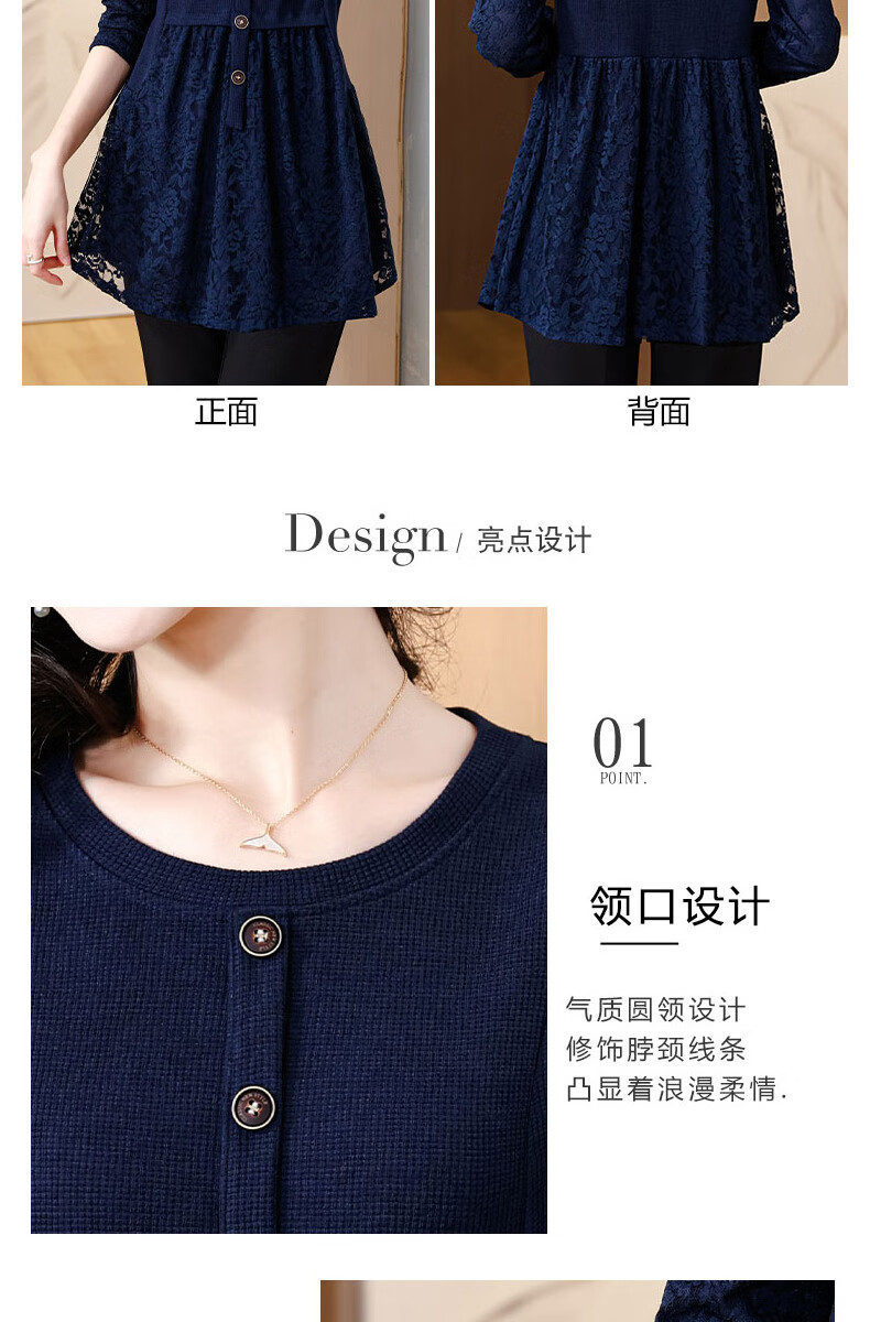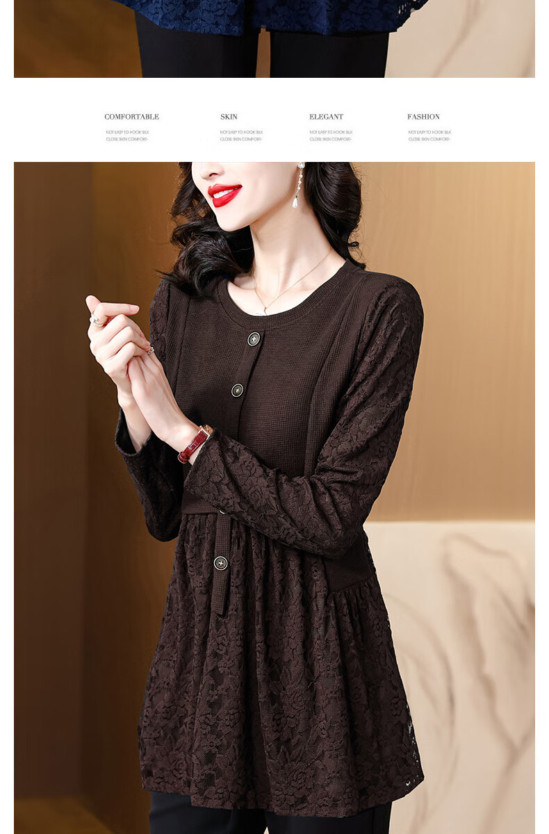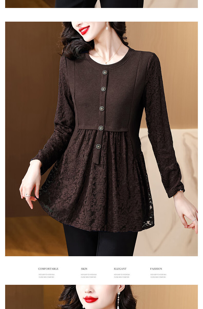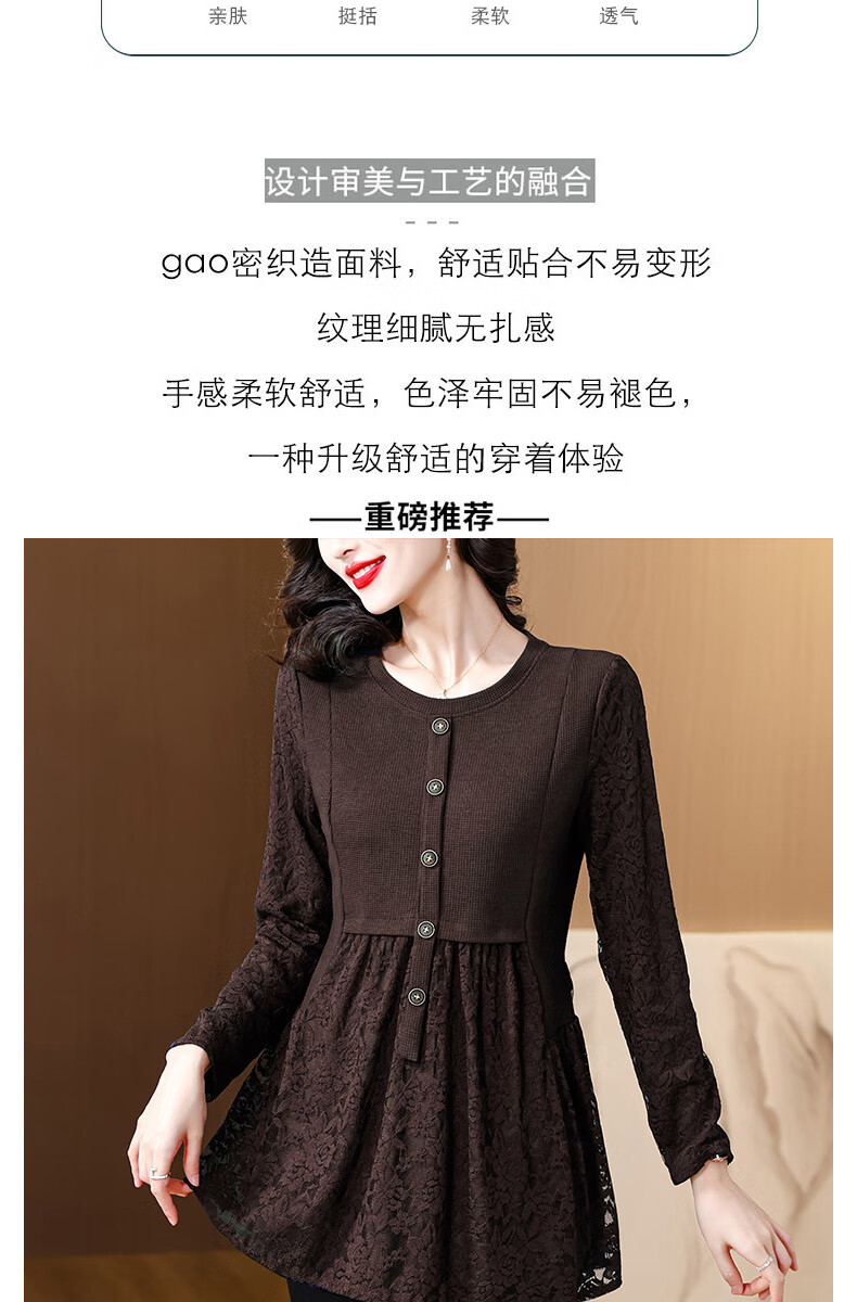 Pierre Cardin Thickened Lace Top Women's Butt Covering Mid-Length Bottoming Shirt Mom's Autumn and Winter Fashionable Inner Top, Brown Velvet, Thickened L (105-115 catties)
