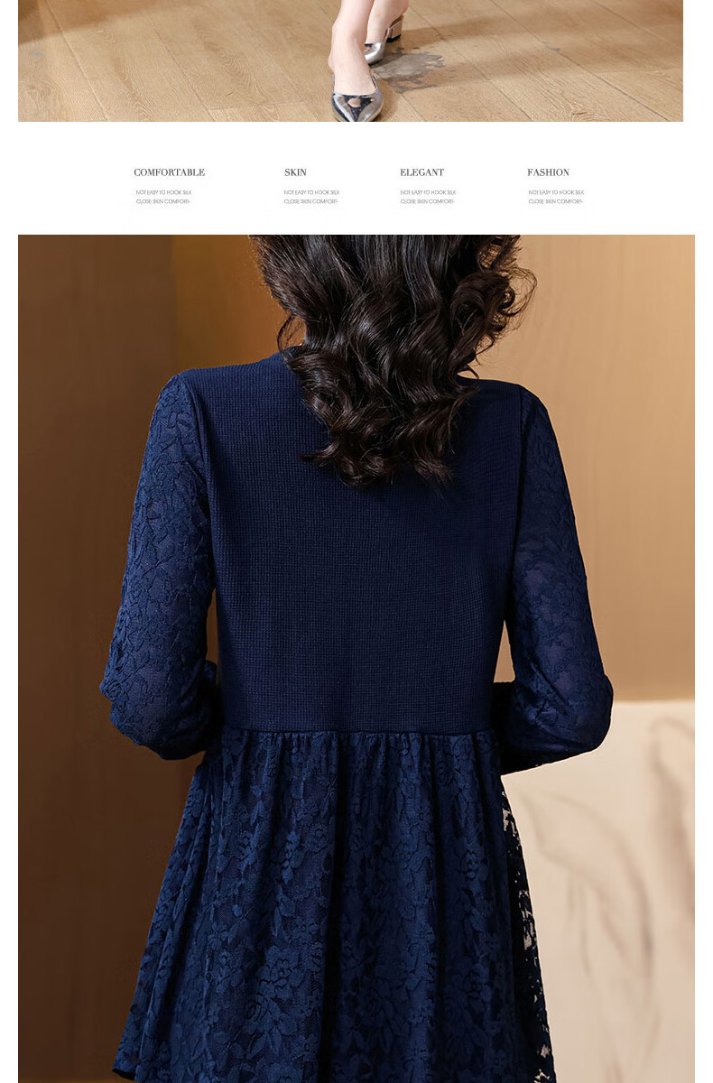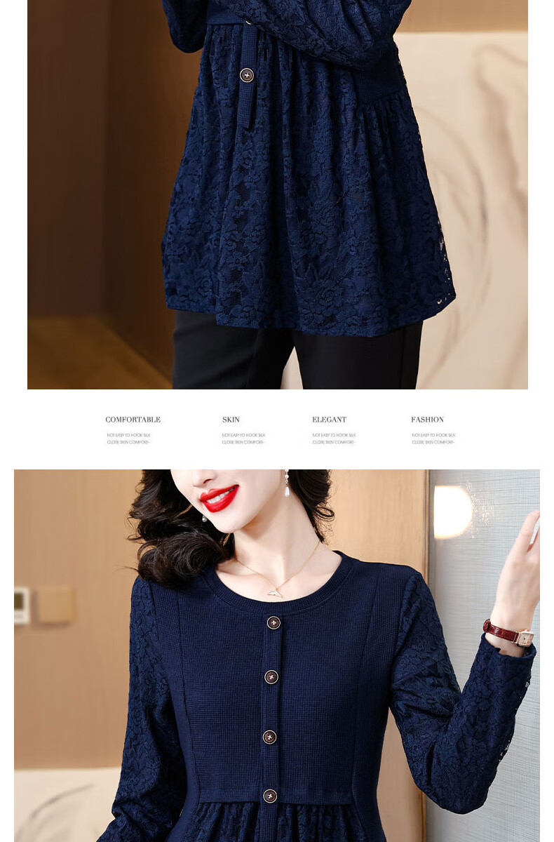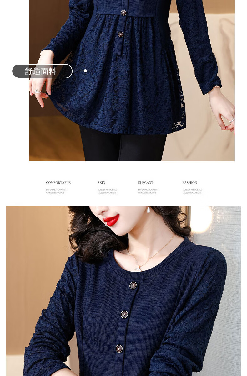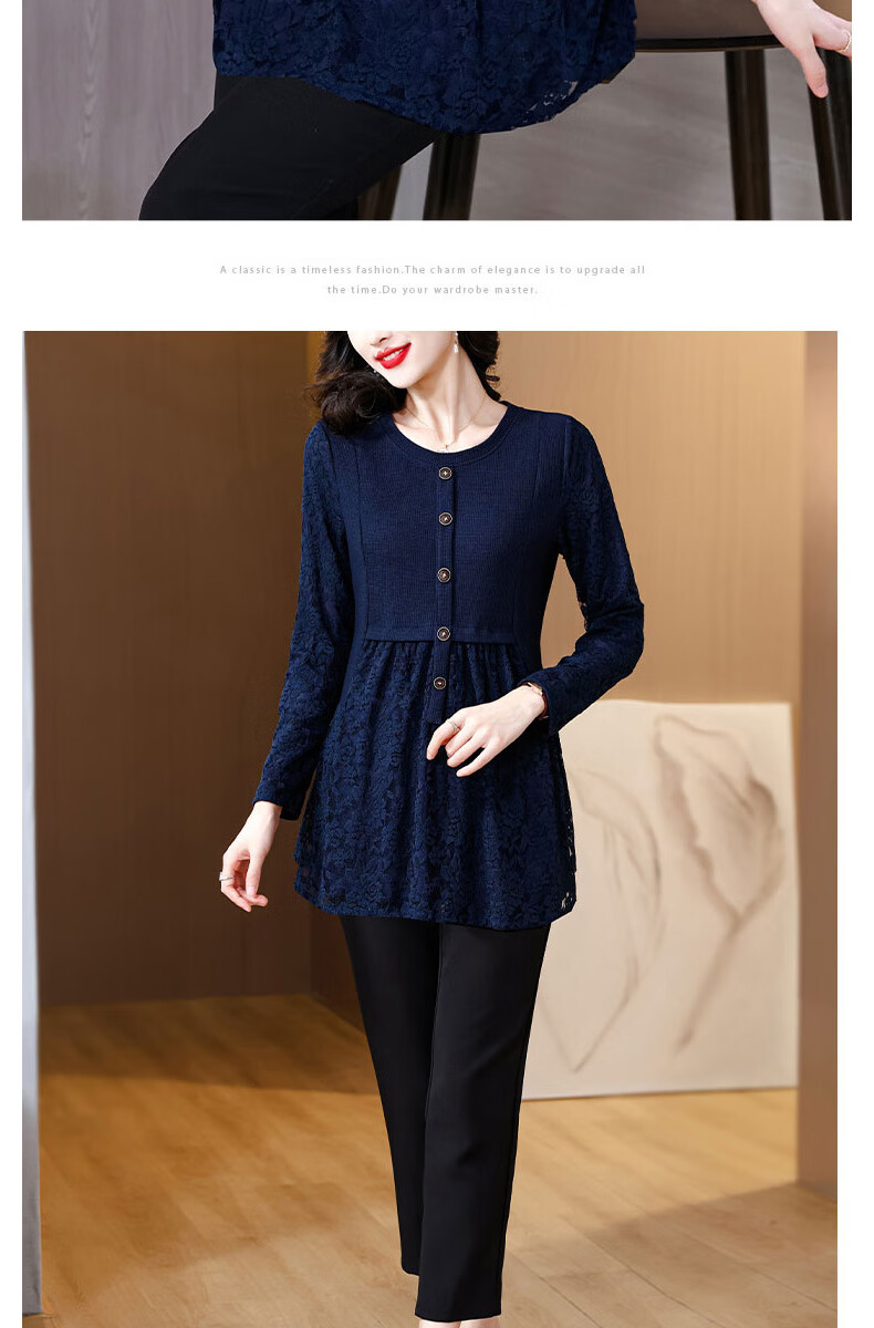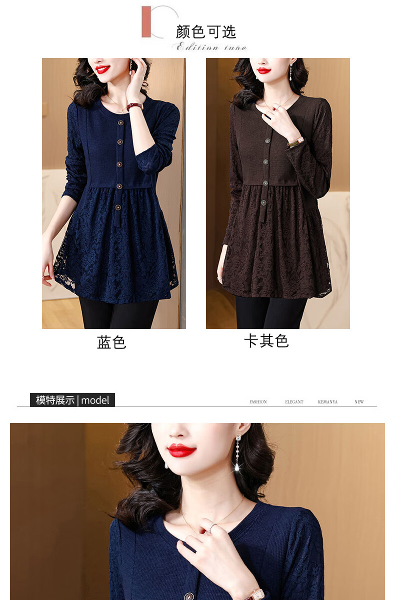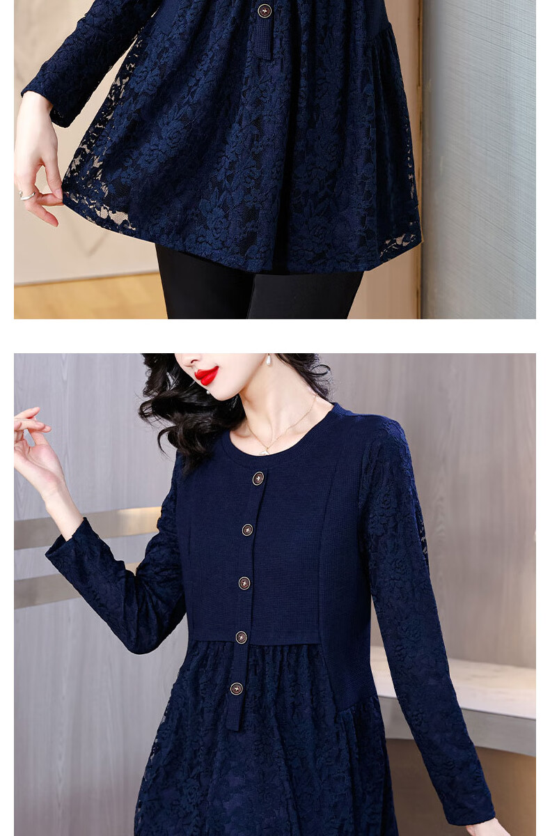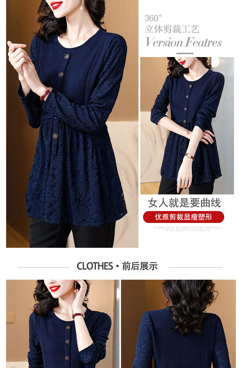 Pierre Cardin Thickened Lace Top Women's Butt Covering Mid-Length Bottoming Shirt Mom's Autumn and Winter Fashionable Inner Top, Brown Velvet, Thickened L (105-115 catties)