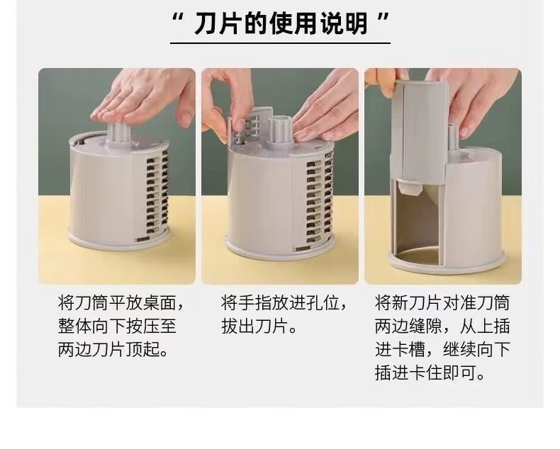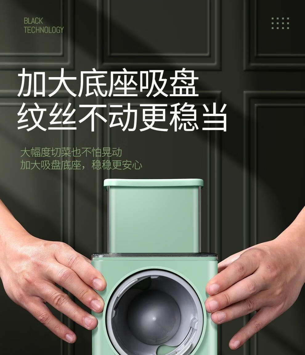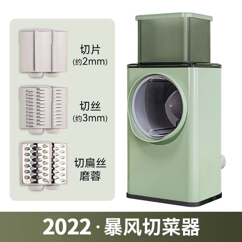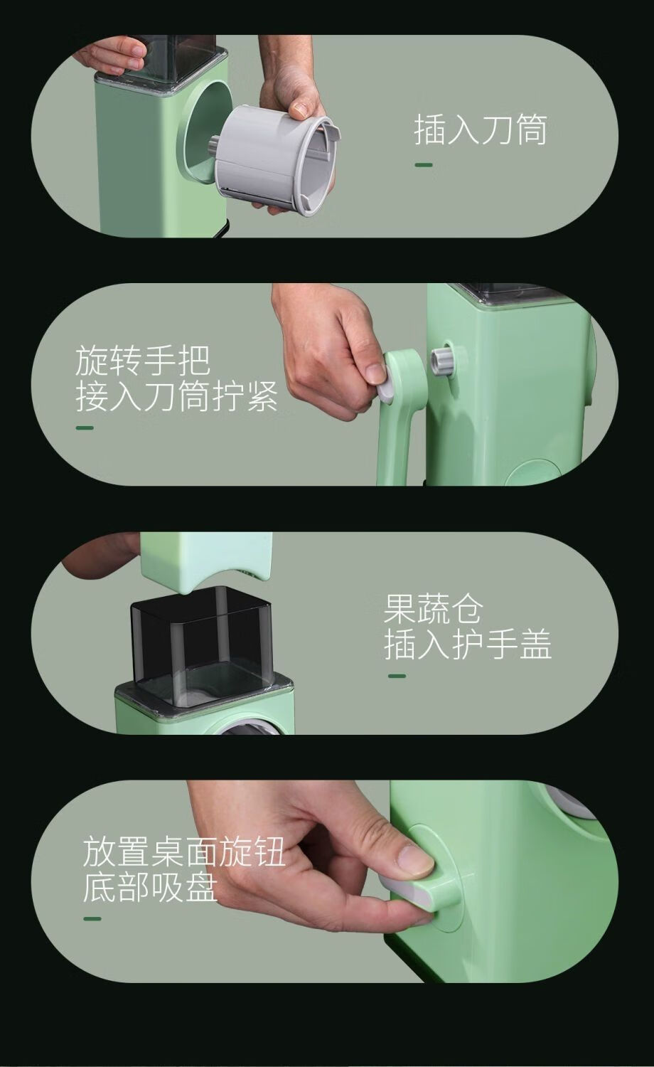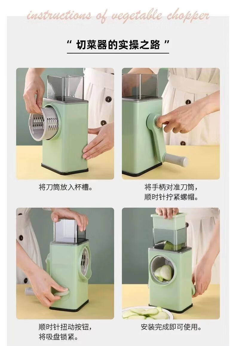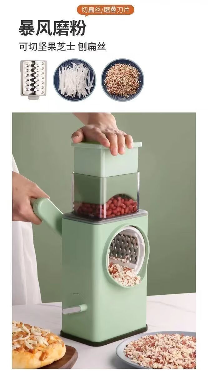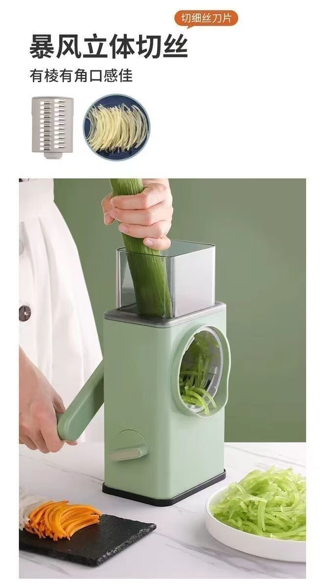 Rotary vegetable cutting artifact, peeling, shredding and slicing, three-in-one drum vegetable cutter, grater, kitchen cutting tool, elegant green color