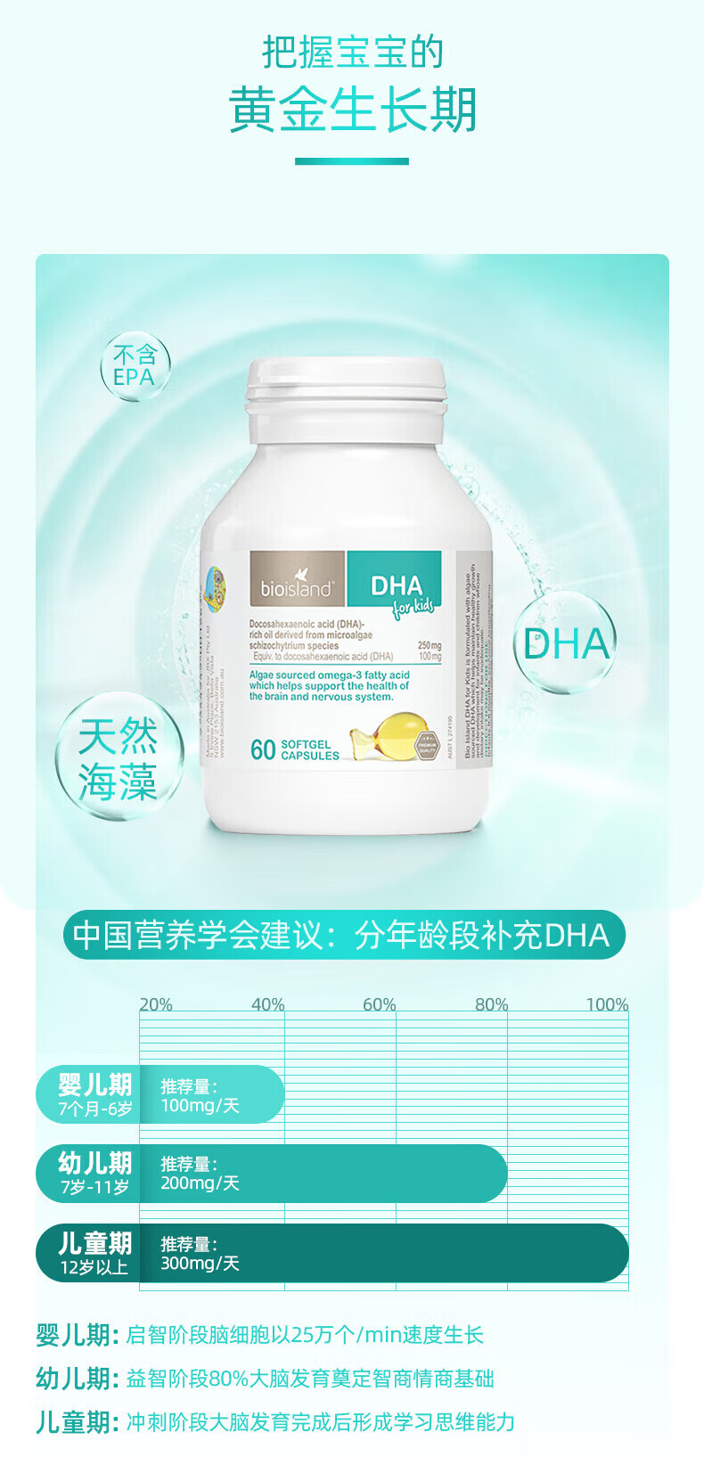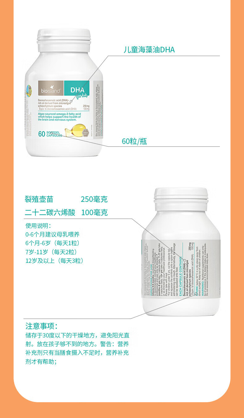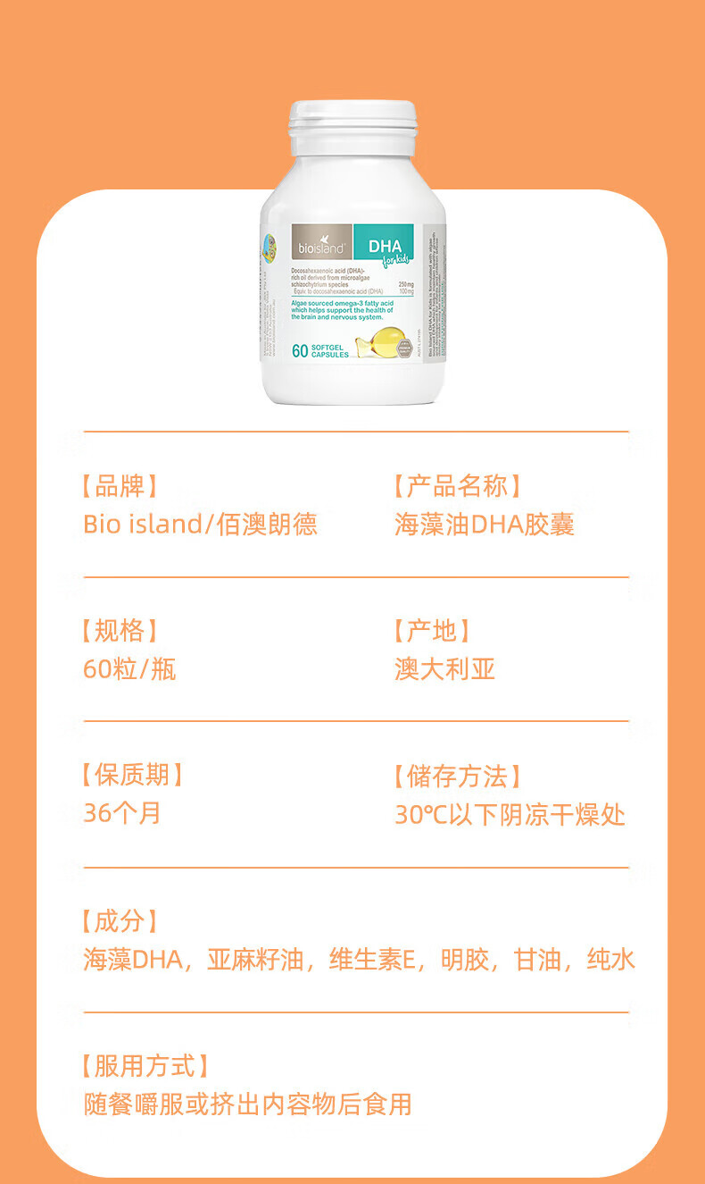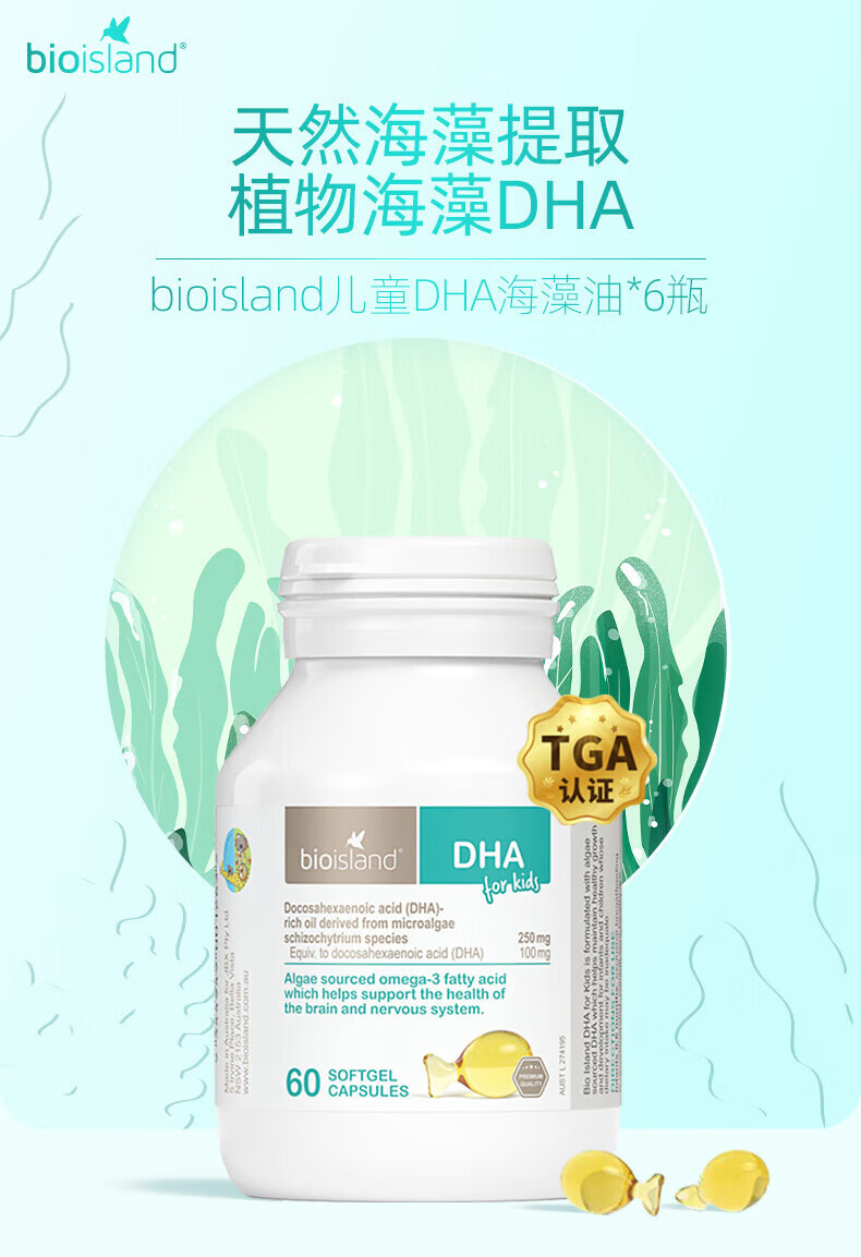 Bio Island Bio Island Children's DHA Seaweed Oil Capsules 60 Capsules Infants and Young Children DHA Brain and Eyesight Infants and Young Children DHA 60 Capsules