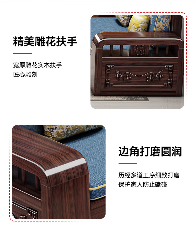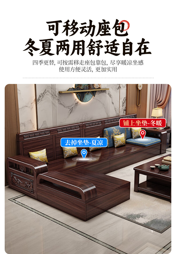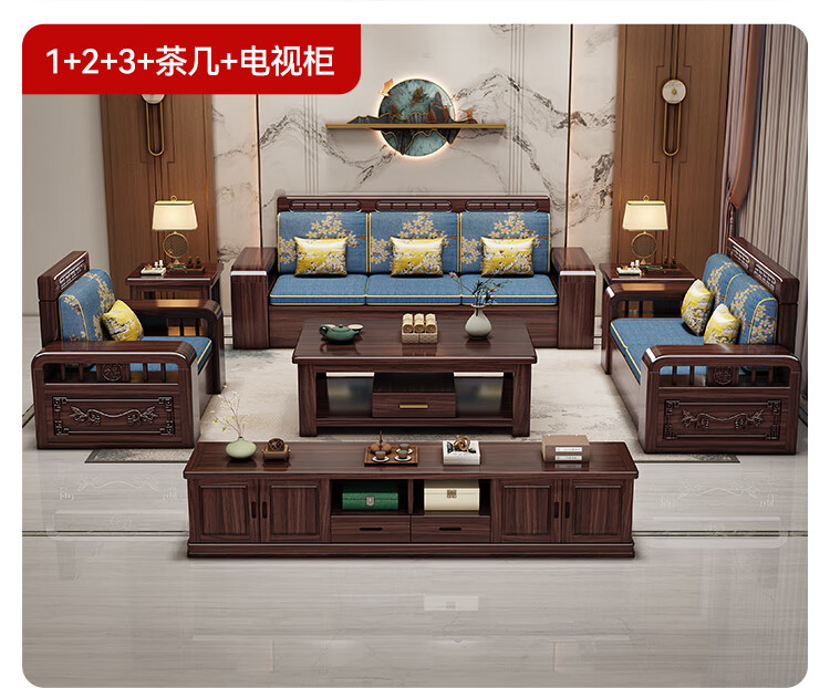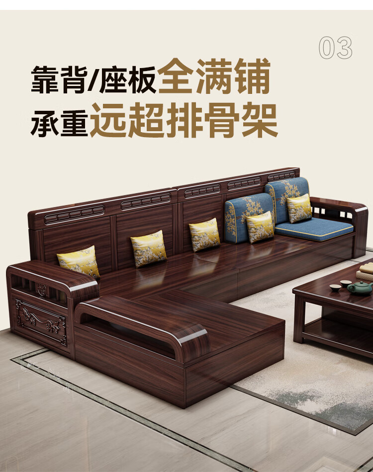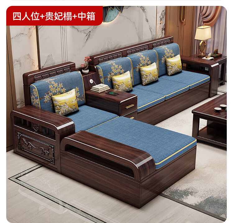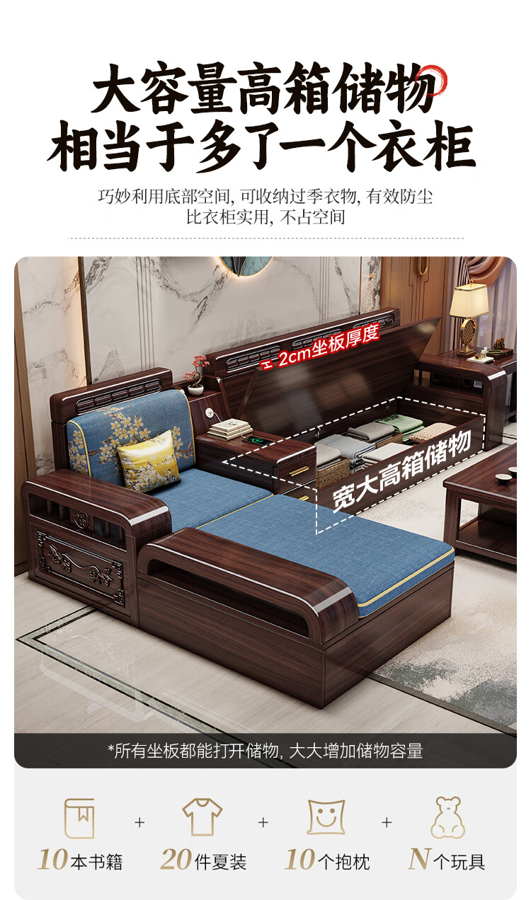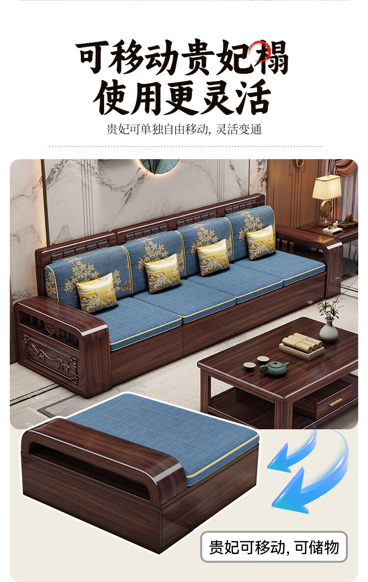 Lanxuan new Chinese style purple sandalwood solid wood sofa living room home small apartment three-seat straight-row carved storage sofa straight-row three-seat 2.1 meters cotton and linen style