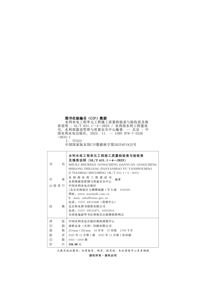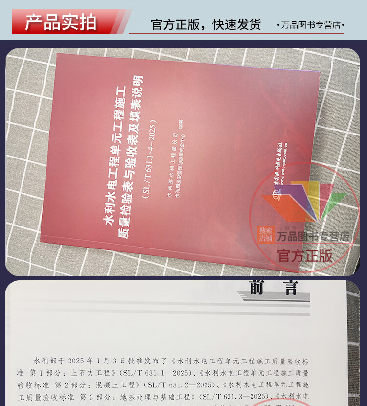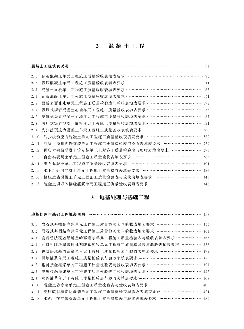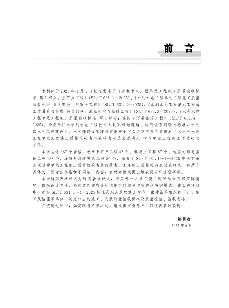 New version in 2025 SL/T 631-2025 Construction quality acceptance standards for unit projects of water conservancy and hydropower projects SL631.1 Earthwork projects SL631.2 Concrete projects SL631.3 Foundation treatment 631.4 Embankments Construction quality acceptance standards for unit projects of water conservancy and hydropower projects