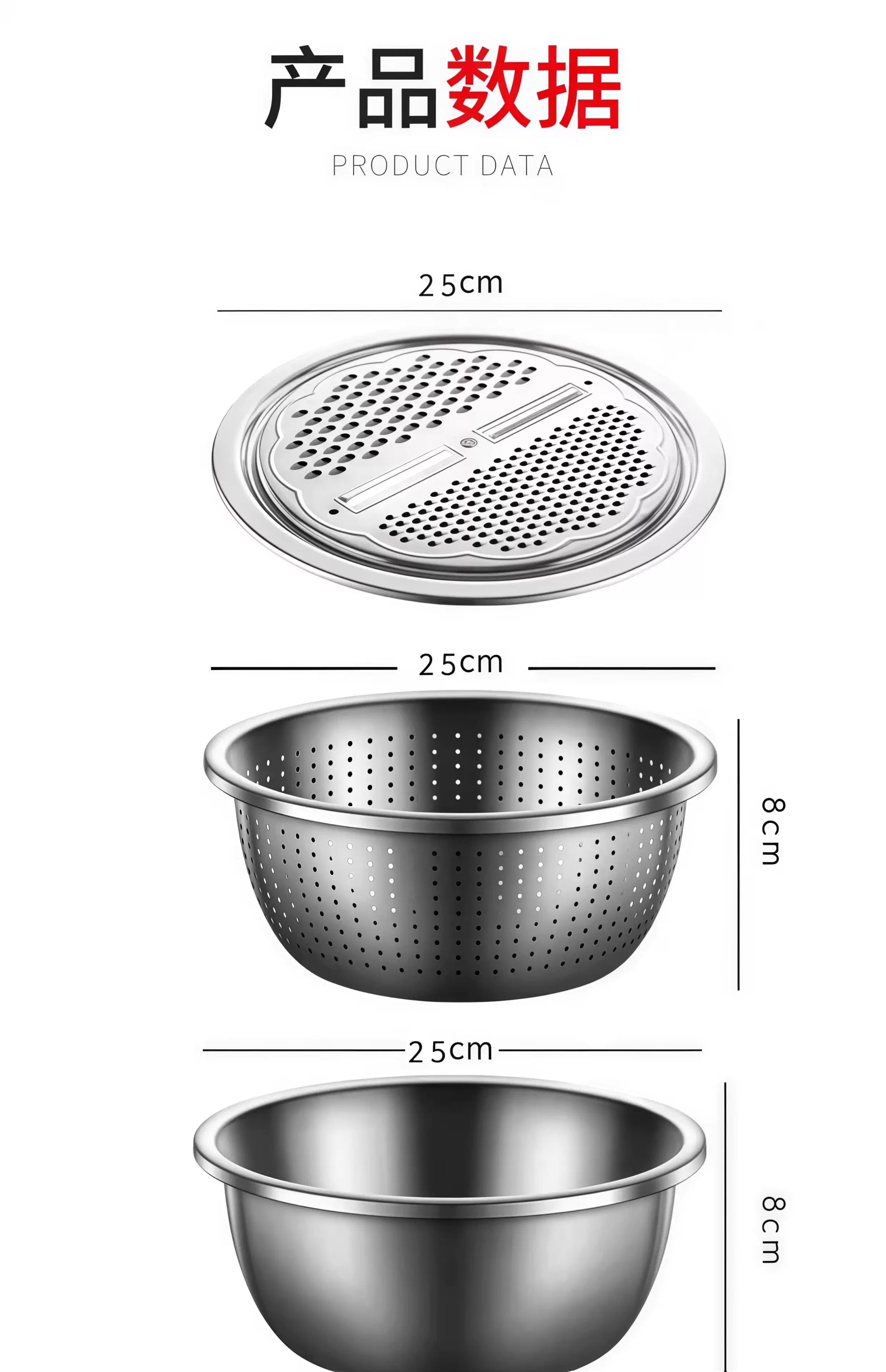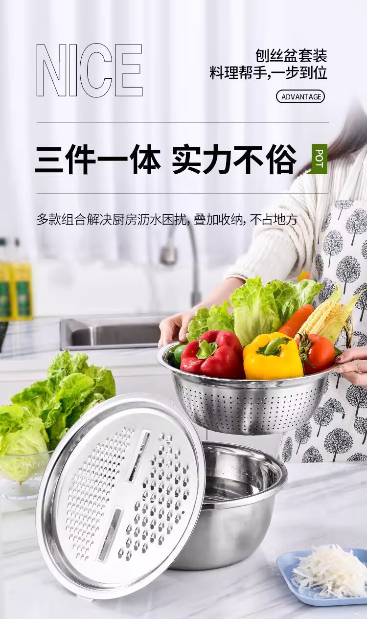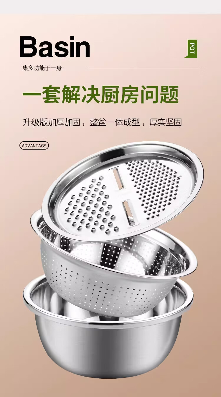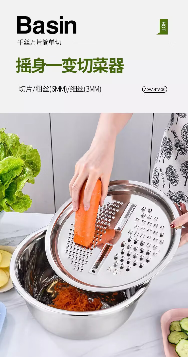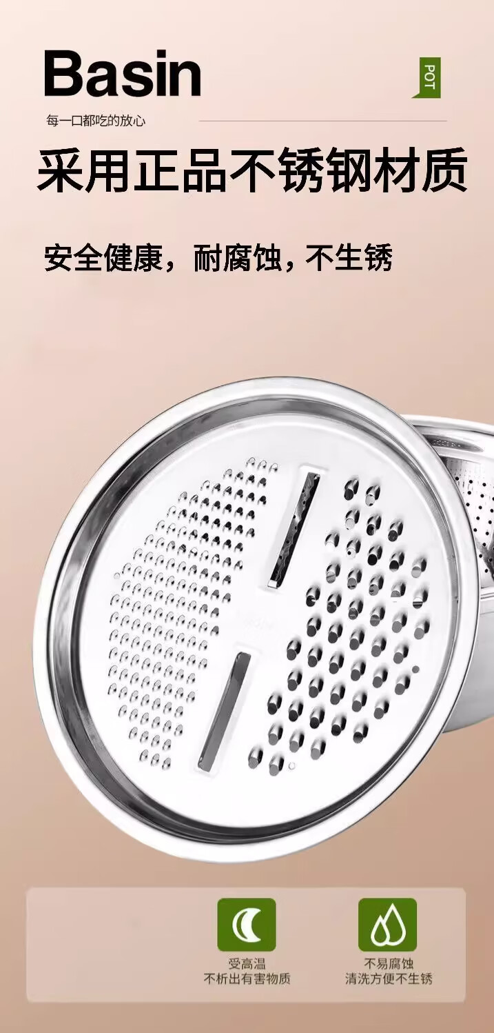 Xin Cong vegetable cutting basin multi-functional stainless steel food-grade grating plate potato slices vegetable radish grating piece grater artifact stainless steel three-piece set basin + drain basin + grating plate