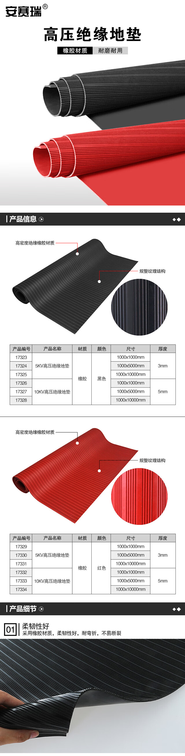 Ansery 5KV high voltage insulating floor mat (1 5m) laboratory workbench insulating rubber floor mat insulating mat rubber mat black horizontal stripes rubber/17324