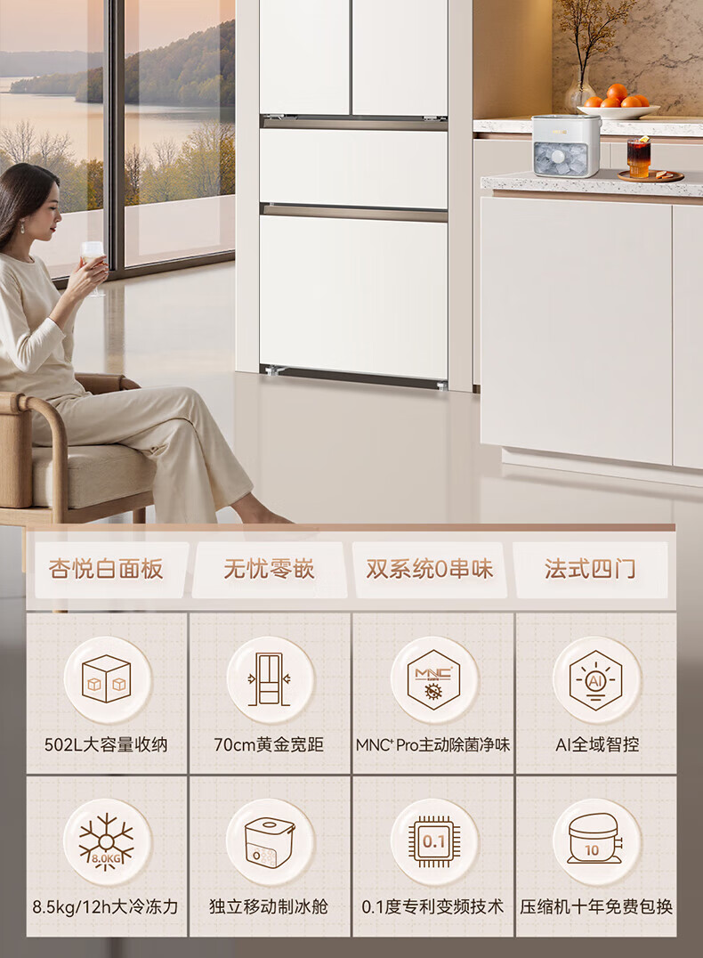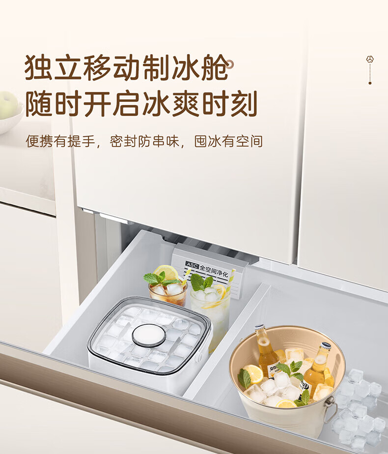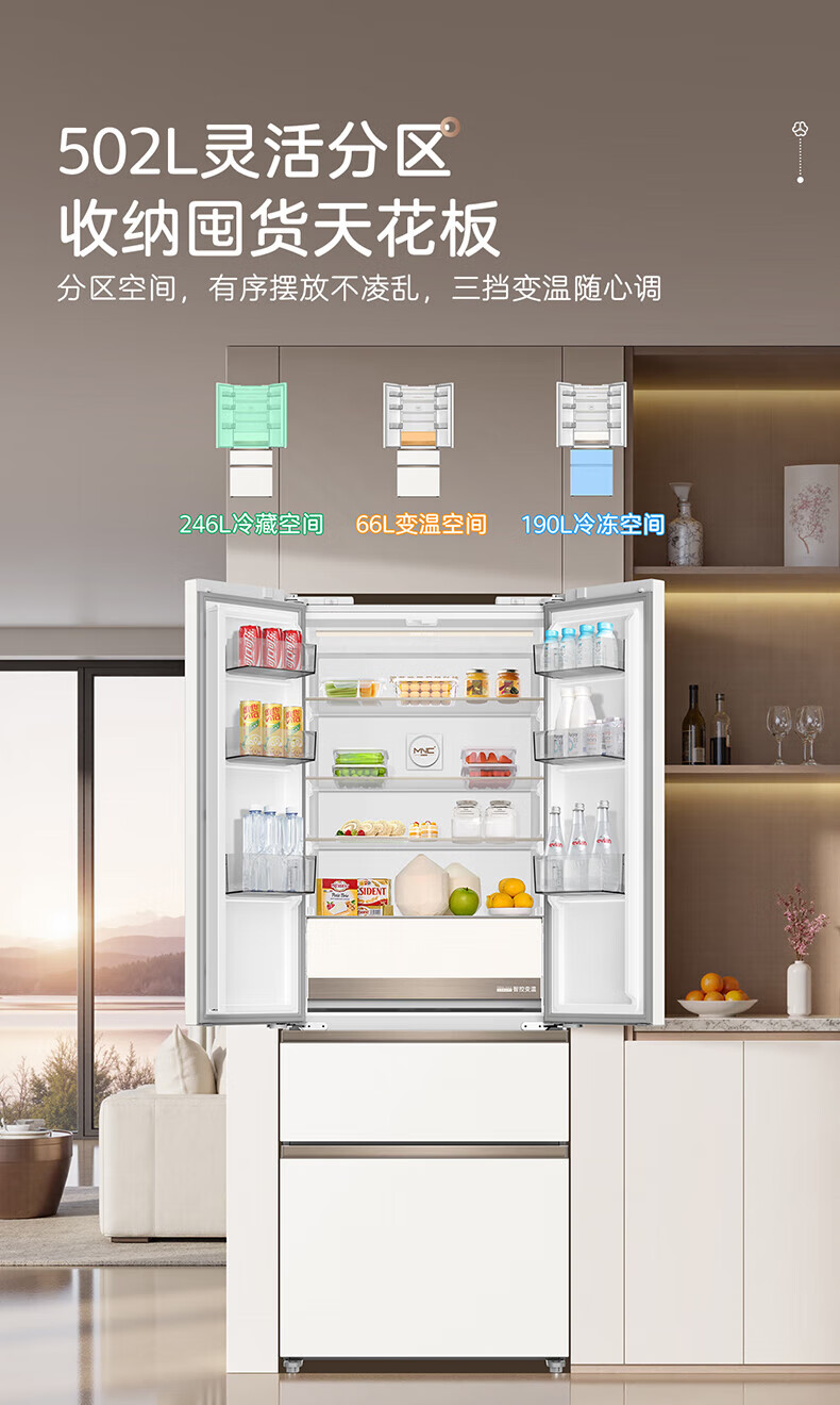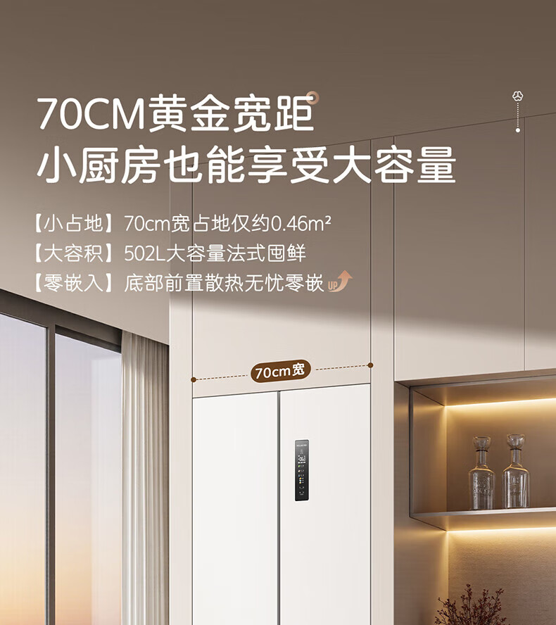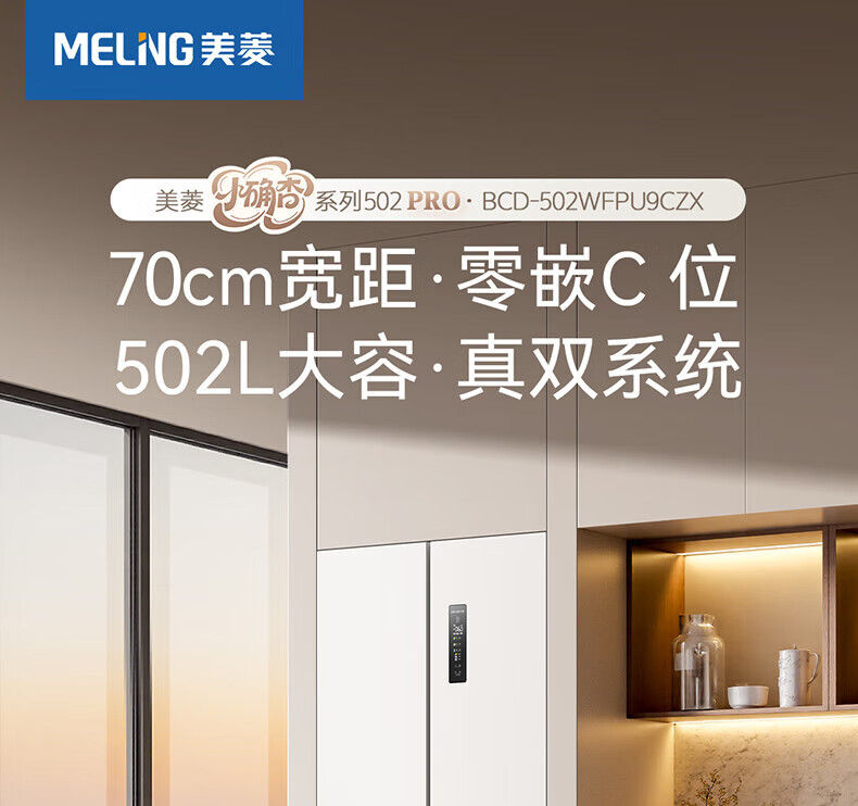 MeiLing Xiaoquexing 502-liter French multi-door dual-circulation dual-system active sterilization 70cm wide ultra-thin zero-embedded ice-making bottom cooling air-cooled frost-free household refrigerator subsidy