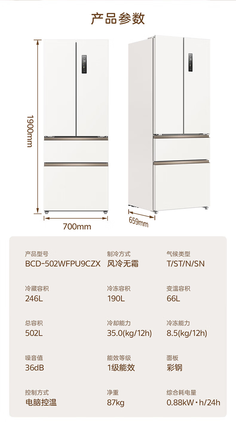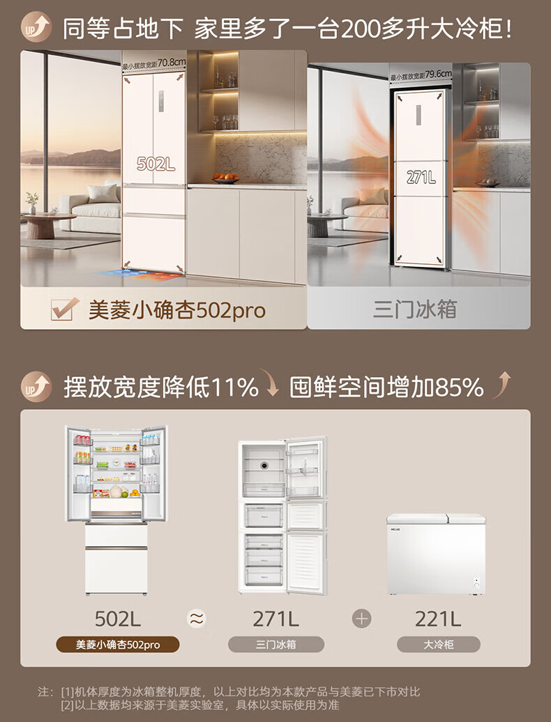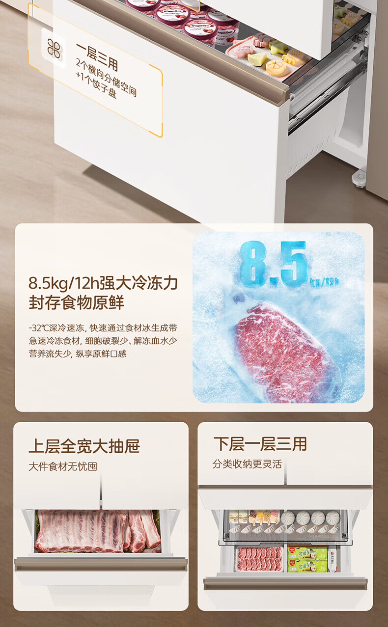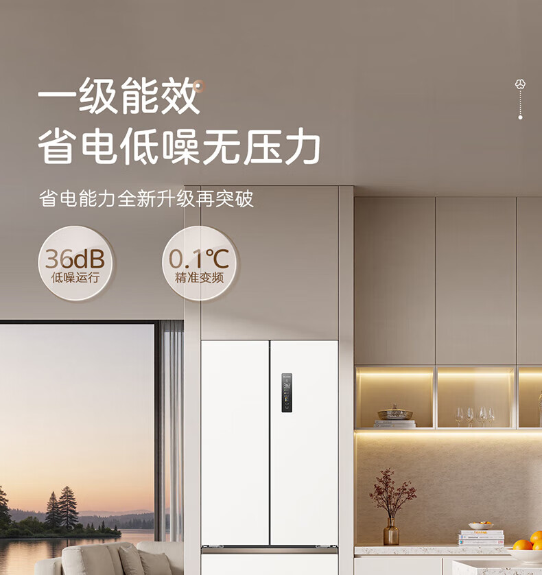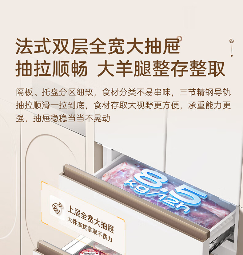 MeiLing Xiaoquexing 502-liter French multi-door dual-circulation dual-system active sterilization 70cm wide ultra-thin zero-embedded ice-making bottom cooling air-cooled frost-free household refrigerator subsidy