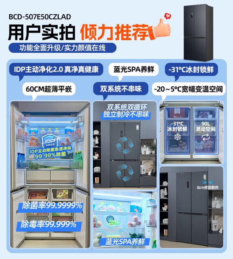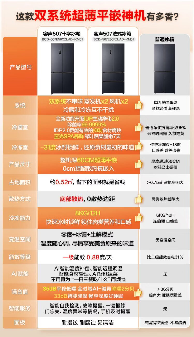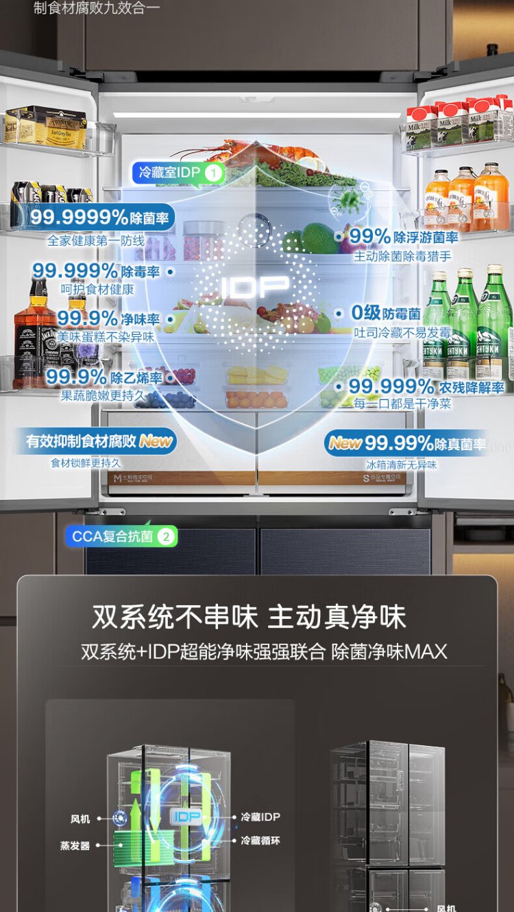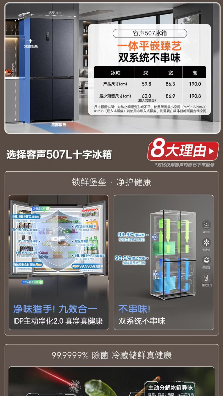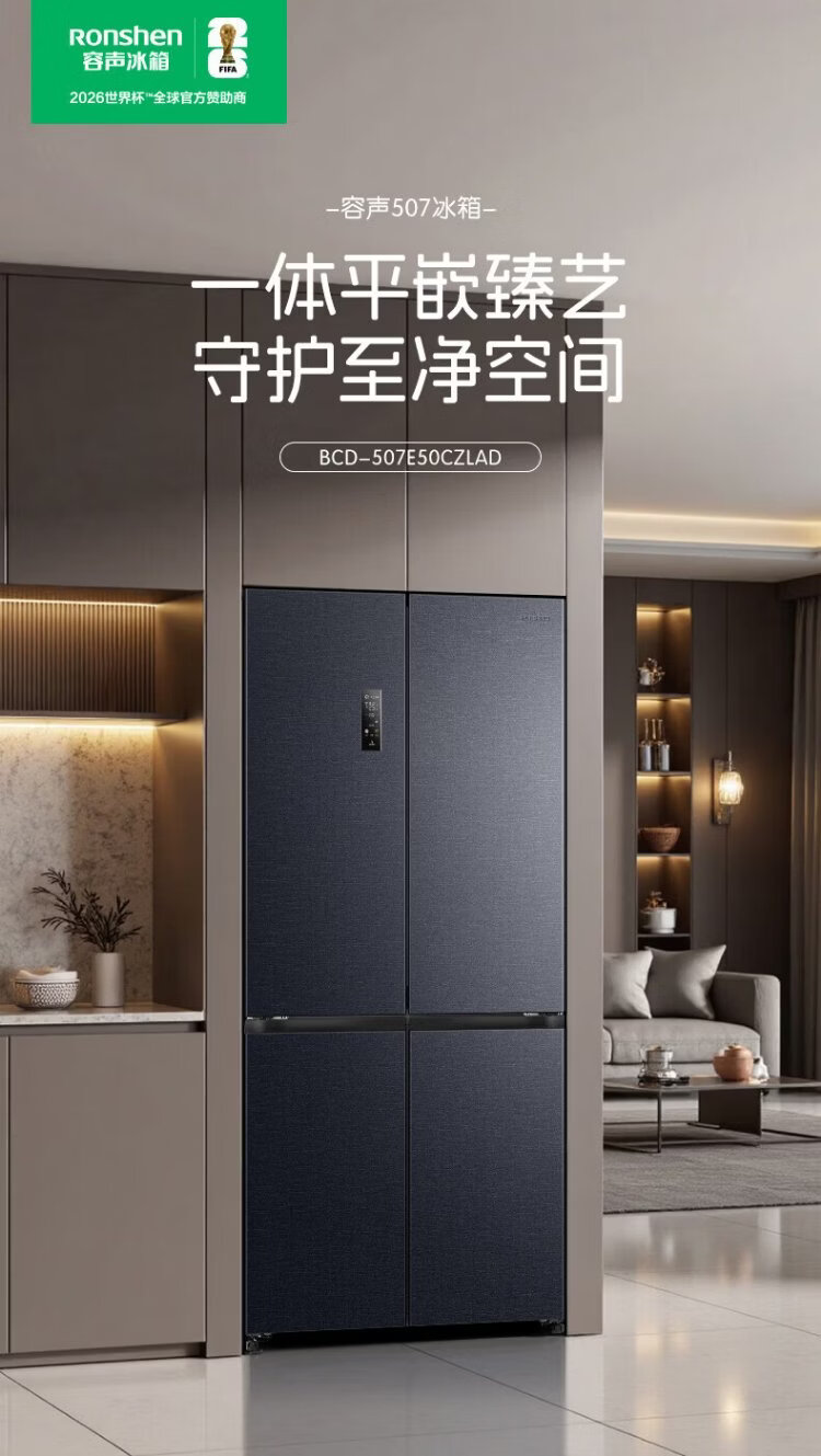 Rongsheng IDP net flavor 507L cross-door refrigerator active sterilization dual system ultra-thin zero embedded first-level energy efficiency air-cooled frost-free BCD-507E50CZLAD national subsidy dual system embedded | active sterilization | 507 cross