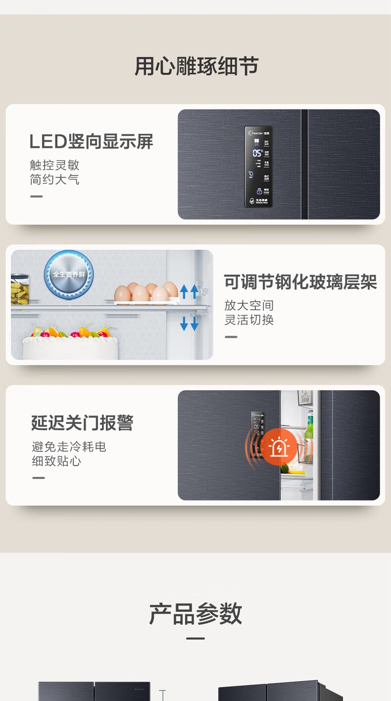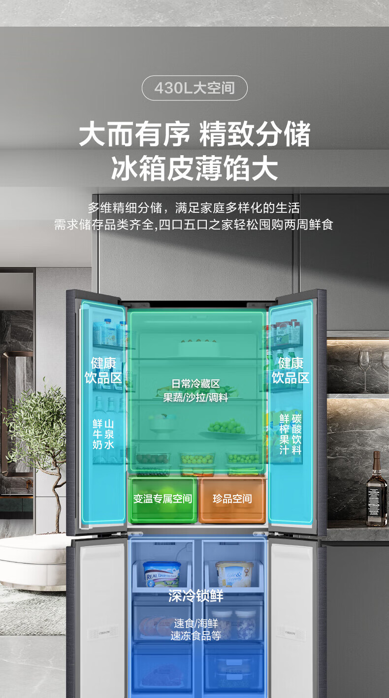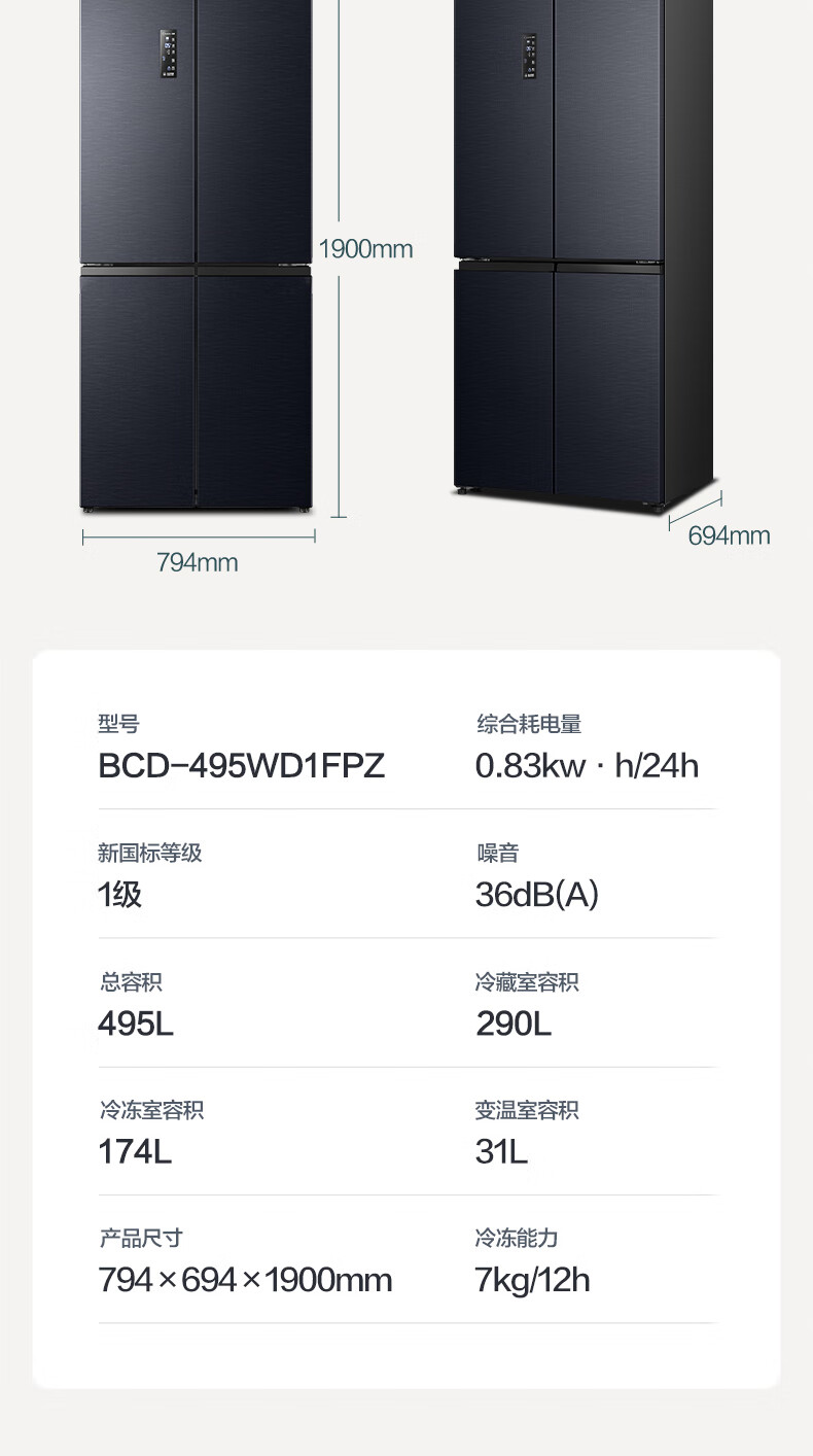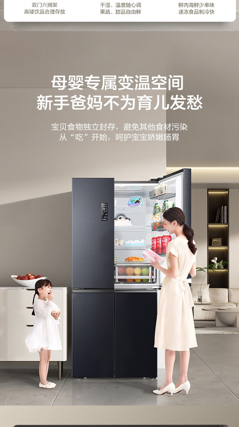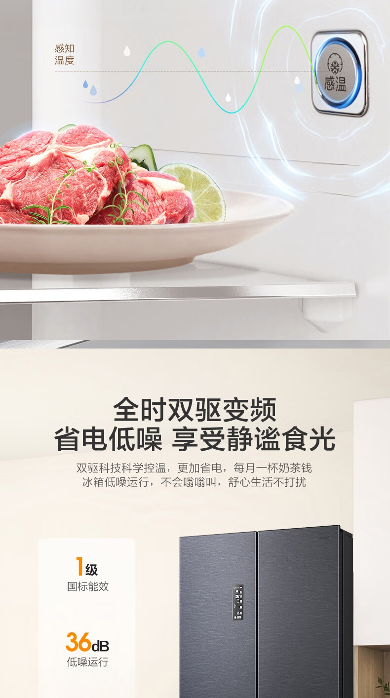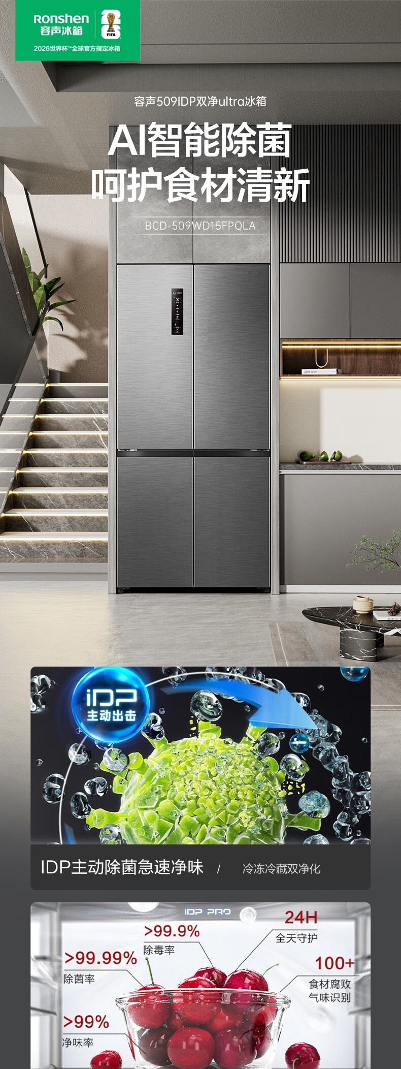 Ronshen Rongsheng cross door four-door double-door refrigerator first-class energy efficiency air-cooled frost-free household frequency conversion double cycle odor purification and sterilization 495 liters dual system active sterilization