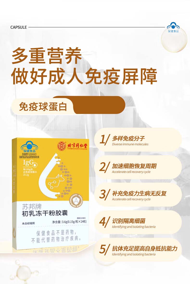 Beijing Tongrentang Immune Globulin Bovine Colostrum Capsules for adults, children, middle-aged and elderly people to regulate and improve resistance 10 boxes of standing pack 240 capsules * 10 boxes