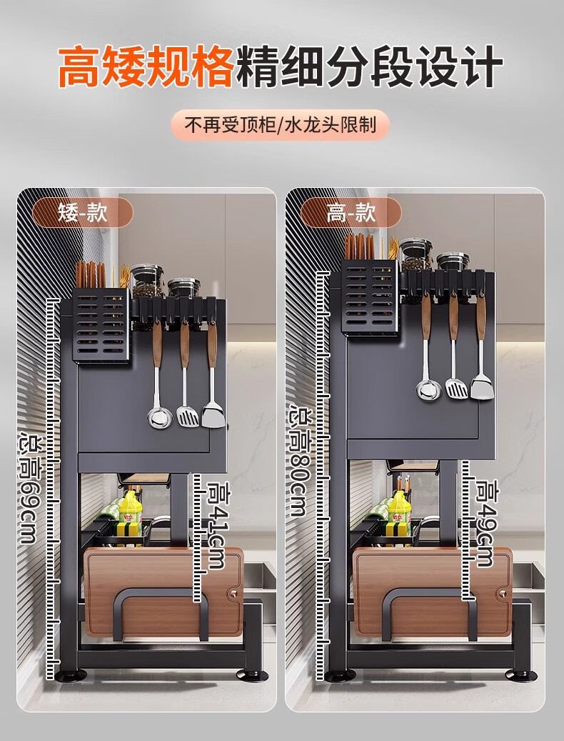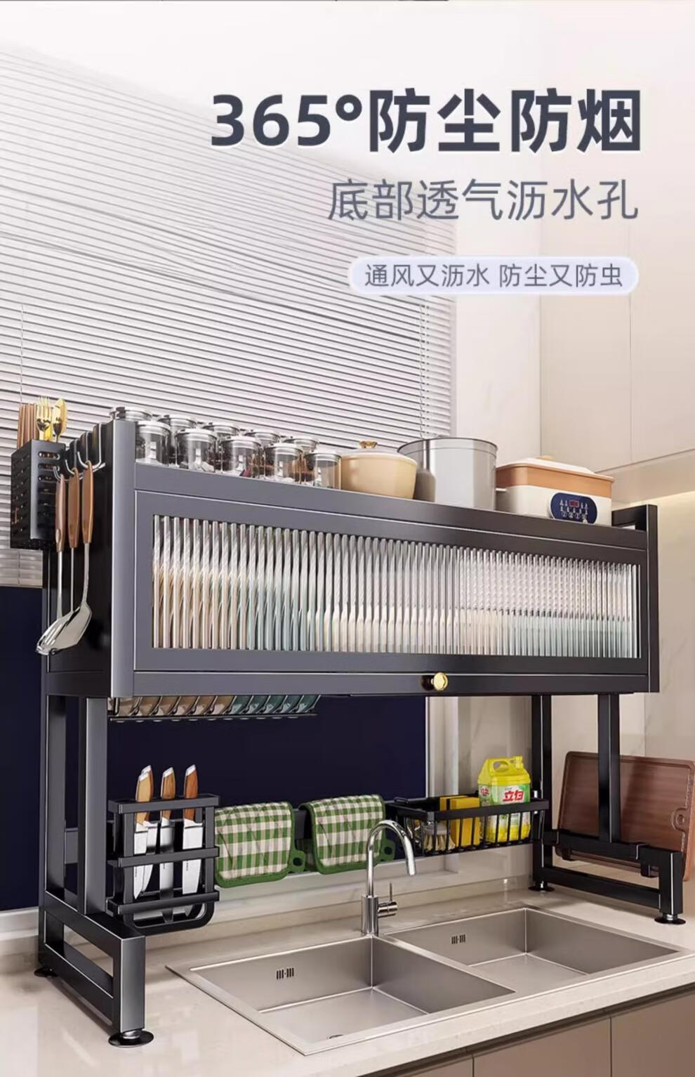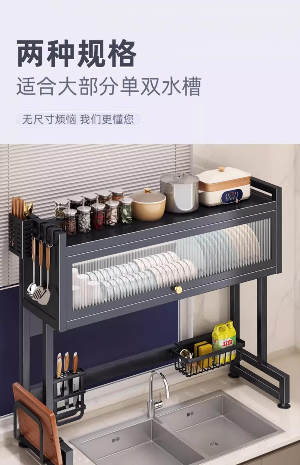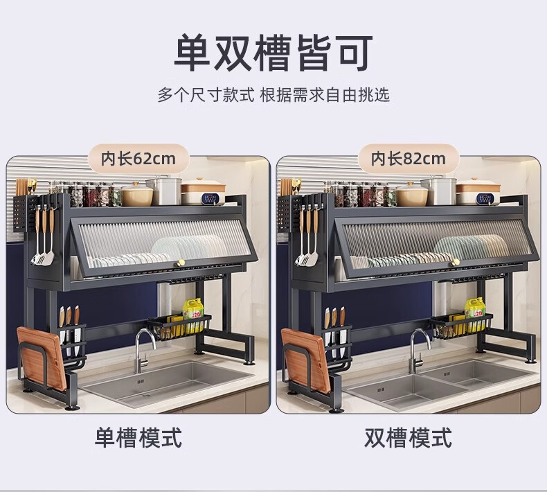 Jingyouyu German kitchen sink rack wash basin dustproof bowl counter top storage tableware multifunctional storage rack black - main rack length 65cm + 6 hooks
