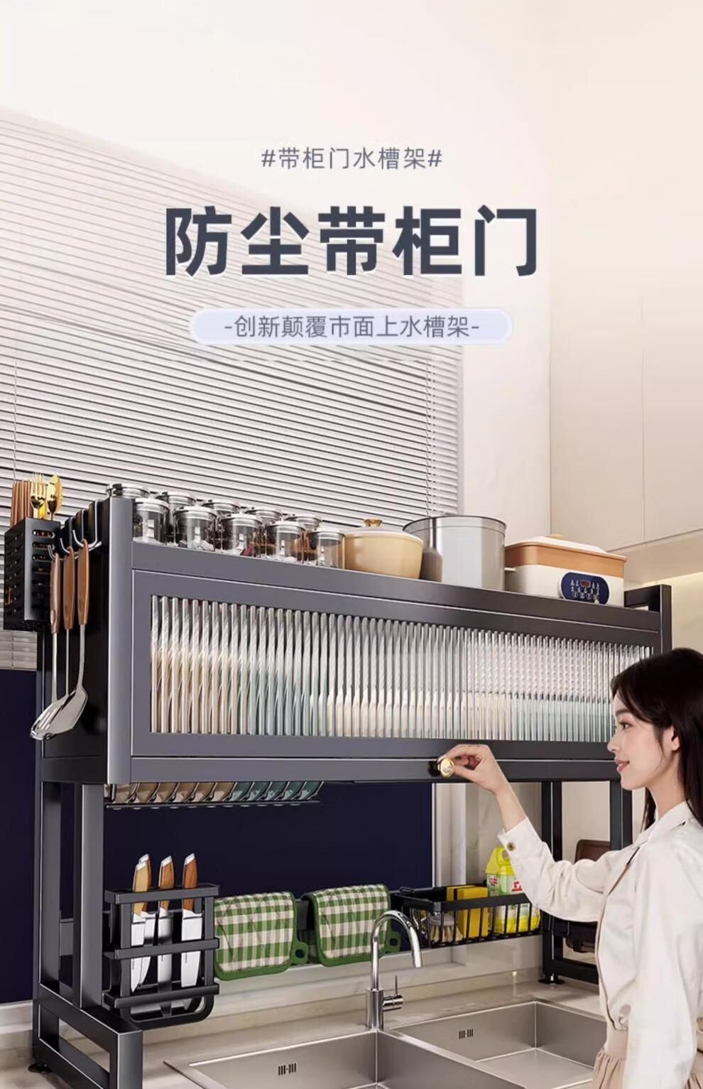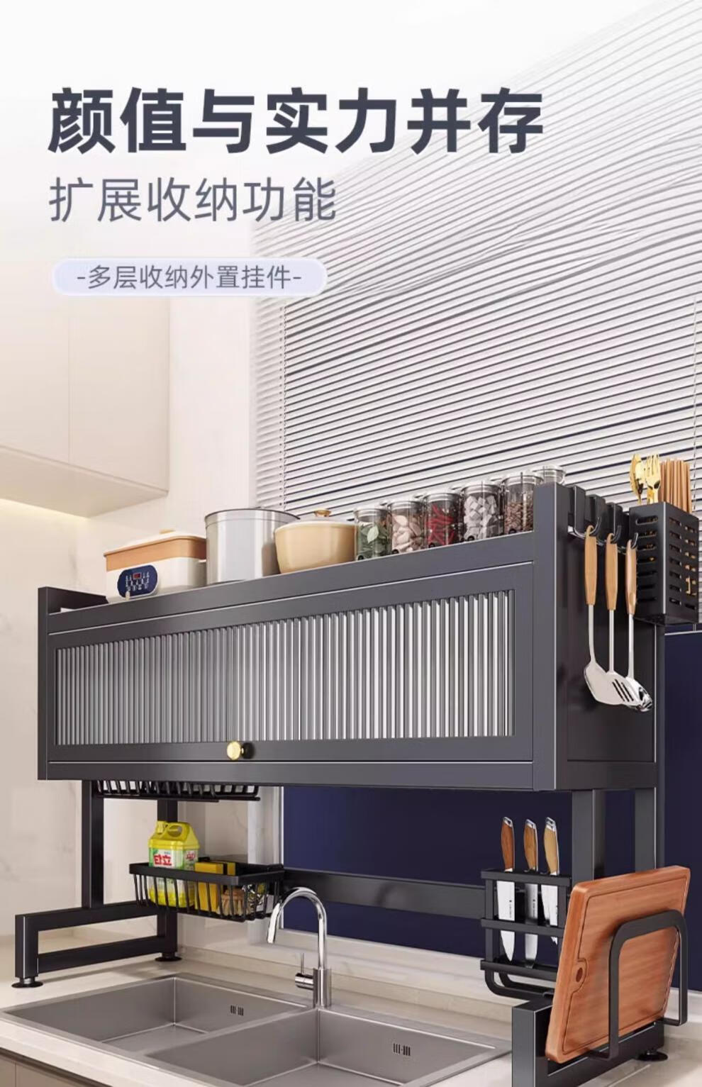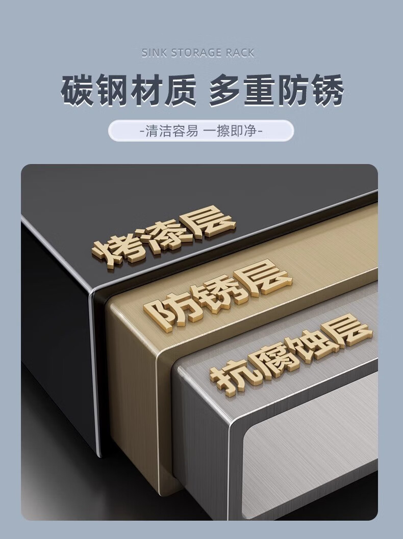 Jingyouyu German kitchen sink rack wash basin dustproof bowl counter top storage tableware multifunctional storage rack black - main rack length 65cm + 6 hooks