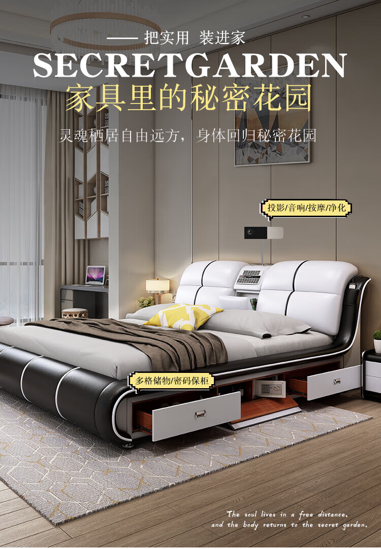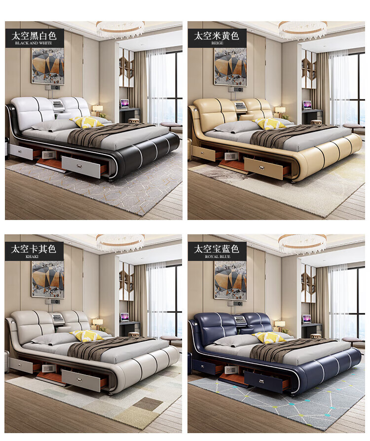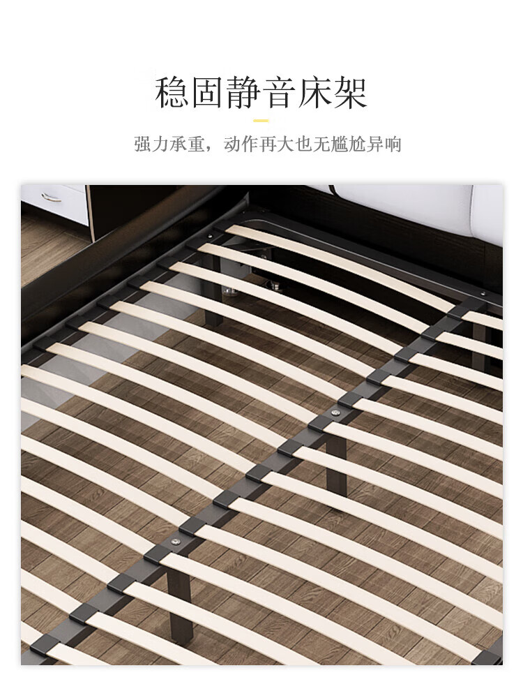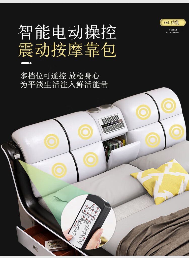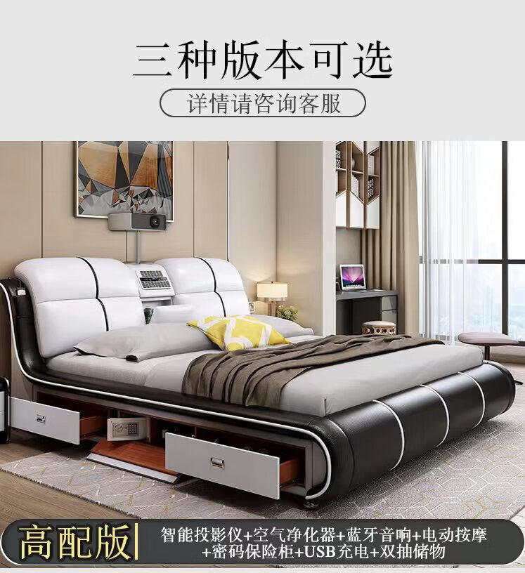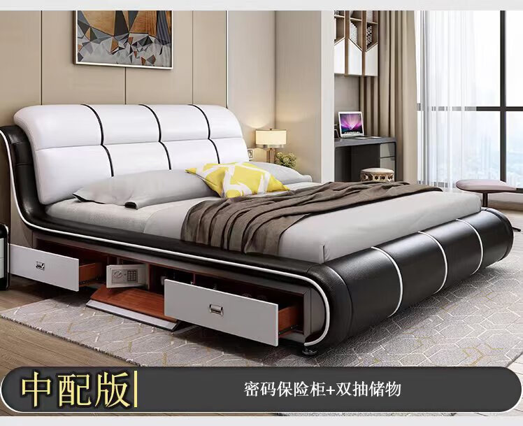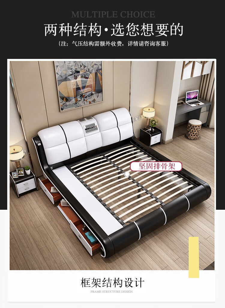 He Jiagong Leather Bed Multifunctional Electric Massage High Box Storage Double King Bed Master Bedroom Luxurious Soft Cover Wedding Bed Tatami Low Version Single Bed Without Mattress Bedside Table (Reactive 1500mm*2000mm Bracket Structure