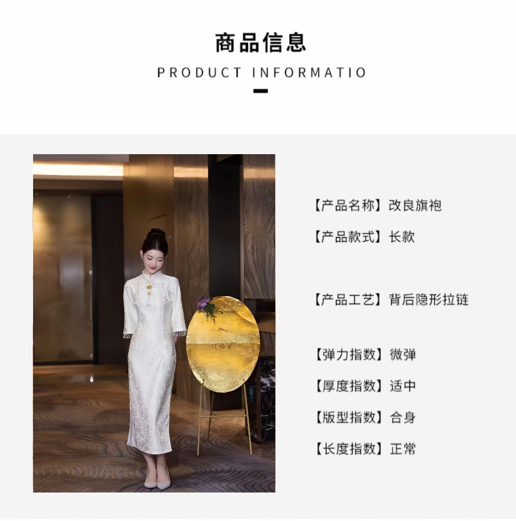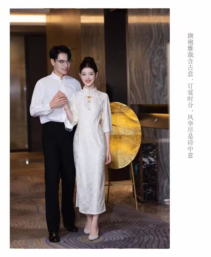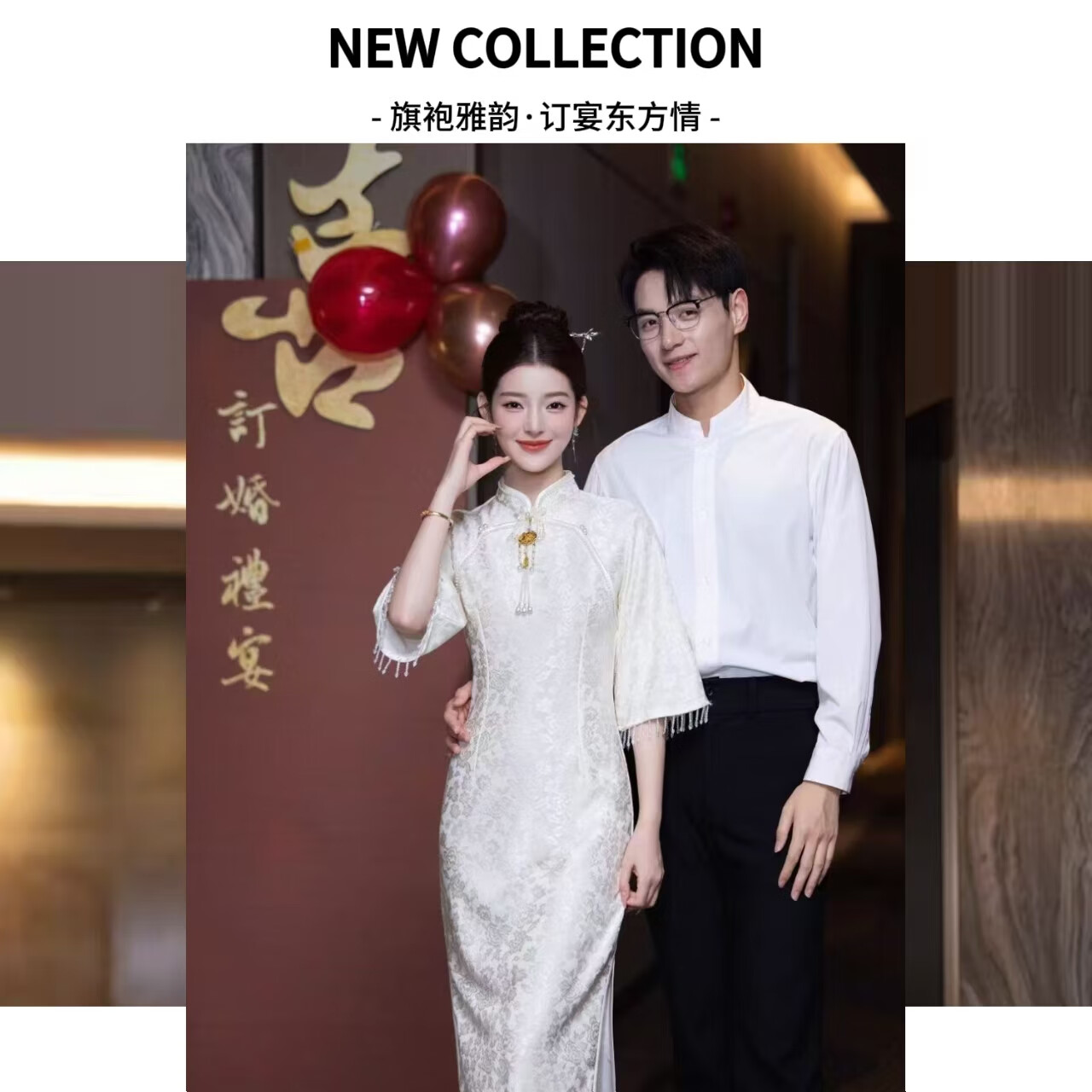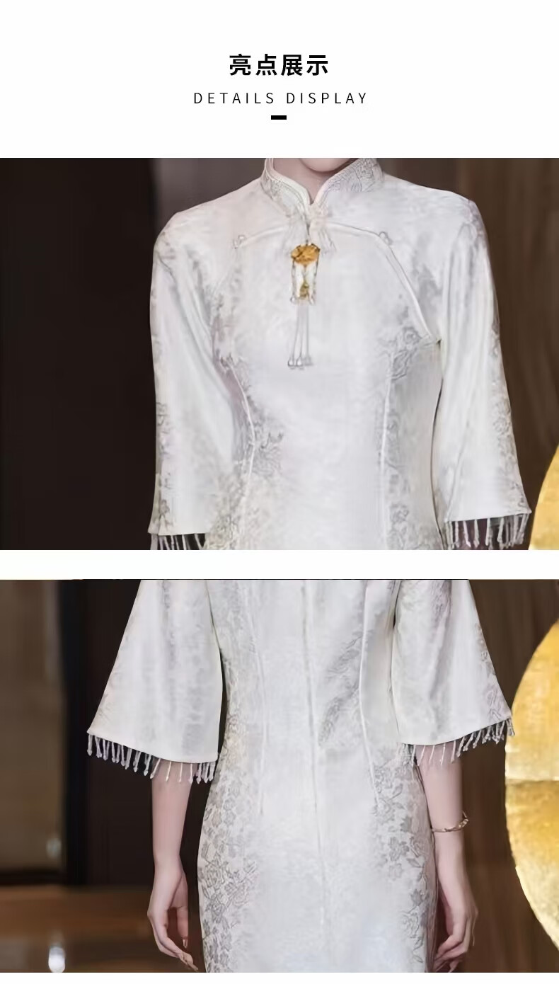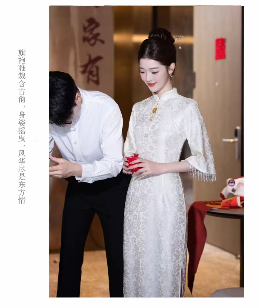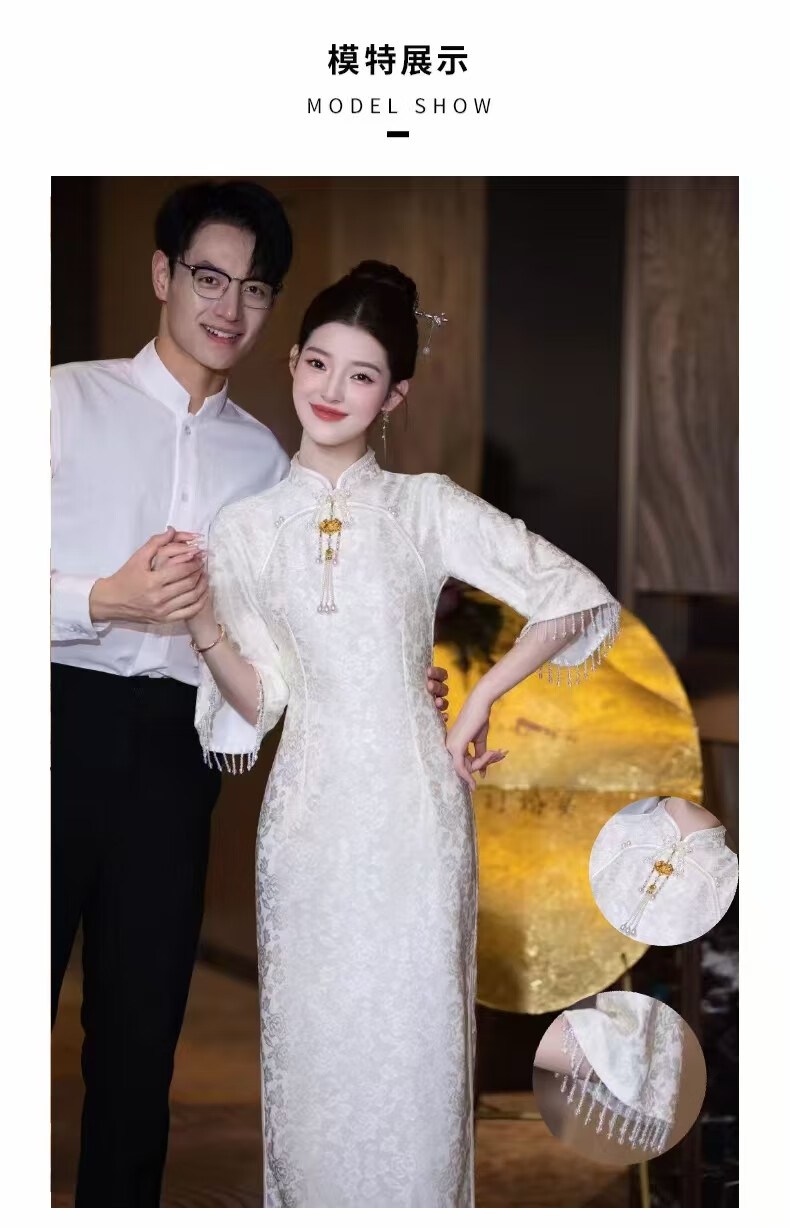 Cloth-style Chinese cheongsam toasting dress bride long-sleeved autumn and winter outing dress engagement dress white tassels off-white L