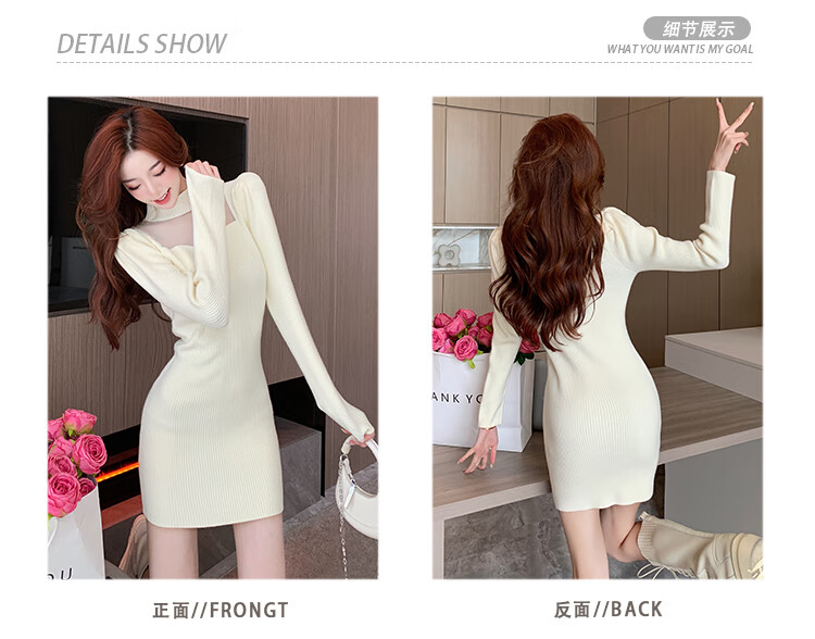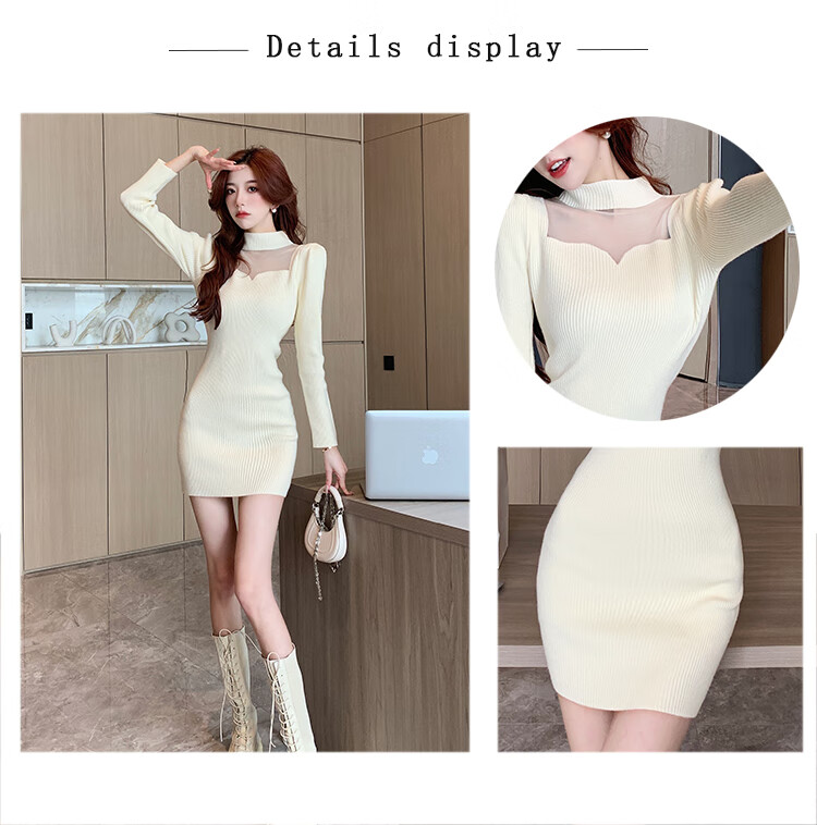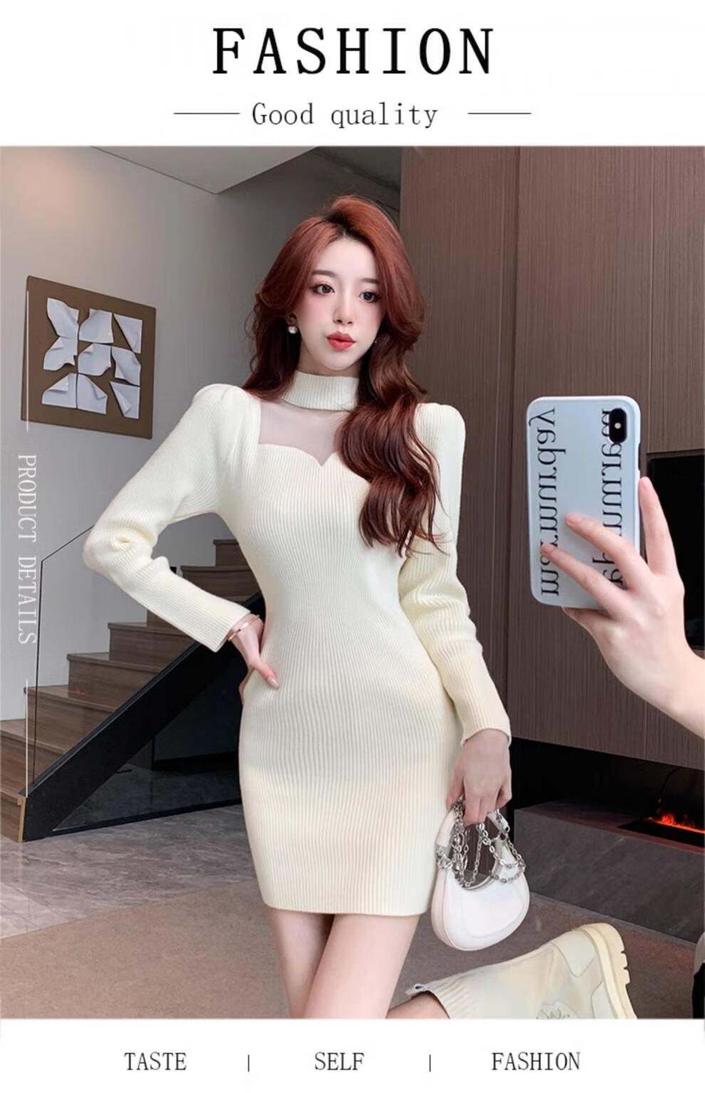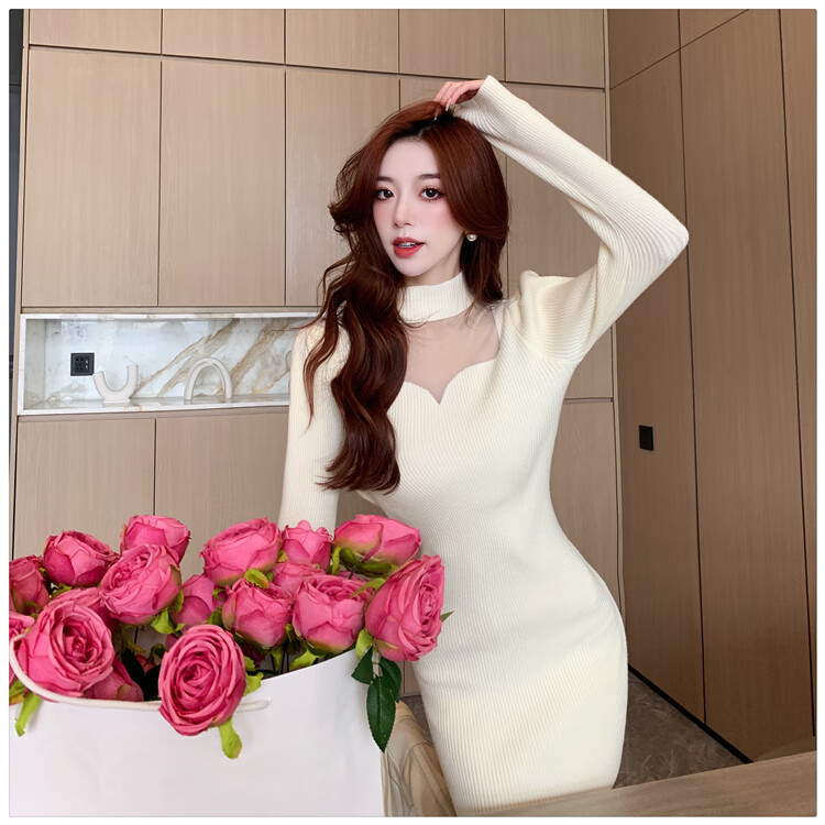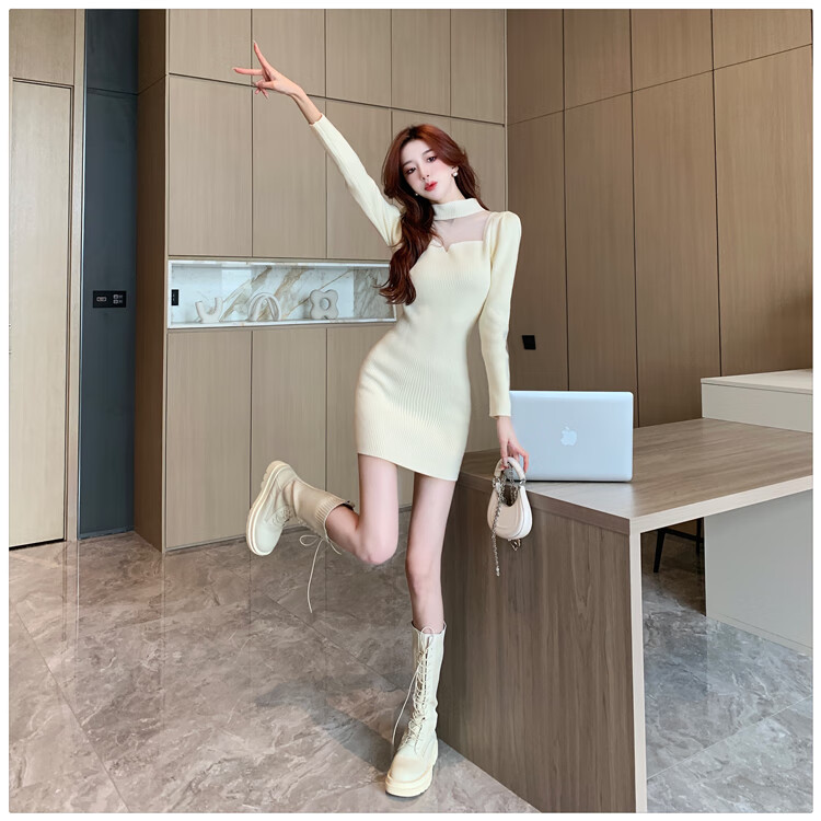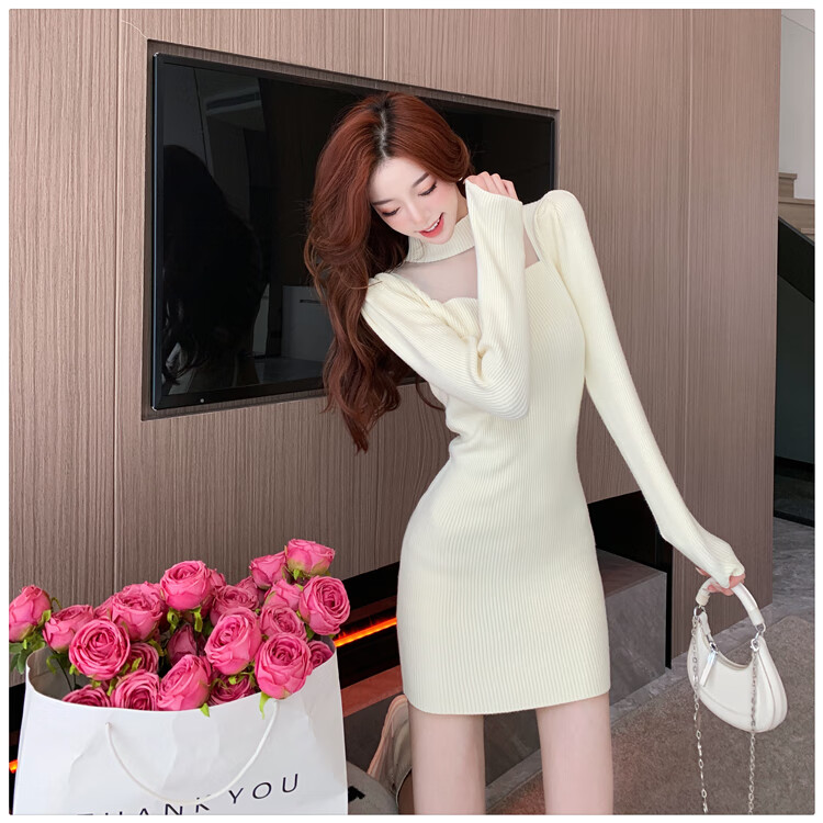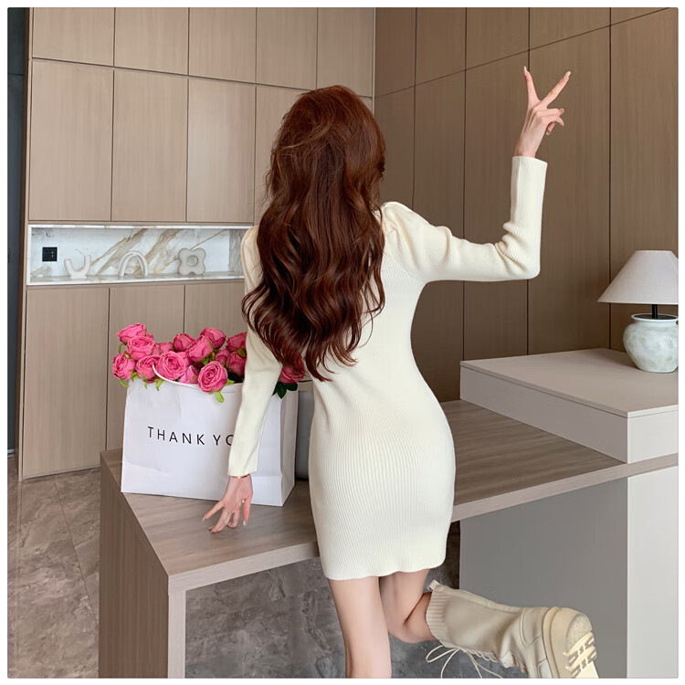 Yoekbird white knitted sweater dress for women autumn and winter 2025 new coat with bottoming slim fit hip skirt apricot style S recommended 80kg-90kg