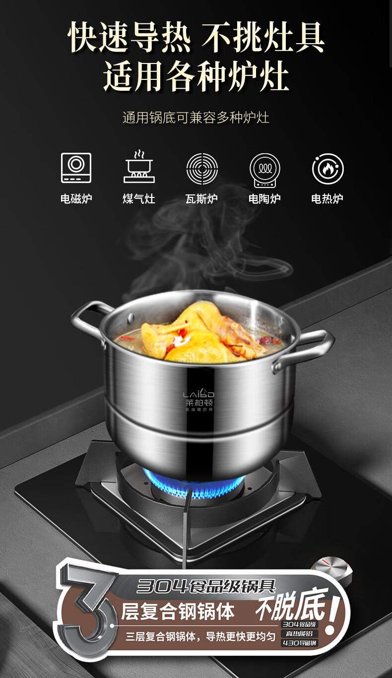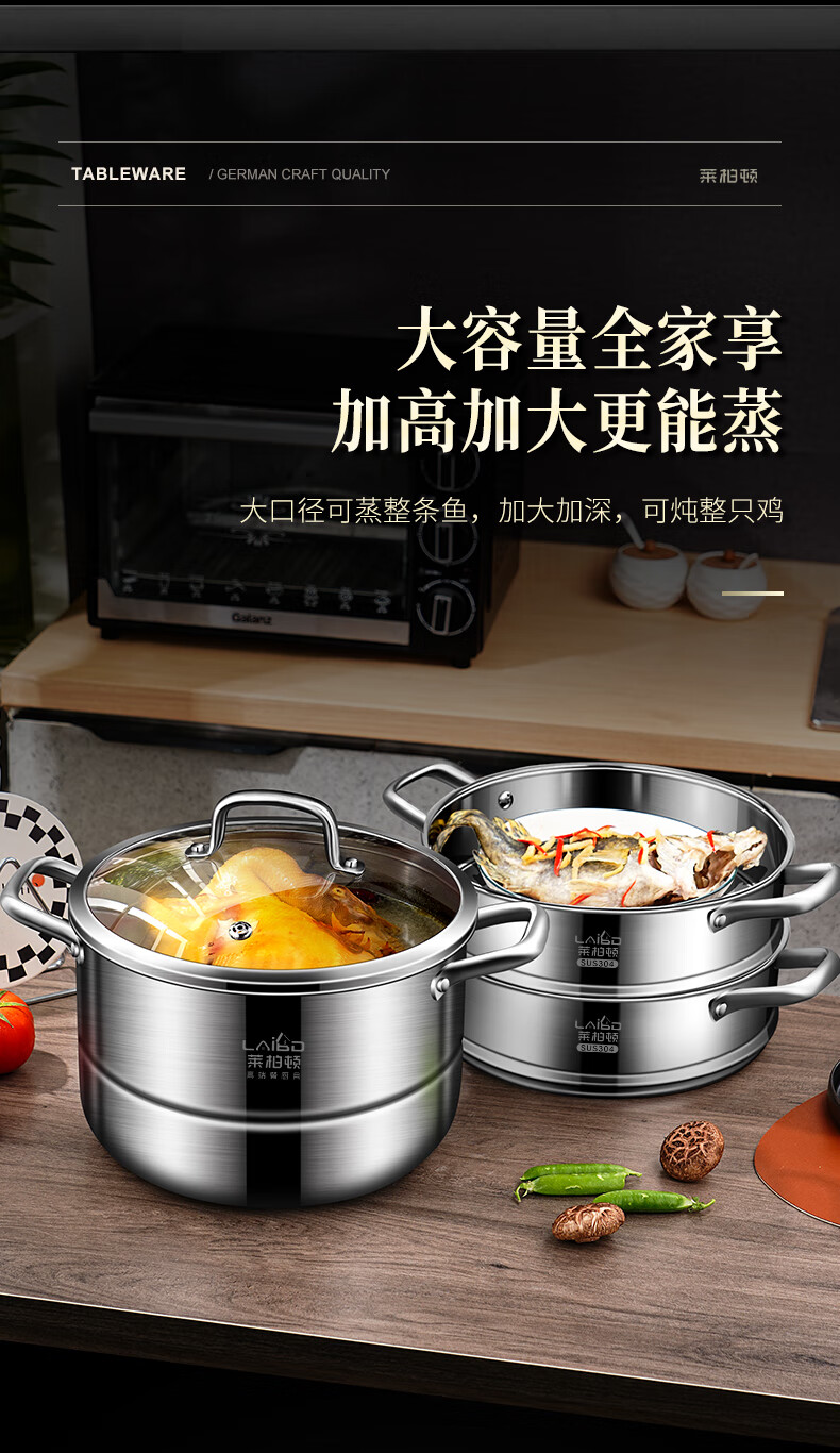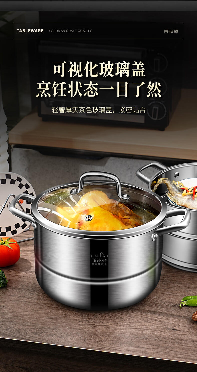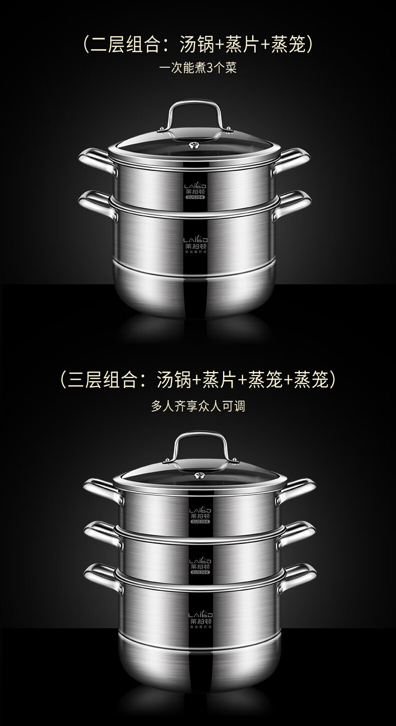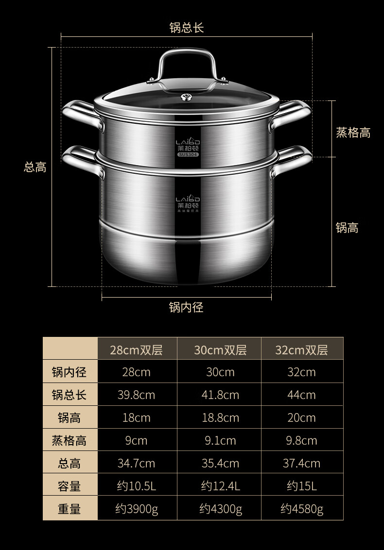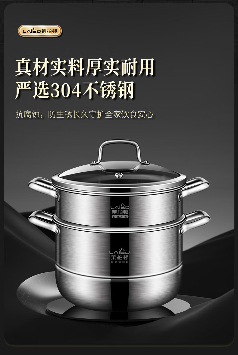 Labton 304 stainless steel steamer double-layer thickened steaming and cooking integrated soup pot with steamer steamer fish gas stove induction cooker universal 28cm three-layer steamer enlarged and thickened inner diameter 28cm