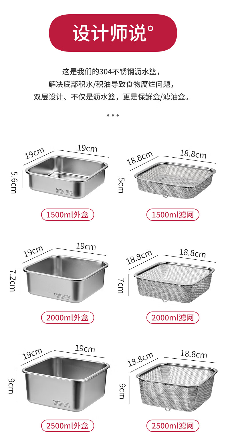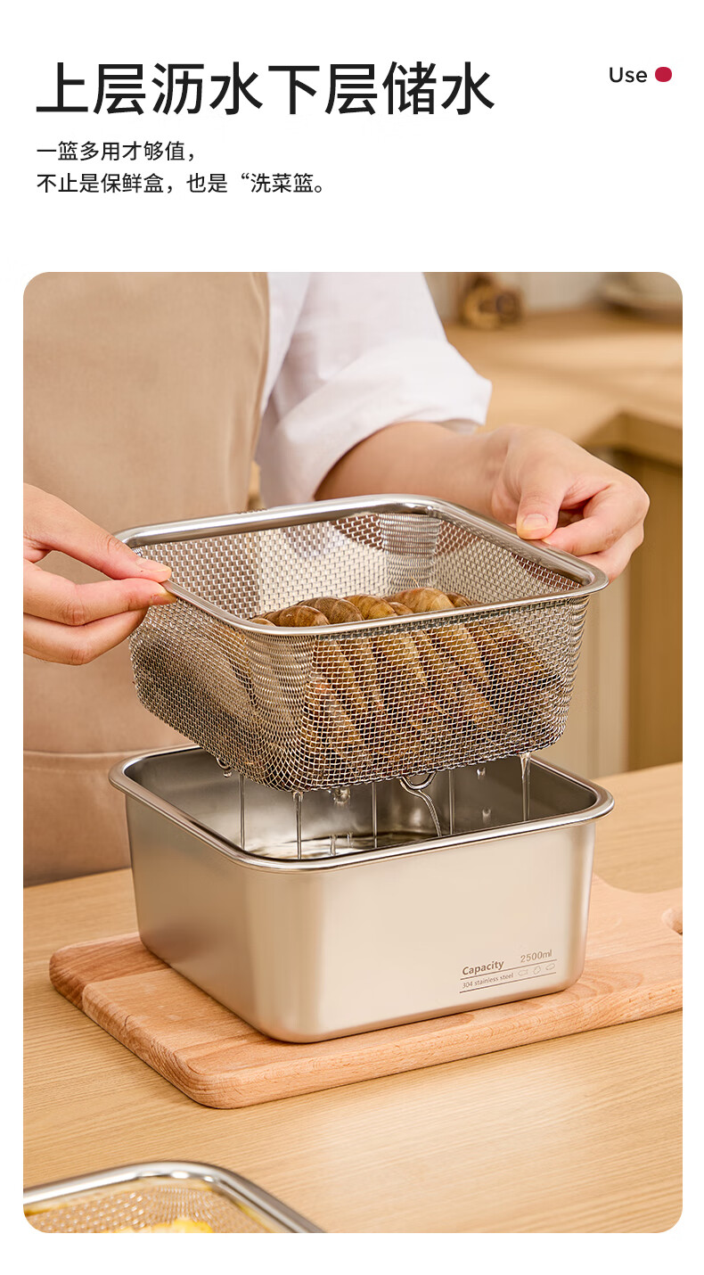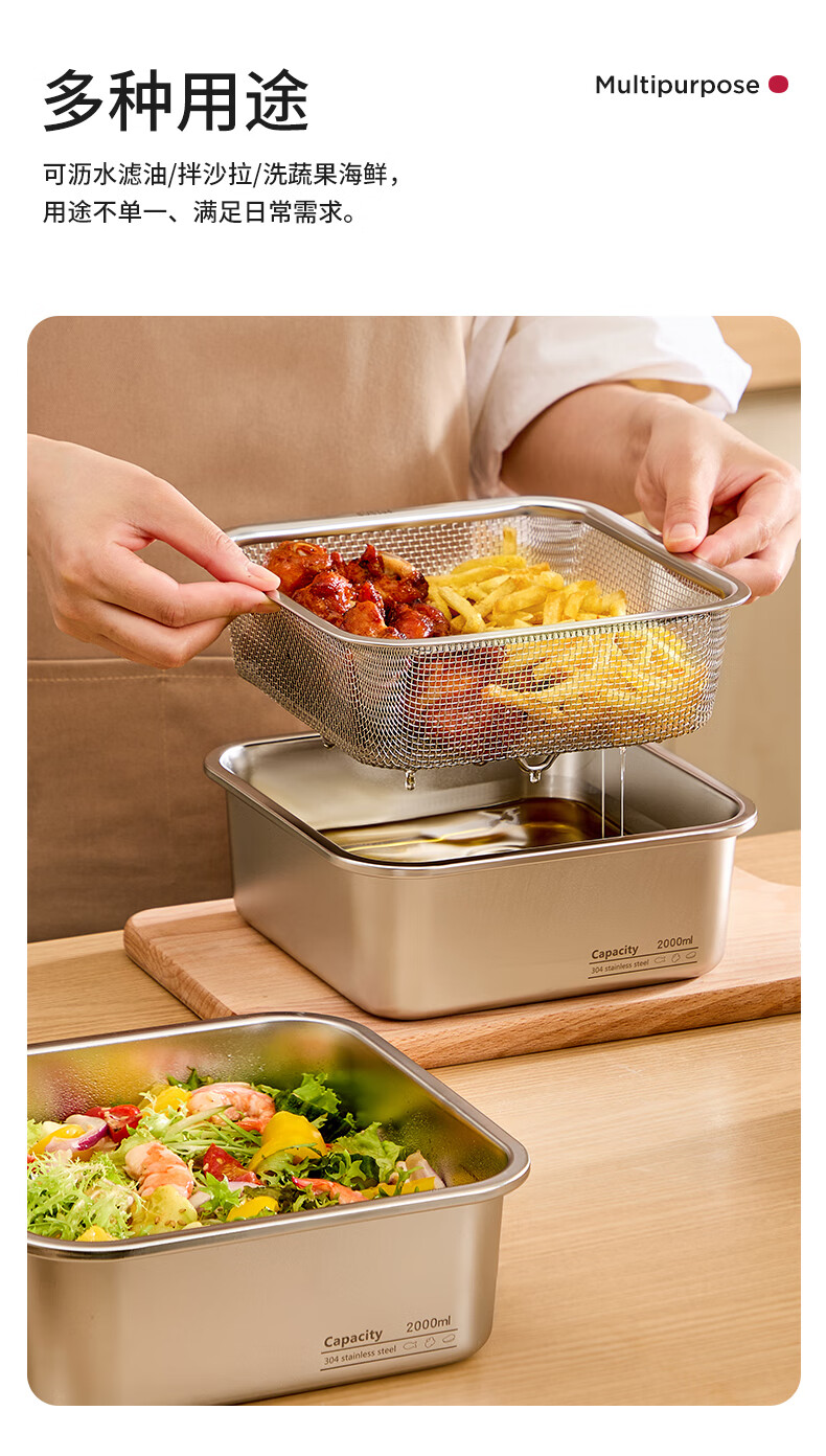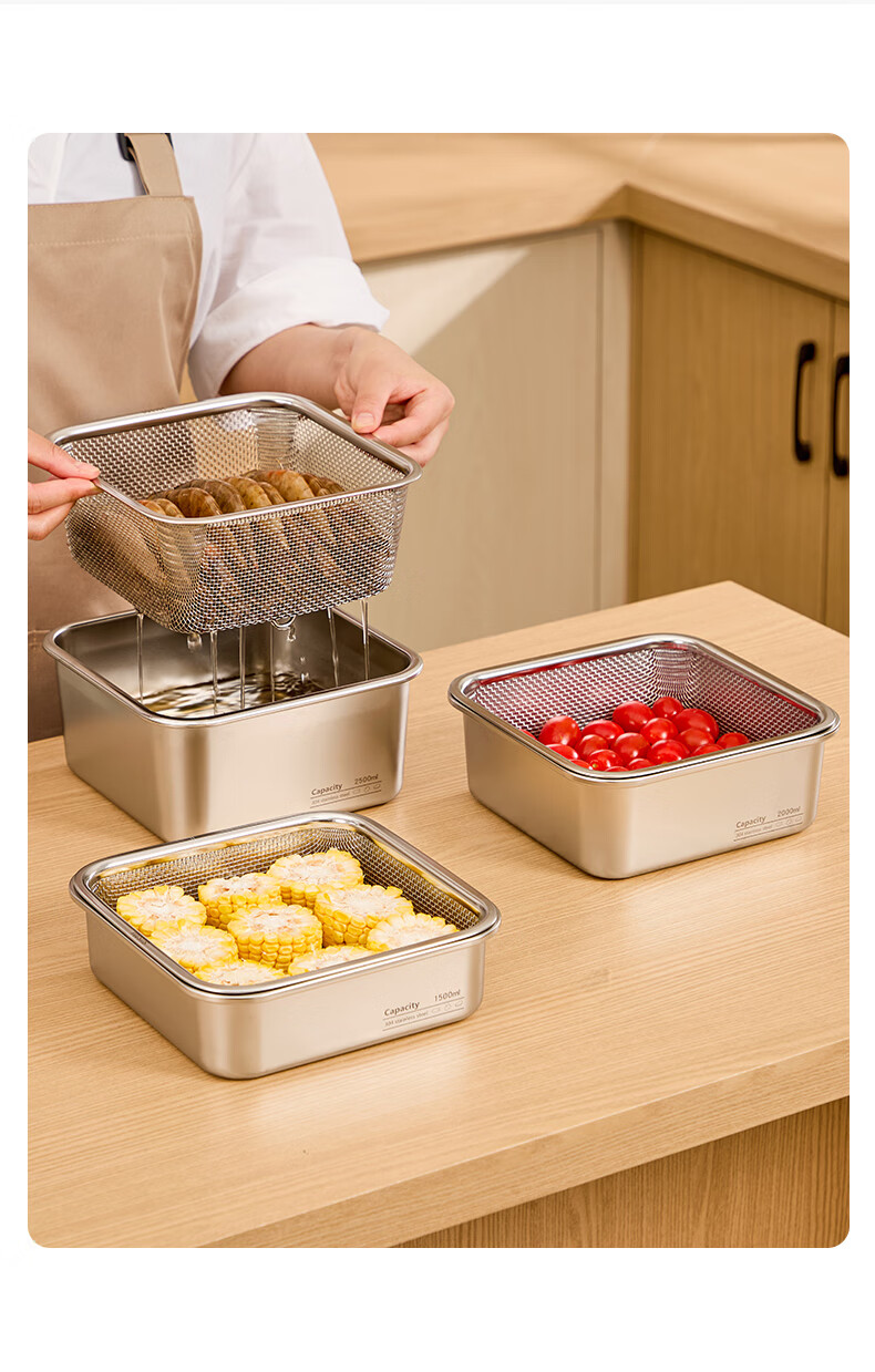 Shijanu stainless steel dish basin rectangular drain basket kitchen household vegetable preparation basin food grade thickened fruit washing drain basket family 1500ml 2000ml 2500ml