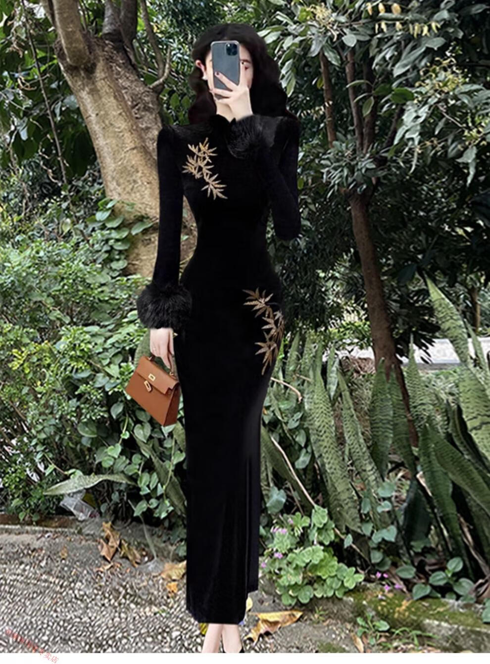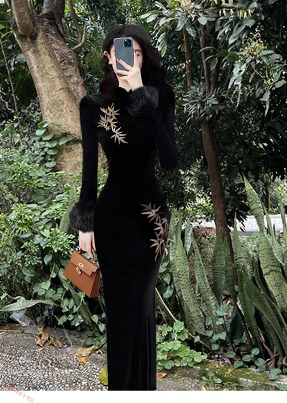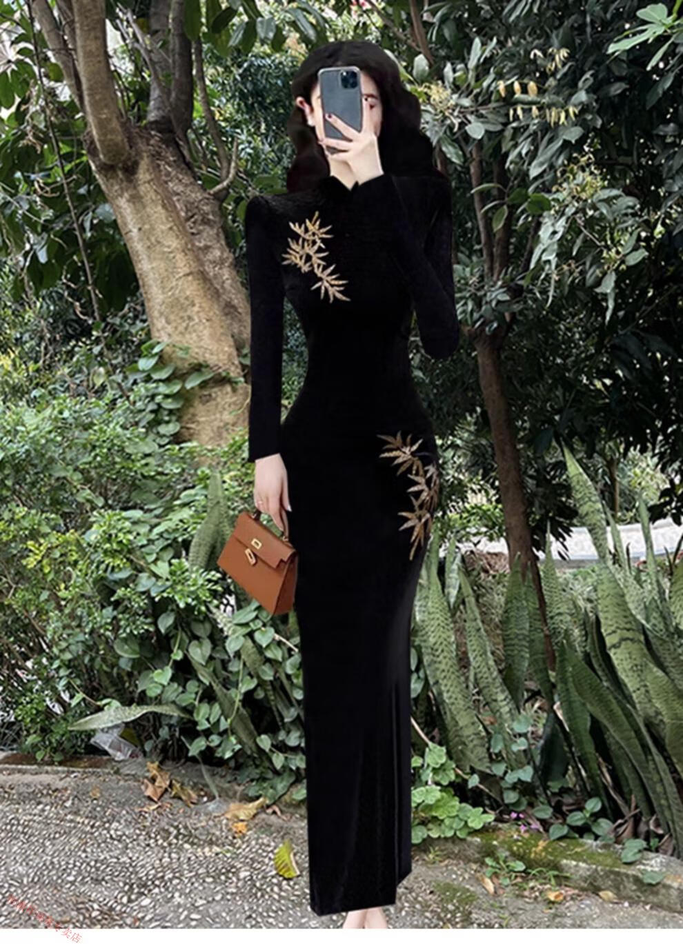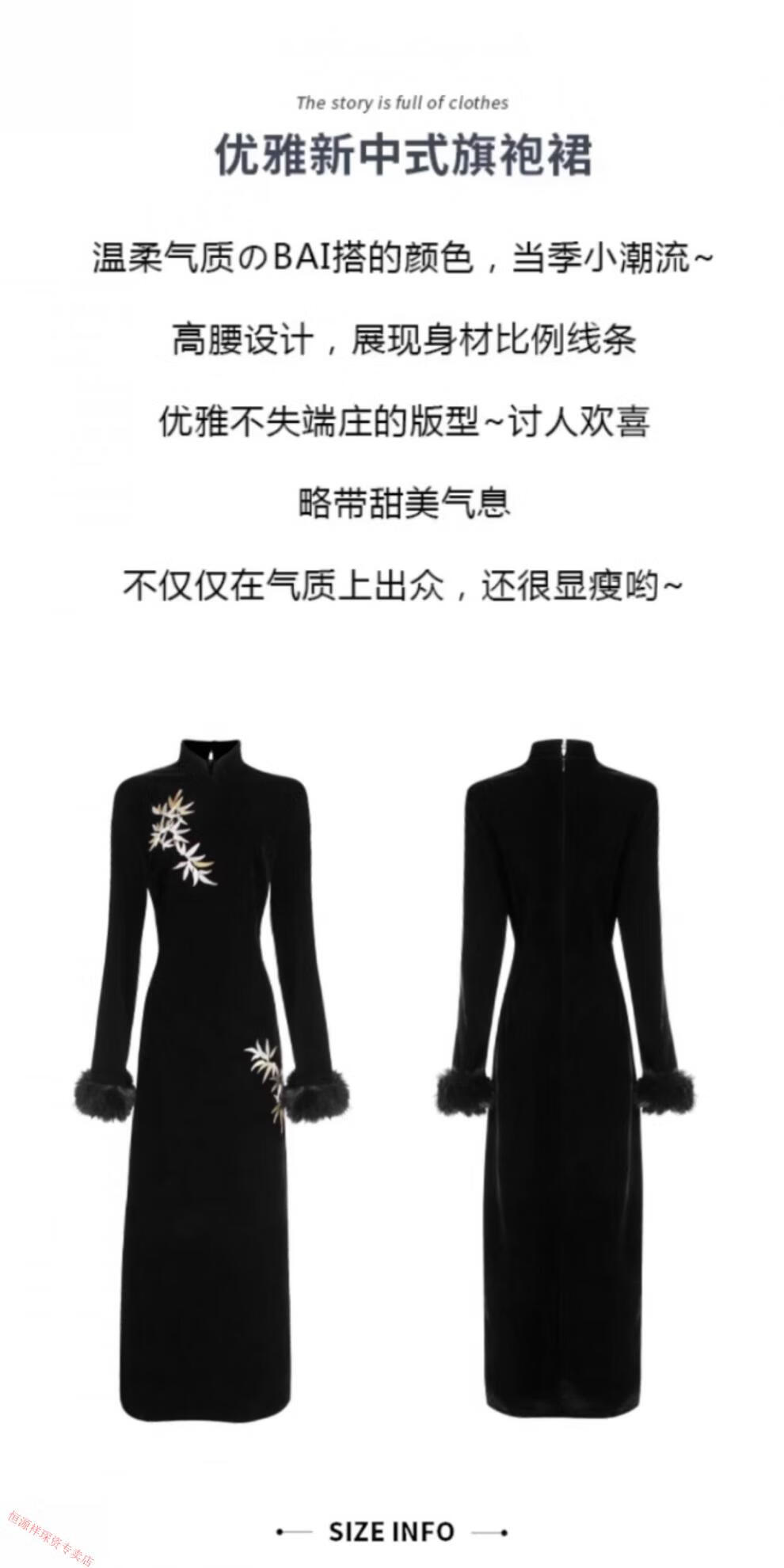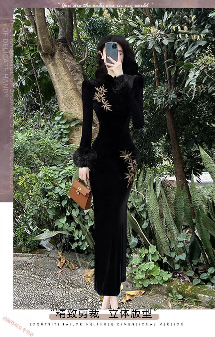 Hengyuan Xianggan 2025 autumn and winter new long-sleeved black cheongsam embroidered new Chinese style slim slit velvet long skirt black (removable fur sleeves) L