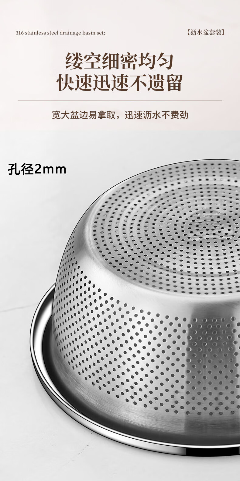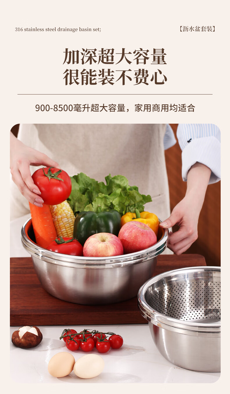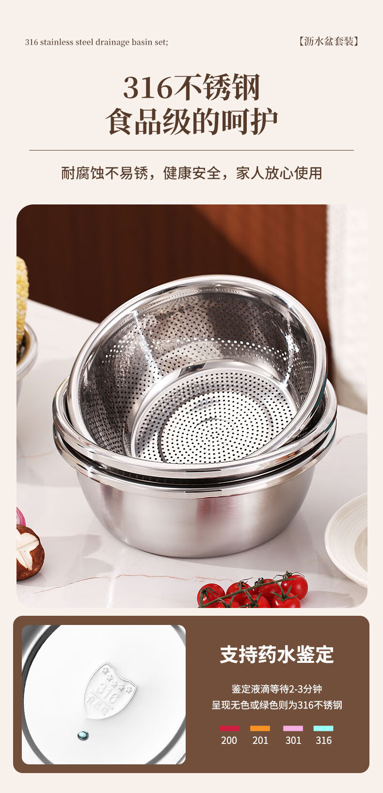 Zwilling German Seiko Extra Thick 316 Stainless Steel Basin and Basin Food Grade Drain Basket Washing Basin Egg Beating Kitchen Household 26CM Solid Basin + Leaky Basin 316L Steel - Extra Thick and Fall-resistant