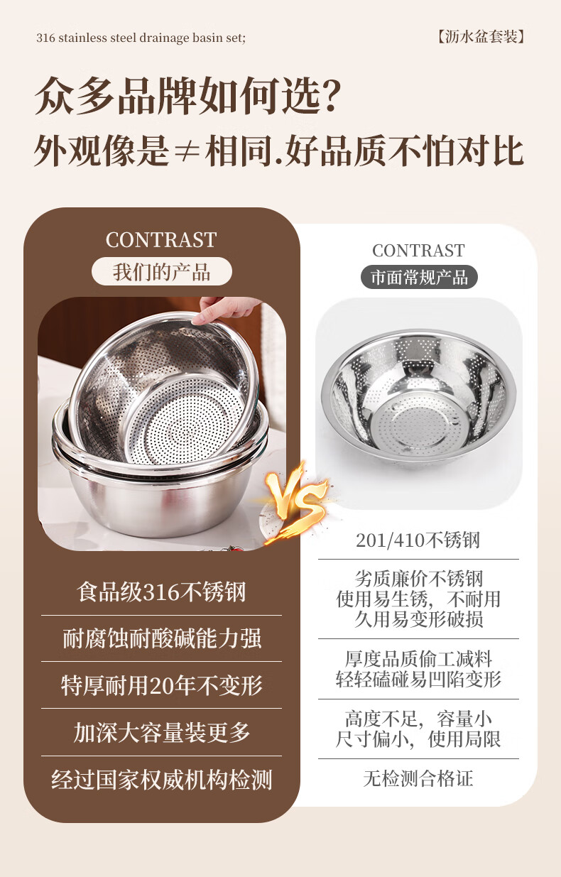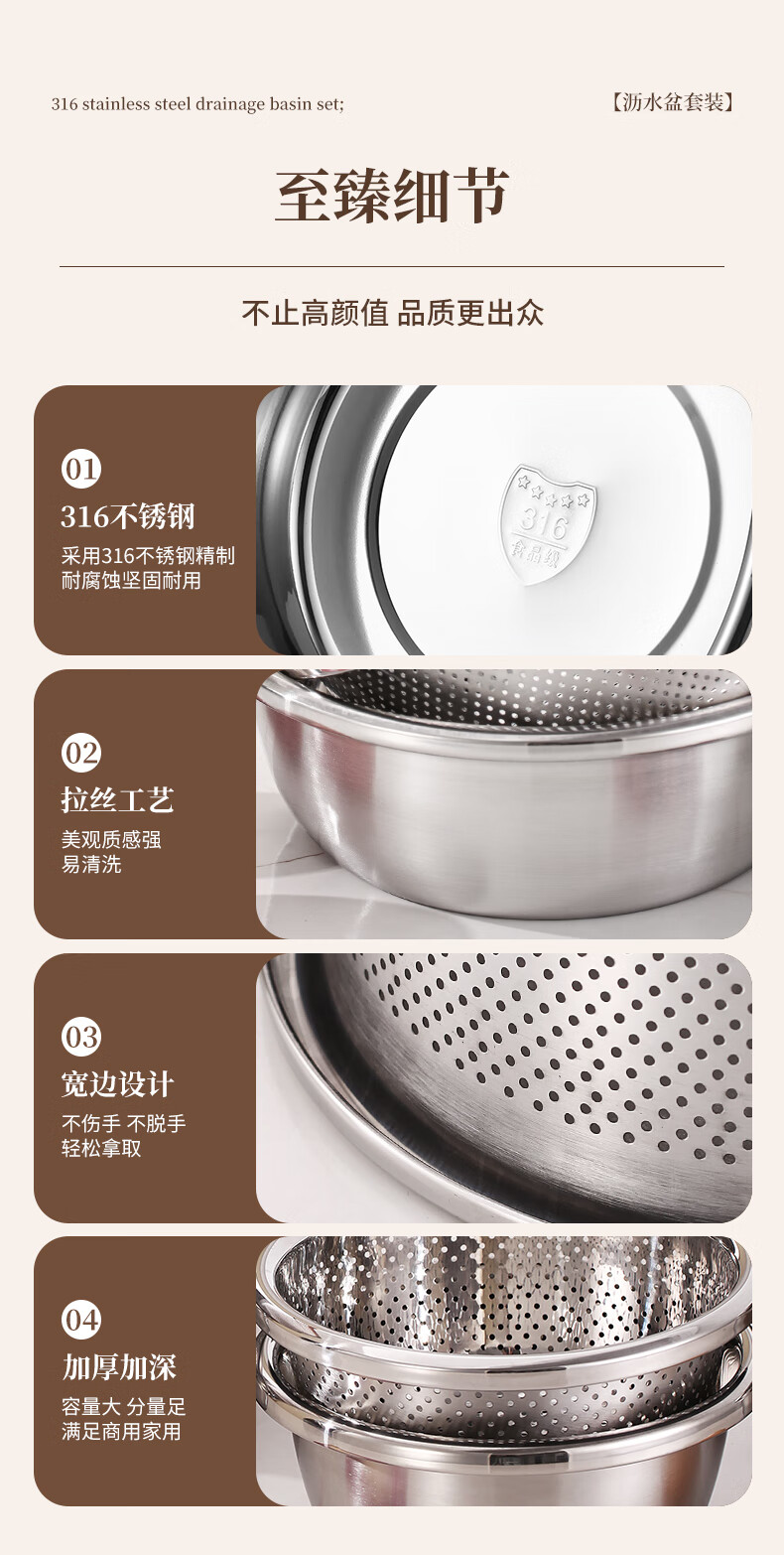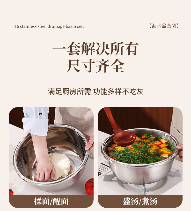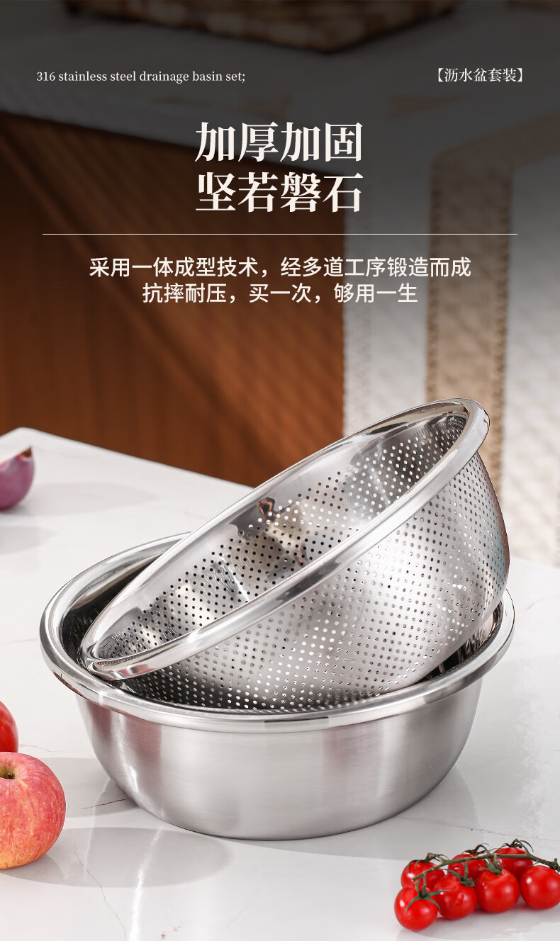 Zwilling German Seiko Extra Thick 316 Stainless Steel Basin and Basin Food Grade Drain Basket Washing Basin Egg Beating Kitchen Household 26CM Solid Basin + Leaky Basin 316L Steel - Extra Thick and Fall-resistant